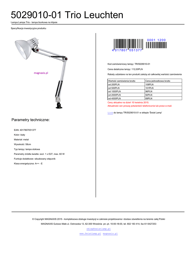 5029010-01 Trio Leuchten Lampa Lampa Trio - lampa biurkowa na klipsie Specyfikacja inwestycyjna produktu 0001 1200 4 017807 051377 Kod zamówieniowy lampy: TR/5029010-01 Cena detaliczna lampy: 112,00PLN Rabaty udzielane na ten produkt zależą od całkowitej wartości zamówienia Wartość zamówienia brutto Cena jednostkowa brutto od 200PLN 108PLN od 500PLN 101PLN od 1000PLN 96PLN od 2000PLN 92PLN od 4000PLN 89PLN Ceny aktualne na dzień 10 kwietnia 2015. Aktualność cen proszę potwierdzić telefonicznie lub przez e-mail. Link do lampy TR/5029010-01 w sklepie 'Świat Lamp' Parametry techniczne: EAN: 4017807051377 Kolor: biały Materiał: metal Wysokość: 58cm Typ lampy: lampa stołowa Parametry źródła światła: excl. 1 x E27, max. 60 W Funkcje dodatkowe: wbudowany włącznik Klasa energetyczna: A++ - E © Copyright MAGNAXIS 2015 - kompleksowa obsługa inwestycji w zakresie projektowania i dostaw oświetlenia na terenie całej Polski MAGNAXIS Gutowo Małe ul. Ostrowska 13, 62-300 Września pn.-pt. 10:00-18:00, tel. 602 183 414, fax 61 6427253 [email protected] www.SwiatLamp.pl magnaxis.pl