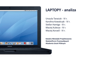 LAPTOPY - analiza Urszula Tarasiuk - IV r. Karolina Kowalczyk - IV r. Stefan Hamiga - III r. Maciej Kulesza - IV r. Maciej Korzeń - IV r. Katedra Metodyki Projektowania Wydział Form Przemysłowych Akademia Sztuk Pięknych Aspekt historyczny Aspekt technologiczny Aspekt techniczny 1 LAPTOP - czym jest - słowo laptop pochodzi od ang. słowa lap, które oznacza w języku polskim kolano - mały, przenośny komputer osobisty - przeważnie zbudowany jako pojedyncze, niewielkie, zamykane urządzenie, w którym znajdują się wszystkie podzespoły wewnętrzne, wybrane wejścia dla nośników, oraz urządzenia przeznaczone do komunikacji z użytkownikiem - posiada wewnętrzny akumulator (pozwalający na kilka godzin pracy bez napięcia sieciowego) oraz zewnętrzny zasilacz (umożliwiający pracę oraz ładowanie akumulatora z sieci elektrycznej; istnieją także ładowarki podłączane do gniazda zapalniczki w samochodzie i samolocie) - początkowo istniał umowny podział komputerów przenośnych - laptop (większy i cięższy) oraz notebook (mniejszy i łatwiejszy do przenoszenia), w chwili obecnej obydwa te określenia funkcjonują wymiennie W tej prezentacji słowa laptop i notebook są stosowane wymiennie (jako synonimy)! 2 Historia laptopów 1968 - DYNABOOK - inspiracja nowoczesnych komputerów przenośnych - zaprojektowany przez Alana Kay'a w 1968 roku, z założenia miał być osobistym komputerem dla dzieci w każdym wieku - Kay chciał stworzyć małe, osobiste urządzenie ważące niecały kilogram, z wyświetlaczem w rozmiarze przypominającym kartkę papieru - niestety, technologia umożliwiająca wyprodukowanie takiego urządzenia pojawiła się dopiero niedawno 3 Historia laptopów 1968 - PRZENOŚNY DALEKOPIS KSR-33 - przenośne urządzenie z interfejsem stworzone przez Teletype Corporation's - urządzenie to ważyło prawie 30 kg, ale pozwalało jego użytkownikowi na połączenie z maszyną, która umożliwiała przesyłanie różnego rodzaju wiadomości z jednego miejsca w drugie (nawet bardzo odległe) 4 Historia laptopów 1981 - OSBORNE 1 - pierwszy osobisty komputer - maszyna ważąca ponad 10kg, wyposażona w 5-calowy ekran - cena: 1795 dolarów 5 Historia laptopów 1981 - Epson HX-20 - uznawany za pierwszego prawdziwego notebooka - wyposażony w niklowo-kadmowy akumulator, monochromatyczny ekran LCD (120x32pxl), wbudowaną mikrokasetę, która pełniła funkcję dysku twardego, procesor Hitachi 6301, taktowany z częstotliwością 614Hz oraz 16KB pamięci RAM - ważył 1,5kg 6 Historia laptopów 1982 - GRID COMPAS 1100 - pierwsze urządzenie, które można było składać i wsuwać do specjalnej torby - komputer ten przypominał nieco z wyglądu nowoczesne laptopy - oryginalnie stworzony dla NASA, udostępniony do sprzedaży konsumentom w 1982 roku - posiadał 340 KB pamięci i kosztował 8000 dolarów 7 Historia laptopów 1985 - IBM PC Convertible - jako pierwszy na świecie przypominał znane nam obecnie laptopy - sprzedawane za kwotę ok. 2000 dolarów - nie posiadał dysku twardego (a jedynie dwie stacje dyskietek 3,5 cala o pojemności 720kb) i ważył 6 kg 8 Historia laptopów 1988 - Compaq SLT/286 - pierwszy komputer wyposażony w kartę graficzną VGA - urządzenie cechowało się dużą wagą (7 kg) i posiadało dysk twardy o pojemności 20 MB (z opcją rozbudowy do 40 MB), 10-calowy wyświetlacz oraz pracujący z zegarem 12 MHz procesor 9 Historia laptopów 1991 - Apple PowerBook 100 - w tym modelu projektanci Apple przesunęli klawiaturę nieco do tyłu, uzyskując w ten sposób miejsce na zamontowanie trackballa - dopiero Apple umieściło go w tak odpowiednim, poprawiającym komfort pracy miejscu 10 Historia laptopów 1992 - Grid Systems Convertible 2260 - wyposażony w procesor Intel 386 oraz monochromatyczny ekran dotykowy LCD 10,5-cala - na dotykowym wyświetlaczu można było pisać używając specjalnego rysika dołączonego do laptopa - pracował na systemie operacyjnym Windows for Pen 11 Historia laptopów 1992 - IBM ThinkPad - urządzenie pracowało pod kontrolą systemu Windows 3.1, posiadało dysk twardy o pojemności 120 MB, procesor 486SLC (25 MHz) oraz kolorowy 10,4-calowy panel TFT LCD - ThinkPady wyróżniały się nowym rozwiązaniem pozwalającym na poruszanie kursorem. Mowa tu o zaprojektowanym przez inżynierów IBM-a TrackPointcie, czyli umieszczonym pomiędzy przyciskami małym manipulatorze - dzięki niemu ręce użytkownika zawsze spoczywały na klawiaturze 12 Historia laptopów 1994 - DEC HiNote Ultra - pierwszy cienki i ultraprzenośny komputer - ważył niewiele ponad półtora kilograma - utorował drogę dzisiejszym laptopom - wyposażony w monochromatyczny wyświetlacz 11,1 cala, 4MB pamięci RAM oraz wbudowany dysk twardy o pojemności 340MB, głośniki, port IRDA, system operacyjny Windows for Workgroups 3.11 oraz program do obsługi Internetu 13 Historia laptopów 1994 - Apple PowerBook 520 - pierwszy komputer przenośny, w którym zastosowano tzw. touchpad, opracowany przez wynalazcę George'a E. Gerpheide'a w 1987 r. - rozwiązanie to okazało się najpopularniejszym substytutem myszy montowanym w notebookach - podstawowa konfiguracja komputerów to 4 MB pamięci RAM (z możliwością rozbudowy do 36 MB), 25-megahercowy procesor oraz 9,5-calowy monochromatyczny wyświetlacz i dysk twardy o pojemności sięgającej 320 MB 14 Historia laptopów 1994 - Toshiba Portege T3400 - pierwszy komputer przenośny wykorzystujący baterię litowo-jonową - w porównaniu do wcześniej stosowanych niklowo-kadmowych baterie litowo-jonowe: - wystarczały na dłużej (w opisywanym przypadku pozwalały nawet na 6 godzin pracy) - ważyły mniej - były praktycznie bezobsługowe - stosowane do dziś w niemal niezmienionej formie 15 Historia laptopów 1999 - Apple iBook G3 - jedna z wielu innowacyjnych idei jakie przyniósł ze sobą Steve Jobs, kiedy powrócił do Apple w 1996 roku - jako pierwszy w ofercie Apple posiadał możliwość połączen