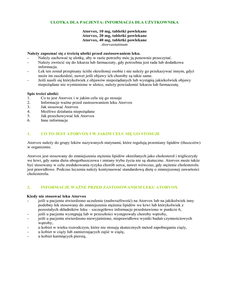 ULOTKA DLA PACJENTA: INFORMACJA DLA UŻYTKOWNIKA Atorvox, 10 mg, tabletki powlekane Atorvox, 20 mg, tabletki powlekane Atorvox, 40 mg, tabletki powlekane Atorvastatinum Należy zapoznać się z treścią ulotki przed zastosowaniem leku. Należy zachować tę ulotkę, aby w razie potrzeby móc ją ponownie przeczytać. Należy zwrócić się do lekarza lub farmaceuty, gdy potrzebna jest rada lub dodatkowa informacja. Lek ten został przepisany ściśle określonej osobie i nie należy go przekazywać innym, gdyż może im zaszkodzić, nawet jeśli objawy ich choroby są takie same. Jeśli nasili się którykolwiek z objawów niepożądanych lub wystąpią jakiekolwiek objawy niepożądane nie wymienione w ulotce, należy powiadomić lekarza lub farmaceutę. Spis treści ulotki: 1. Co to jest Atorvox i w jakim celu się go stosuje 2. Informacje ważne przed zastosowaniem leku Atorvox 3. Jak stosować Atorvox 4. Możliwe działania niepożądane 5. Jak przechowywać lek Atorvox 6. Inne informacje 1. CO TO JEST ATORVOX I W JAKIM CELU SIĘ GO STOSUJE Atorvox należy do grupy leków nazywanych statynami, które regulują przemiany lipidów (tłuszczów) w organizmie. Atorvox jest stosowany do zmniejszenia stężenia lipidów określanych jako cholesterol i triglicerydy we krwi, gdy sama dieta ubogotłuszczowa i zmiany trybu życia nie są skuteczne. Atorvox może także być stosowany w celu zredukowania ryzyka chorób serca, nawet wówczas, gdy stężenie cholesterolu jest prawidłowe. Podczas leczenia należy kontynuować standardową dietę o zmniejszonej zawartości cholesterolu. 2. INFORMACJE WAŻNE PRZED ZASTOSOWANIEM LEKU ATORVOX Kiedy nie stosować leku Atorvox jeśli u pacjenta stwierdzono uczulenie (nadwrażliwość) na Atorvox lub na jakikolwiek inny podobny lek stosowany do zmniejszenia stężenia lipidów we krwi lub którykolwiek z pozostałych składników leku – szczegółowe informacje przedstawiono w punkcie 6, jeśli u pacjenta występują lub w przeszłości występowały choroby wątroby, jeśli u pacjenta stwierdzono niewyjaśnione, nieprawidłowe wyniki badań czynnościowych wątroby, u kobiet w wieku rozrodczym, które nie stosują skutecznych metod zapobiegania ciąży, u kobiet w ciąży lub zamierzających zajść w ciążę, u kobiet karmiących piersią, Kiedy zachować szczególną ostrożność stosując Atorvox: Poniżej wymieniono powody dla których lek Atorvox może być nieodpowiedni dla pacjenta w przypadku wystąpienia udaru z krwawieniem do mózgu, lub gdy w mózgu znajduje się niewielka ilość płynu z poprzedniego udaru w przypadku problemów z nerkami, w przypadku niedoczynności tarczycy, w przypadku powtarzających się lub niewyjaśnionych bólów mięśni bądź problemów z mięśniami w przeszłości lub podobnych problemów u osób spokrewnionych, w przypadku problemów z mięśniami podczas stosowanego w przeszłości leczenia innymi lekami obniżającymi stężenie lipidów (np. innymi statynami lub fibratami), w przypadku regularnego spożywania alkoholu w dużych ilościach, w przypadku chorób wątroby, u pacjentów w wieku powyżej 70 lat. Należy skontaktować się z lekarzem lub farmaceutą przed zastosowaniem leku Atorvox: - w przypadku ciężkiej niewydolności oddechowej U pacjentów, których dotyczą którekolwiek z powyższych sytuacji, lekarz zleci wykonanie badania krwi przed rozpoczęciem leczenia lekiem Atorvox oraz w miarę możliwości podczas leczenia w celu monitorowania ryzyka działań niepożądanych dotyczących mięśni. Wiadomo, że ryzyko wystąpienia działań niepożądanych dotyczących mięśni np. rabdomiolizy jest większe, gdy jednocześnie stosowane są pewne leki (patrz punkt 2 „Stosowanie leku Atorvox z innymi lekami”). Stosowanie leku Atorvox z innymi lekami Niektóre leki mogą zmieniać działanie leku Atorvox, lub wpływ tych leków na organizm może być zmieniony przez lek Atorvox. Ten typ interakcji może powodować mniejszą skuteczność jednego lub obu leków. Jednocześnie może on zwiększać ryzyko wystąpienia ciężkich działań niepożądanych w tym poważne uszkodzenia mięśni znane jako rabdomioliza, opisane w punkcie 4: leki modyfikujące działanie układu odpornościowego, np. cyklosporyna, niektóre antybiotyki i leki przeciwgrzybicze, np. erytromycyna, klarytromycyna, telitromycyna, ketokonazol, itrakonazol, worikonazol, flukonazol, pozakonazol, ryfampicyna, kwas fusydowy inne leki regulujące stężenie lipidów, np. gemfibrozyl, inne fibraty, kolestypol, niektóre blokery kanału wapniowego stosowane w dławicy piersiowej lub nadciśnieniu tętniczym, np. amlodipina, diltiazem; a także leki regulujące rytm serca, np. digoksyna, werapamil, amiodaron leki stosowane w leczeniu zakażenia wirusem HIV, np.: rytonawir, lopinawir, atazanawir, indynawir, darunawir, itd. do innych leków, o których wiadomo, że wykazują interakcje z lekiem Atorvox należy ezetymib (który obniża stężenie cholesterolu) warfaryna (która zmniejsza krzepliwość krwi), doustne środki antykoncepcyjne, stiripentol (lek przeciwdrgawkowy stosowany w leczeniu padaczki), cymetydyna (stosowana w leczeniu zgagi i wrzodów żołądka), fenazon (środek przeciwbólowy) oraz leki zobojętniające kwas żołądkowy (leki stosowane w niestrawności, zawierające glin lub magnez). leki dostępne bez recepty: ziele dziurawca Należy powiedzieć lekarzowi o wszystkich przyjmowanych ostatnio lekach, również tych, które wydawane są bez recepty. Stosowanie leku Atorvox z jedzeniem i piciem Informacja na temat stosowania leku Atorvox znajduje się w punkcie 3. Należy jednak zwrócić uwagę na poniższe informacje: Sok grejpfrutowy Nie należy spożywać więcej niż jedną lub dwie małe szklanki soku grejpfrutowego dziennie, gdyż większe ilości soku grejpfrutowego mogą zmieniać działanie leku Atorvox. Alkohol Podczas przyjmowania opisywanego leku należy unikać spożywania nadmiernej ilości alkoho