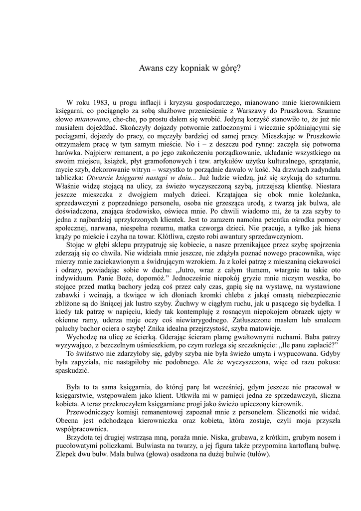 Awans czy kopniak w górę? W roku 1983, u progu inflacji i kryzysu gospodarczego, mianowano mnie kierownikiem księgarni, co pociągnęło za sobą służbowe przeniesienie z Warszawy do Pruszkowa. Szumne słowo mianowano, che-che, po prostu dałem się wrobić. Jedyną korzyść stanowiło to, że już nie musiałem dojeżdżać. Skończyły dojazdy potwornie zatłoczonymi i wiecznie spóźniającymi się pociągami, dojazdy do pracy, co męczyły bardziej od samej pracy. Mieszkając w Pruszkowie otrzymałem pracę w tym samym mieście. No i – z deszczu pod rynnę: zaczęła się potworna harówka. Najpierw remanent, a po jego zakończeniu porządkowanie, układanie wszystkiego na swoim miejscu, książek, płyt gramofonowych i tzw. artykułów użytku kulturalnego, sprzątanie, mycie szyb, dekorowanie witryn – wszystko to porządnie dawało w kość. Na drzwiach zadyndała tabliczka: Otwarcie księgarni nastąpi w dniu... Już ludzie wiedzą, już się szykują do szturmu. Właśnie widzę stojącą na ulicy, za świeżo wyczyszczoną szybą, jutrzejszą klientkę. Niestara jeszcze mieszczka z dwojgiem małych dzieci. Krzątająca się obok mnie koleżanka, sprzedawczyni z poprzedniego personelu, osoba nie grzesząca urodą, z twarzą jak bulwa, ale doświadczona, znająca środowisko, oświeca mnie. Po chwili wiadomo mi, że ta zza szyby to jedna z najbardziej uprzykrzonych klientek. Jest to zarazem namolna petentka ośrodka pomocy społecznej, narwana, niespełna rozumu, matka czworga dzieci. Nie pracuje, a tylko jak hiena krąży po mieście i czyha na towar. Kłótliwa, często robi awantury sprzedawczyniom. Stojąc w głębi sklepu przypatruję się kobiecie, a nasze przenikające przez szybę spojrzenia zderzają się co chwila. Nie widziała mnie jeszcze, nie zdążyła poznać nowego pracownika, więc mierzy mnie zaciekawionym a świdrującym wzrokiem. Ja z kolei patrzę z mieszaniną ciekawości i odrazy, powiadając sobie w duchu: „Jutro, wraz z całym tłumem, wtargnie tu takie oto indywiduum. Panie Boże, dopomóż.” Jednocześnie niepokój gryzie mnie niczym weszka, bo stojące przed matką bachory jedzą coś przez cały czas, gapią się na wystawę, na wystawione zabawki i wcinają, a tkwiące w ich dłoniach kromki chleba z jakąś omastą niebezpiecznie zbliżone są do lśniącej jak lustro szyby. Żuchwy w ciągłym ruchu, jak u pasącego się bydełka. I kiedy tak patrzę w napięciu, kiedy tak kontempluję z rosnącym niepokojem obrazek ujęty w okienne ramy, uderza moje oczy coś niewiarygodnego. Zatłuszczone masłem lub smalcem paluchy bachor ociera o szybę! Znika idealna przejrzystość, szyba matowieje. Wychodzę na ulicę ze ścierką. Gderając ścieram plamę gwałtownymi ruchami. Baba patrzy wyzywająco, z bezczelnym uśmieszkiem, po czym rozlega się szczeknięcie: „Ile panu zapłacić?” To świństwo nie zdarzyłoby się, gdyby szyba nie była świeżo umyta i wypucowana. Gdyby była zapyziała, nie nastąpiłoby nic podobnego. Ale że wyczyszczona, więc od razu pokusa: spaskudzić. Była to ta sama księgarnia, do której parę lat wcześniej, gdym jeszcze nie pracował w księgarstwie, wstępowałem jako klient. Utkwiła mi w pamięci jedna ze sprzedawczyń, śliczna kobieta. A teraz przekroczyłem księgarniane progi jako świeżo upieczony kierownik. Przewodniczący komisji remanentowej zapoznał mnie z personelem. Ślicznotki nie widać. Obecna jest odchodząca kierowniczka oraz kobieta, która zostaje, czyli moja przyszła współpracownica. Brzydota tej drugiej wstrząsa mną, poraża mnie. Niska, grubawa, z krótkim, grubym nosem i pucołowatymi policzkami. Bulwiasta na twarzy, a jej figura także przypomina kartoflaną bulwę. Zlepek dwu bulw. Mała bulwa (głowa) osadzona na dużej bulwie (tułów). Natomiast ślicznotka przebywa na zwolnieniu lekarskim. Ona, jak się okazuje, dużo opuszcza. Powoli zagłębiam się w panujące tutaj stosunki. Obie one, bulwa i ślicznotka, mają z sobą na pieńku. Bulwa wiesza psy na nieobecnej. Wreszcie przychodzi moment, gdy się jej, bulwie, wydaje, iż wystarczająco nabruździła rywalce, i stawia wszystko na jedną kartę. – Ja nie chcę z nią pracować – oświadcza mi oficjalnie. Jest to coś w rodzaju ultimatum: ona albo ja. Niech kierownik wybiera. Rzeczywiście, trzeba mi wybierać. Muszę się zdecydować, z kim będę pracował, z bulwą czy ze ślicznotką. Wahanie, bicie się z myślami. Przypomina mi się raptem niedawny incydent z poplamieniem szyby i to zdecydowało. „Przyjdziesz na gotowe, sprytna ślicznotko, śliczna spryciaro, wylądujesz w pomieszczeniu z wypolerowanymi szybami, zjawisz się w chwili, gdy wszystko będzie już zapięte jeśli nie na ostatni, to na przedostatni guzik, nie, nie ma tak dobrze.” Kiedy po wykorzystaniu zwolnienia ślicznotka zjawiła się w księgarni, sprawa była już przesądzona. Trwał jeszcze remanent, pracowaliśmy przy zamkniętych drzwiach. Przebrawszy się w roboczy fartuch ślicznotka podeszła do mnie z pytaniem: – Co mam robić, panie kierowniku? Oznajmiłem jej o swoim postanowieniu. Jest oddana do dyspozycji dyrekcji. Tu, w tej księgarni, pracować nie będzie. – Pani za dużo opuszcza – uzasadniłem swoją personalną decyzję. – Ale – nie poddawała się ślicznotka – może teraz już nie będę opuszczać... Do rozmowy wtrąciła się bulwa i po chwili obie kobiety skoczyły sobie do oczu. Usłyszałem skierowane do bulwy słowa ślicznotki: „Już nawet zdążyła pani nowego kierownika podjudzić przeciwko mnie!” Nie musiałem brać udziału w burzliwej polemice i spokojnie odszedłem na bok.