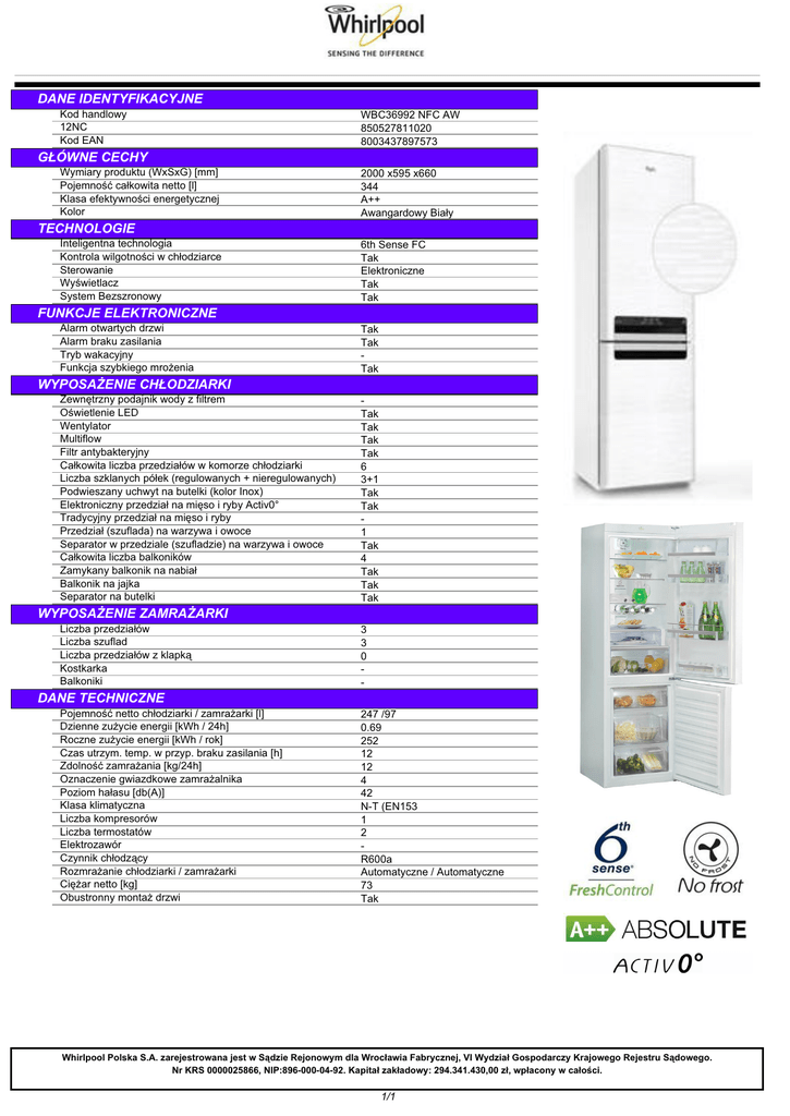 DANE IDENTYFIKACYJNE Kod handlowy 12NC Kod EAN WBC36992 NFC AW 850527811020 8003437897573 GŁÓWNE CECHY Wymiary produktu (WxSxG) [mm] Pojemność całkowita netto [l] Klasa efektywności energetycznej Kolor 2000 x595 x660 344 A++ Awangardowy Biały TECHNOLOGIE Inteligentna technologia Kontrola wilgotności w chłodziarce Sterowanie Wyświetlacz System Bezszronowy 6th Sense FC Tak Elektroniczne Tak Tak FUNKCJE ELEKTRONICZNE Alarm otwartych drzwi Alarm braku zasilania Tryb wakacyjny Funkcja szybkiego mrożenia Tak Tak Tak WYPOSAŻENIE CHŁODZIARKI Zewnętrzny podajnik wody z filtrem Oświetlenie LED Wentylator Multiflow Filtr antybakteryjny Całkowita liczba przedziałów w komorze chłodziarki Liczba szklanych półek (regulowanych + nieregulowanych) Podwieszany uchwyt na butelki (kolor Inox) Elektroniczny przedział na mięso i ryby Activ0° Tradycyjny przedział na mięso i ryby Przedział (szuflada) na warzywa i owoce Separator w przedziale (szufladzie) na warzywa i owoce Całkowita liczba balkoników Zamykany balkonik na nabiał Balkonik na jajka Separator na butelki Tak Tak Tak Tak 6 3+1 Tak Tak 1 Tak 4 Tak Tak Tak WYPOSAŻENIE ZAMRAŻARKI Liczba przedziałów Liczba szuflad Liczba przedziałów z klapką Kostkarka Balkoniki 3 3 0 - DANE TECHNICZNE Pojemność netto chłodziarki / zamrażarki [l] Dzienne zużycie energii [kWh / 24h] Roczne zużycie energii [kWh / rok] Czas utrzym. temp. w przyp. braku zasilania [h] Zdolność zamrażania [kg/24h] Oznaczenie gwiazdkowe zamrażalnika Poziom hałasu [db(A)] Klasa klimatyczna Liczba kompresorów Liczba termostatów Elektrozawór Czynnik chłodzący Rozmrażanie chłodziarki / zamrażarki Ciężar netto [kg] Obustronny montaż drzwi 247 /97 0.69 252 12 12 4 42 N-T (EN153 1 2 R600a Automatyczne / Automatyczne 73 Tak Whirlpool Polska S.A. zarejestrowana jest w Sądzie Rejonowym dla Wrocławia Fabrycznej, VI Wydział Gospodarczy Krajowego Rejestru Sądowego. Nr KRS 0000025866, NIP:896-000-04-92. Kapitał zakładowy: 294.341.430,00 zł, wpłacony w całości. 1/1