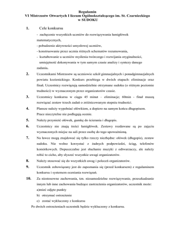 Regulamin VI Mistrzostw Otwartych I liceum Ogólnokształcącego im. St. Czarnieckiego w SUDOKU 1. Cele konkursu - zachęcenie wszystkich uczniów do rozwiązywania łamigłówek matematycznych, - pobudzenie aktywności umysłowej uczniów, - konstruowanie przez ucznia różnych schematów rozumowania, - kształtowanie u uczniów myślenia twórczego i rozwijania oryginalności, umiejętność dokonywania w tym samym czasie analizy i syntezy danego zadania. Uczestnikami Mistrzostw są uczniowie szkół gimnazjalnych i ponadgimnazjalnych 2. powiatu kozienickiego. Konkurs przebiega w dwóch etapach: eliminacje oraz finał. Uczestnicy rozwiązują samodzielnie otrzymane sudoku (o różnym poziomie trudności) w wyznaczonym przez organizatorów czasie. Uczestnicy konkursu w ciągu 45 minut – eliminacje; 60min - finał muszą 3. rozwiązać zestaw trzech zadań o zróżnicowanym stopniu trudności. Plansze należy wypełniać ołówkiem, a dopiero na samym końcu długopisem. 4. Prace nieczytelne nie podlegają ocenie. 5. Należy przynieść ołówek, gumkę do ścierania i długopis. 6. Uczestnicy nie znają treści łamigłówek. Zestawy rozdawane są po zajęciu wyznaczonych miejsc na sali przez osobę do tego upoważnioną. Na ławce mogą znajdować się tylko rzeczy niezbędne: ołówek (długopis), zestaw 7. sudoku. Nie wolno korzystać z żadnych podpowiedzi, ściąg, telefonów komórkowych. Dopuszczalne jest słuchanie muzyki z odtwarzaczy, ale należy robić to cicho, aby słyszeć wszystkie uwagi organizatorów. 8. Należy stosować się do wszystkich uwag i poleceń organizatorów. 9. Uczestnik zobowiązany jest do zapoznania się (przed konkursem) z regulaminem konkursu i systemem oceniania rozwiązań. 10. Za niestosowne zachowania, tzn. niesamodzielne rozwiązywanie, przeszkadzanie innym lub inne zachowania budzące zastrzeżenia organizatorów, uczestnik może: a)mieć odjęte punkty b) otrzymać ostrzeżenie c) zostać wykluczony z konkursu Po dwóch ostrzeżeniach uczestnik będzie wykluczony z konkursu. 11. ETAPY KONKURSU łamigłówki Etap czas trwania 3 – różny stopień trudności(łatwy, średni, trudny) I-eliminacje 45 min 3– różny stopień trudności(średni, II-finał trudny, bardzo trudny) 60 min 12.Uczestnik ma prawo przed upływem wyznaczonego czasu oddać pracę. Sygnalizuje to poprzez podniesienie ręki. 13.Jeżeli wszyscy uczestnicy skończą przed czasem, etap dobiega końca. 14. Do finału dostaje się pięciu uczestników mistrzostw z największą ilością punktów. 15.O zwycięstwie decyduje ilość punktów uzyskanych we wszystkich etapach konkursu. 16. Jeśli uczestnicy eliminacji lub finału będą mieć tę samą ilość punktów przewidziana jest dogrywka. 17. SYSTEM OCENIANIA Zadania będą punktowane w następujący sposób: I etap Łatwe - 1pkt, Średnie - 2pkt, Trudne - 3pkt Średnie - 2pkt, Trudne - 3pkt, Bardzo trudne - 4pkt II etap za poprawne wpisanie każdej brakującej cyfry (np.: jeśli w łatwej planszy brakuje 30 cyfr, uczeń może otrzymać 30pkt., za to samo w planszy średniej 60pkt, a w planszy trudnej 90pkt., bardzo trudnej 120pkt). Jeśli uczeń rozwiąże łatwe zadanie bezbłędnie otrzymuje bonus w postaci 10 punktów, odpowiednio średnie zadanie – 20 punktów, trudne zadanie – 30 punktów. Ponadto za rozwiązanie poprawnie zestawu przed czasem uczeń otrzymuje 1 punkt za każdą minutę(np. zakończy pracę po 40 min otrzymuje dodatkowo 5 pkt oczywiście gdy wszystkie zadania są dobrze rozwiązane). Pięć osób z najlepszymi wynikami przechodzi do finału. Pola nieczytelnie wypełnione będą liczone jako błąd. 18. Jak rozwiązywać SUDOKU? Rozwiązanie SUDOKU polega na wpisaniu do diagramu brakujących cyfr w taki sposób, aby w każdym poziomym rzędzie i w każdej pionowej kolumnie oraz w każdym małym kwadracie 3x3 kratki ( o pogrubionych bokach ) znalazły się wszystkie cyfry od 1 do 9. Każda z cyfr w rzędzie, w kolumnie czy w małym kwadracie może być wpisana tylko raz. Niby nic szczególnego, a jednak układanka ta jest naprawdę niezwykle pasjonująca. Przekonał się o tym każdy, kto choć raz spróbował wypełnić magiczny diagram SUDOKU. A oto kilka praktycznych wskazówek jak rozwiązywać SUDOKU: Na początku wybierz jedną z cyfr i spróbuj znaleźć dla niej właściwe miejsca w całym diagramie SUDOKU. Każda z cyfr występuje w diagramie dokładnie 9 razy. Możesz zacząć od wpisywania cyfr 1. Następnie 2, potem 3, aż do 9. Możesz też rozpocząć od uzupełniania cyfr, których pierwotnie ujawniono najwięcej, np.: gdy w diagramie SUDOKU cyfra 2 występuje sześciokrotnie, to pozostały Ci di wpisania tylko trzy dwójki Wpisuj cyfrę tylko wtedy, gdy masz pewność, że znalazłeś dla niej właściwe miejsce. Jeśli nie masz takiej pewności przejdź do wpisywania kolejnej cyfry. Poprzednią cyfrę może uda Ci się wpisać później, gdy uzupełnisz nieco więcej kratek w diagramie SUDOKU. Gdy zostały wpisane już wszystkie pewne cyfry, ale nie udało Ci się wypełnić całego diagramu SUDOKU staraj się dopełniać rzędy lub kolumny, albo małe kwadraty 3x3 kratki, w których pozostało najmniej pustych miejsc.