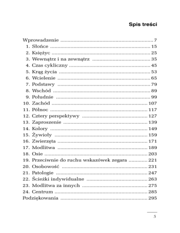 Spis treści Wprowadzenie ................................................................ 7 1. Słońce ..................................................................... 15 2. Księżyc .................................................................... 25 3. Wewnątrz i na zewnątrz ........................................ 35 4. Czas cykliczny ........................................................ 45 5. Krąg życia ............................................................... 53 6. Wcielenie ................................................................ 65 7. Podstawy ................................................................ 79 8. Wschód ................................................................... 89 9. Południe ................................................................. 99 10. Zachód .................................................................. 107 11. Północ ................................................................... 117 12. Cztery perspektywy ............................................. 127 13. Zaproszenie .......................................................... 139 14. Kolory ................................................................... 149 15. Żywioły ................................................................ 159 16. Zwierzęta .............................................................. 171 17. Modlitwa .............................................................. 189 18. Osie ....................................................................... 203 19. Przeciwnie do ruchu wskazówek zegara ............. 221 20. Osobowość ........................................................... 231 21. Patologie ............................................................... 247 22. Ścieżki indywidualne .......................................... 263 23. Modlitwa za innych ............................................. 275 24. Centrum ................................................................ 285 Podziękowania ............................................................ 295 5