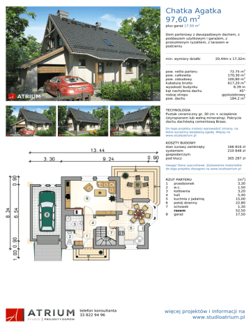 Chatka Agatka 97,60 m2 plus garaż 17.50 m2 Dom parterowy z dwuspadowym dachem, z poddaszem użytkowym i garażem, z przeszklonym ryzalitem, z tarasem w podcieniu min. wymiary działki pow. netto parteru pow. całkowita pow. zabudowy kubatura brutto wysokość budynku kąt nachylenia dachu rodzaj stropu pow. dachu 20,44m x 17,32m 72.75 m2 170,30 m2 100,80 m2 617,20 m3 8.39 m 45° gęstożebrowy 184.2 m2 TECHNOLOGIA Pustak ceramiczny gr. 30 cm + ocieplenie (styropianem lub wełną mineralną). Pokrycie dachu dachówką cementową Braas. Do tego projektu możesz wprowadzić zmiany, na które wyrazimy bezpłatną zgodę. Więcej na www.studioatrium.pl KOSZTY BUDOWY stan surowy zamknięty systemem gospodarczym pod klucz 166 816 zł 210 648 zł 305 287 zł Uwaga! Dane szacunkowe. Zestawienie materiałów do tego projektu dostępne na www.studioatrium.pl RZUT PARTERU 1 przedsionek 2 w.c. 3 kotłownia 4 hall 5 kuchnia z jadalnią 6 pokój dzienny 7 schowek razem 8 garaż telefon konsultanta 33 822 94 96 [m2] 3,30 1,50 3,20 5,40 15,00 22,80 1,30 52,50 17,50 więcej projektów i informacji na www.studioatrium.pl RZUT PODDASZA 1 hall 2 łazienka 3 pokój 4 pokój 5 pokój razem telefon konsultanta 33 822 94 96 Powered by TCPDF (www.tcpdf.org) [m2] 2,50 8,40 13,40 12,20 8,60 45,10 więcej projektów i informacji na www.studioatrium.pl