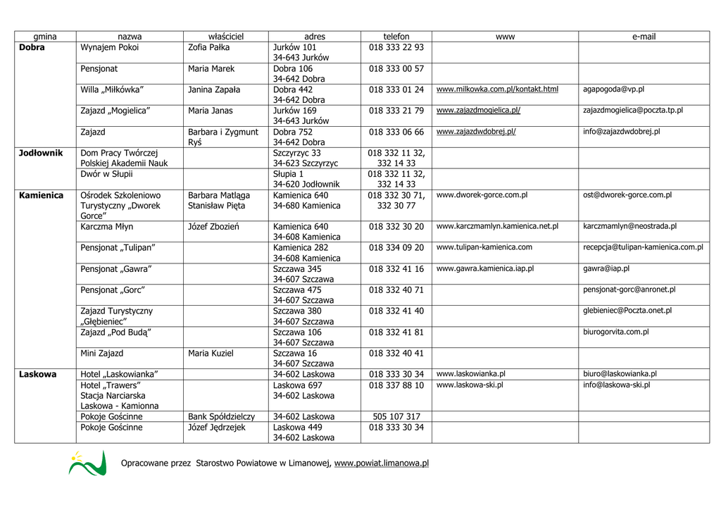 gmina Dobra nazwa Wynajem Pokoi właściciel Zofia Pałka Pensjonat Maria Marek Willa „Miłkówka” Janina Zapała Zajazd „Mogielica” Maria Janas Zajazd Barbara i Zygmunt Ryś Jodłownik Dom Pracy Twórczej Polskiej Akademii Nauk Dwór w Słupii Kamienica Ośrodek Szkoleniowo Turystyczny „Dworek Gorce” Karczma Młyn Barbara Matląga Stanisław Pięta Józef Zbozień Pensjonat „Tulipan” Pensjonat „Gawra” Pensjonat „Gorc” Zajazd Turystyczny „Głębieniec” Zajazd „Pod Budą” Mini Zajazd Laskowa Hotel „Laskowianka” Hotel „Trawers” Stacja Narciarska Laskowa - Kamionna Pokoje Gościnne Pokoje Gościnne Maria Kuziel Bank Spółdzielczy Józef Jędrzejek adres Jurków 101 34-643 Jurków Dobra 106 34-642 Dobra Dobra 442 34-642 Dobra Jurków 169 34-643 Jurków Dobra 752 34-642 Dobra Szczyrzyc 33 34-623 Szczyrzyc Słupia 1 34-620 Jodłownik Kamienica 640 34-680 Kamienica Kamienica 640 34-608 Kamienica Kamienica 282 34-608 Kamienica Szczawa 345 34-607 Szczawa Szczawa 475 34-607 Szczawa Szczawa 380 34-607 Szczawa Szczawa 106 34-607 Szczawa Szczawa 16 34-607 Szczawa 34-602 Laskowa Laskowa 697 34-602 Laskowa 34-602 Laskowa Laskowa 449 34-602 Laskowa telefon 018 333 22 93 www e-mail 018 333 00 57 018 333 01 24 www.milkowka.com.pl/kontakt.html [email protected] 018 333 21 79 www.zajazdmogielica.pl/ [email protected] 018 333 06 66 www.zajazdwdobrej.pl/ [email protected] www.dworek-gorce.com.pl [email protected] 018 332 30 20 www.karczmamlyn.kamienica.net.pl [email protected] 018 334 09 20 www.tulipan-kamienica.com [email protected] 018 332 41 16 www.gawra.kamienica.iap.pl [email protected] 018 332 11 32, 332 14 33 018 332 11 32, 332 14 33 018 332 30 71, 332 30 77 018 332 40 71 [email protected] 018 332 41 40 [email protected] 018 332 41 81 biurogorvita.com.pl 018 332 40 41 018 333 30 34 018 337 88 10 505 107 317 018 333 30 34 Opracowane przez Starostwo Powiatowe w Limanowej, www.powiat.limanowa.pl www.laskowianka.pl www.laskowa-ski.pl [email protected] [email protected] Pokoje Gościnne Pokoje Gościnne Pokoje Gościnne Pokoje Gościnne Miasto Limanowa ElŜbieta i Zbigniew Mordarscy Teresa i Wojciech Pieczara Marian Rosiek Halina i Józef Zawada Hotel „Siwy Brzeg” Hotel „Jaworz” Dom Wycieczkowy „Miś” Gmina Limanowa Miasto Mszana Dolna Ośrodek Wczasowo Sportowy Kwatera Prywatna Władysław Długosz Kwatera Prywatna Ireny Kowalskiej Kwatera Prywatna Anna Rosiek Ośrodek Wypoczynkowy „Pod Ostrą” Pensjonat „Janda” Pensjonat „Szczebel” Dom Wycieczkowy „Słoneczny” Dom Wycieczkowy „Franio” Dom Wycieczkowy „Słoneczko” Pokoje Gościnne Ośrodek Szkoleniowo – Rehabilitacyjny Polskiego Laskowa 552 34-602 Laskowa Laskowa 560 34-602 Laskowa Laskowa 586 34-602 Laskowa Laskowa 615 34-602 Laskowa ul. B. Czecha 4 34-600 Limanowa ul Sikorskiego 28 34-600 Limanowa ul Piłsudskiego11 34-600 Limanowa ul. Z. Augusta 10 34-600 Limanowa ul. Ks. Jońca 2 34-600 Limanowa ul. E. Orzeszkowej 3 34-600 Limanowa ul. Graniczna 24 34-600 Limanowa Stara Wieś 34-600 Limanowa ul. Piłsudskiego 25 34-730 Mszana Dolna ul. Krakowska 21 34-730 Mszana Dolna ul. Słoneczna 2 a 34-730 Mszana Dolna ul. Zakopiańska 30a 34-730 Mszana Dolna ul. Stawowa 35 34-730 Mszana Dolna ul. Zakopiańska 30b 34-730 Mszana Dolna Ul. Leśna 54a 34-730 Mszana Dolna 018 333 31 72 018 333 31 47 018 333 31 34 602 477 858 018 333 31 10 606 746 227 018 337 16 23 www.dk.miasto.limanowa.pl [email protected] 018 337 14 82 www.snieznica.limanowa.pl [email protected] www.osrodeksportowylimanowa.prv.pl oś[email protected] 018 337 11 78 018 337 14 95 018 337 25 15 018 337 60 09 504 479 136 018 337 04 50, 337 04 51 507 722 343 [email protected] 018 332-93-30 337-13-64 018 331 00 73 331 02 42 018 331 09 65 018 331 16 60 018 331 12 69 018 331 01 99 018 331 12 67 018 331 02 68 Opracowane przez Starostwo Powiatowe w Limanowej, www.powiat.limanowa.pl www.janda.tit.pl [email protected] www.szczebel.com [email protected] Gmina Mszana Dolna Czerwonego KrzyŜa Ośrodek Wypoczynkowy „Solaris” 34-731 Raba NiŜna Dom Wczasowy „Agnieszka” Dom Wczasowy „Janina” Baza Szkoleniowo Wypoczynkowa „Lubogoszcz” MłodzieŜowy Ośrodek Rekreacyjny i Schronisko na ŚnieŜnicy Pensjonat u GraŜynki Gmina Niedźwiedź Ośrodek Wypoczynkowy „Koninki” Dom Wczasów Dziecięcych Wynajem Pokoi Wynajem Pokoi „Harnaś” Marek i Anna Zapała Stanisław Smaciarz Wynajem Pokoi Janina Haras Wynajem Pokoi Janina Zapała Wynajem Pokoi Roman Palka Wynajem Pokoi Barbara Zapała Pensjonat „Tram” Janina Tram Wynajem Pokoi Maria Zapała Zajazd „Borek” Maria Łabuz www.ow-solaris.pogodzinach.net 34-733 Mszana Górna 018 331 60 00, 331 63 83, 331 64 14 018 331 91 92 34-733 Mszana Górna 34-743 Kasinka Mała 018 331 90 08 018 331 30 01 34- 741 Kasina Wielka 018 331 43 20 www.snieznica.ksm.org.pl [email protected] Kasinka Mała 228 34-743 Kasinka Mała Poręba Wielka 251 34-735 Niedźwiedź 018 331 31 38 602 879 186 018 331 75 81 www.koninki.com.pl [email protected] www.kki.pl/dwdz [email protected] 018 331 77 73, 331 97 81 018 331 70 77 www.pensjonat-tram.com.pl rezerwacja@pensjonat_tram_com. pl 018 331 77 60 http://zajazdborek.dl.pl [email protected] Poręba Wielka 34-735 Niedźwiedź Poręba Wielka 480 34-735 Niedźwiedź Podobin 190 34-735 Niedźwiedź Niedźwiedź 259 34-735 Niedźwiedź Poręba Wielka 248 34-735 Niedźwiedź Niedźwiedź 244 34-735 Niedźwiedź Niedźwiedź 244 34-735 Niedźwiedź Koninki 475 34-735 Niedźwiedź Niedźwiedź 39 34-735 Niedźwiedź Poręba Wielka 555 34-735 Niedźwiedź [email protected] [email protected] 018 331 78 51 01 331 72 08 018 331 76 19 018 331 72 63 018 331 73 79 Opracowane przez Starostwo Powiatowe w Limanowej, www.powiat.limanowa.pl