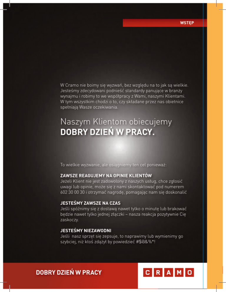 WSTĘP W Cramo nie boimy się wyzwań, bez względu na to jak są wielkie. Jesteśmy zdecydowani podnieść standardy panujące w branży wynajmu i robimy to we współpracy z Wami, naszymi Klientami. W tym wszystkim chodzi o to, czy składane przez nas obietnice spełniają Wasze oczekiwania. Naszym Klientom obiecujemy DOBRY DZIEŃ W PRACY. To wielkie wyzwanie, ale osiągniemy ten cel ponieważ: ZAWSZE REAGUJEMY NA OPINIE KLIENTÓW Jeżeli Klient nie jest zadowolony z naszych usług, chce zgłosić uwagi lub opinie, może się z nami skontaktować pod numerem 602 30 00 30 i otrzymać nagrodę, pomagając nam się doskonalić JESTEŚMY ZAWSZE NA CZAS Jeśli spóźnimy się z dostawą nawet tylko o minutę lub brakować będzie nawet tylko jednej złączki – nasza reakcja pozytywnie Cię zaskoczy. JESTEŚMY NIEZAWODNI Jeśli nasz sprzęt się zepsuje, to naprawimy lub wymienimy go szybciej, niż ktoś zdążył by powiedzieć #$@&%*! DOBRY DZIEŃ W PRACY 1 WYMAGANE DOKUMENTY WYMAGANE DOKUMENTY PRZEDSIĘBIORCY Spółki prawa handlowego (jawna, komandytowa, partnerska, akcyjna, z ograniczoną odpowiedzialnością): oryginał aktualnego odpisu z rejestru przedsiębiorców bądź rejestru sądowego regon NIP SPÓŁDZIELNIE, PRZEDSIĘBIORSTWA PAŃSTWOWE aktualny oryginał wpisu do właściwych rejestrów regon NIP SPÓŁKI CYWILNE ORAZ OSOBY PROWADZĄCE DZIAŁALNOŚĆ GOSPODARCZĄ aktualne wpisy każdego ze wspólników REGON NIP Jeżeli odbiór dokonywany jest przez osoby nie wymienione w dokumentach rejestrowych, wymagane jest pisemne upoważnienie do zawarcia umowy i odbioru jej przedmiotu. Pełnomocnik zobowiązany jest do przedłożenia dowodu osobistego w celu sprawdzenia jego tożsamości. KLIENCI INDYWIDUALNI nie prowadzący działalności gospodarczej: dowód osobisty i dodatkowo drugi dokument ze zdjęciem potwierdzenie zamieszkania w miejscu zameldowania w postaci rachunku za ostatni miesiąc (np. rachunek za gaz, telefon, energię elektryczną) PRZY WYPOŻYCZANIU WYNAJMUJĄCY POZOSTAWIA DEPOZYT, O WYSOKOŚCI KTÓREGO, DECYDUJE WARTOŚĆ WYPOŻYCZANEJ MASZYNY ORAZ OKRES CZASU NA JAKI JEST ONA WYNAJMOWANA. Podstawowe warunki najmu sprzętu budowlanego: kwoty naliczane są bez niedziel i świąt. Ceny podane są w PLN za jedną dobę najmu wysokość stawki dziennej jest regulowana w zależności od długości najmu zgodnie z cennikiem oraz przyznanymi rabatami czynsz według stawki dobowej oznacza zwrot przed upływem 24 godzin. Zdanie maszyny po upływie 24 godzin powoduje naliczenie kolejnej stawki przy wynajmie na jeden dzień roboczy przetrzymanie maszyny przez niedzielę, czy dni świąteczne nie powoduje zmiany stawki najmu szczegółowe warunki najmu są przedstawione na umowie najmu. Cennik obowiązuje od 1 stycznia 2015. Dotychczasowe cenniki tracą ważność. Niniejszy katalog nie stanowi ofert handlowej w rozumieniu art. 66 §1 kodeksu cywilnego oraz innych właściwych przepisów prawnych. 2 SPIS TREŚCI SPIS TREŚCI PRACE ZIEMNE 4 Koparki 5 Ładowarki 5 Zamiatarki 6 Walce 8 Zagęszczarki 10 OBRÓBKA BETONU 12 Betoniarki 13 Buławy 14 Wibratory do betonu 15 Zacieraczki 16 Listwy wibracyjne 17 SPRĘŻARKI, MŁOTY, WIERTARKI 20 Sprężarki 21 22 Młoty Wiertarki 24 PRĄD, SPAWANIE 26 Agregaty 27 Spawarki 30 Zgrzewarki 30 Jak dobrać… 31 OGRZEWANIE, POMPOWANIE 34 Ogrzewacze 35 Osuszacze 38 Klimatyzatory 38 Pompy 38 CIĘCIE, SZLIFOWANIE, POMIAR, CZYSZCZENIE 40 Wyrzynarki 41 Pilarki 41 Bruzdownice 42 Przecinarki 42 Piły 43 Gilotyny 44 Przecinarki 44 Szlifierki 45 Polerki 45 Strugi 46 Giętarki 47 Gilotyny 48 Frezarki 48 Myjki 49 Odkurzacze 49 Lasery 49 TRANSPORT PIONOWY, DRABINY, RUSZTOWANIA 50 Transportery 51 Zsypy 51 Wciągarki 51 Drabiny 52 Rusztowania 53 Wieże jezdne 54 INFRASTRUKTURA PLACU BUDOWY 56 57 Systemy kontenerowe PODESTY RUCHOME 62 Wprowadzenie 63 Użytkowanie 64 65 Kontrola podestu Podesty nożycowe elektryczne 66 Podesty nożycowe spalinowe 67 Podesty teleskopowe elektryczne 68 Podesty teleskopowe spalinowe 74 Podesty teleskopowe zamontowane na przyczepie 76 AKCESORIA 78 3 PRACE ZIEMNE PRACE ZIEMNE Koparki 5 Ładowarki 5 Zamiatarki 6 Walce 8 Zagęszczarki 10 4 www.cramo.pl PRACE ZIEMNE KOPARKI | ŁADOWARKI MINIKOPARKA KUBOTA KX41-3V, TAKEUCHI TB0116A, YANMAR SV17EX 2113113 masa 1.400 -1.900 kg; średnie spalanie 3 l/h; głębokość kopania 2,2 m-2,6 m 1 dzień netto brutto 2-7 dni 8-14 dni 15-21 dni CENA WYNAJMU DO UZGODNIENIA KOPARKA YANMAR VIO20 2113120 masa 2.335 kg; głębokość kopania 2,44 m; wysokość podnoszenia łyżki 2,45 m 1 dzień netto brutto 2-7 dni 8-14 dni 15-21 dni CENA WYNAJMU DO UZGODNIENIA YANMAR VIO25 i 35 2113125, 211313 masa do 3.825 kg; głębokość kopania do 3,10 m; wysokość podnoszenia łyżki do 3,56 m 1 dzień netto brutto 2-7 dni 8-14 dni 15-21 dni CENA WYNAJMU DO UZGODNIENIA ŁADOWARKI KOMATSU WA90*, VOLVO L35B 2217720 masa 6.500 kg; średnie spalanie 8 l/h; ładowarka kołowa; pojemność łyżki 1,1 m ³ 1 dzień netto brutto 2-7 dni 8-14 dni 15-21 dni CENA WYNAJMU DO UZGODNIENIA KOMATSU WA70* 2217710 masa 5.400 kg; średnie spalanie 5,5 l/h; ładowarka kołowa; pojemność łyżki 0,85 m 3 * Dobowy limit pracy wynosi 8h. Dopłata za każdą kolejną motogodzinę wynosi 1/8 stawki dziennej. Istnieje możliwość wynajęcia dodatkowego osprzętu. 1 dzień netto brutto 2-7 dni 8-14 dni 15-21 dni CENA WYNAJMU DO UZGODNIENIA 5 PRACE ZIEMNE ŁADOWARKI | ZAMIATARKI ŁADOWARKI KRAMER 280* 2217472 masa 3.300 kg; średnie spalanie 6-8 l/h; ładowarka kołowa; pojemność łyżki 0,65 m ³ 1 dzień netto brutto 2-7 dni 8-14 dni 15-21 dni CENA WYNAJMU DO UZGODNIENIA BOBCAT S130* 2213130 masa 2.200 kg; średnie spalanie 3 l/h; zbiornik paliwa 50 l, udźwig 600 kg; max wysokość podnoszenia łyżki 2,7 m 1 dzień netto brutto 2-7 dni 8-14 dni 15-21 dni CENA WYNAJMU DO UZGODNIENIA ZAMIATARKA DO ŁADOWAREK KRAMER, KOMATSU, VOLVO, MANITOU 9544410 szerokość robocza 180-210 cm 1 dzień netto brutto 2-7 dni 8-14 dni 15-21 dni CENA