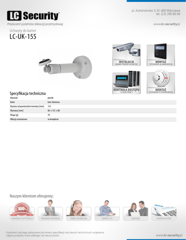 Uchwyty do kamer LC-UK-155 INSTALACJA KAMER PRZEMYSŁOWYCH KONTROLA DOSTĘPU I CZASU PRACY Specyfikacja techniczna Materiał plastik Kolor kość słoniowa Dystans od powierzchni montażu [mm] 155 Wymiary [mm] 80 x 155 x 80 Waga [g] 70 Wkręty montażowe w komplecie MONTAŻ SYSTEMÓW ALARMOWYCH MONTAŻ SYSTEMÓW P.POŻAROWYCH Naszym klientom oferujemy: GWARANCJA SATYSFAKCJI PROGRAM PARTNERSKI POMOC TECHNICZNA SERWIS CCTV SZKOLENIA GENERATOR OFERT
