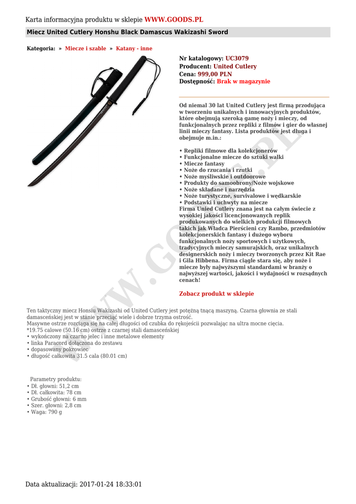 Karta informacyjna produktu w sklepie WWW.GOODS.PL Miecz United Cutlery Honshu Black Damascus Wakizashi Sword Kategoria: » Miecze i szable » Katany - inne Nr katalogowy: UC3079 Producent: United Cutlery Cena: 999,00 PLN Dostępność: Brak w magazynie S. PL Od niemal 30 lat United Cutlery jest firmą przodująca w tworzeniu unikalnych i innowacyjnych produktów, które obejmują szeroką gamę noży i mieczy, od funkcjonalnych przez repliki z filmów i gier do własnej linii mieczy fantasy. Lista produktów jest długa i obejmuje m.in.: W .G O O D • Repliki filmowe dla kolekcjonerów • Funkcjonalne miecze do sztuki walki • Miecze fantasy • Noże do rzucania i rzutki • Noże myśliwskie i outdoorowe • Produkty do samoobrony/Noże wojskowe • Noże składane i narzędzia • Noże turystyczne, survivalowe i wędkarskie • Podstawki i uchwyty na miecze Firma Unied Cutlery znana jest na całym świecie z wysokiej jakości licencjonowanych replik produkowanych do wielkich produkcji filmowych takich jak Władca Pierścieni czy Rambo, przedmiotów kolekcjonerskich fantasy i dużego wyboru funkcjonalnych noży sportowych i użytkowych, tradycyjnych mieczy samurajskich, oraz unikalnych designerskich noży i mieczy tworzonych przez Kit Rae i Gila Hibbena. Firma ciągle stara się, aby noże i miecze były najwyższymi standardami w branży o najwyższej wartości, jakości i wydajności w rozsądnych cenach! Zobacz produkt w sklepie W W Ten taktyczny miecz Honsiu Wakizashi od United Cutlery jest potężną tnącą maszyną. Czarna głownia ze stali damasceńskiej jest w stanie przeciąć wiele i dobrze trzyma ostrość. Masywne ostrze rozciąga się na całej długości od czubka do rękojeścii pozwalając na ultra mocne cięcia. *19.75 calowe (50.16 cm) ostrze z czarnej stali damasceńskiej • wykończony na czarno jelec i inne metalowe elementy • linka Paracord dołączona do zestawu • dopasowany pokrowiec • długość całkowita 31.5 cala (80.01 cm) Parametry produktu: • Dł. głowni: 51,2 cm • Dł. całkowita: 78 cm • Grubość głowni: 6 mm • Szer. głowni: 2,8 cm • Waga: 790 g Data aktualizacji: 2017-01-24 18:33:01