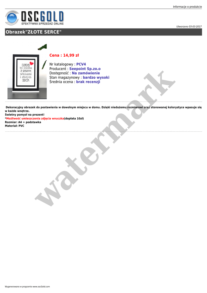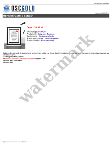 Informacje o produkcie Utworzono 03-03-2017 Obrazek"ZŁOTE SERCE" Cena : 14,99 zł er m ar k Nr katalogowy : PCV4 Producent : Seepoint Sp.zo.o Dostępność : Na zamówienie Stan magazynowy : bardzo wysoki Średnia ocena : brak recenzji w at Dekoracyjny obrazek do postawienia w dowolnym miejscu w domu. Dzięki niedużemu rozmiarowi oraz stonowanej kolorystyce wpasuje się w każde wnętrze. Świetny pomysł na prezent! *Możliwość umieszczenia zdjęcia wnuczka(dopłata 10zł) Rozmiar: A4 + podstawka Materiał: PVC Wygenerowano w programie www.oscGold.com