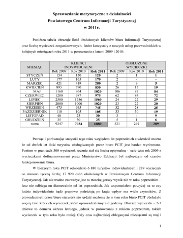 Sprawozdanie merytoryczne z działalności Powiatowego Centrum Informacji Turystycznej w 2011r. Poniższa tabela obrazuje ilość obsłużonych klientów biura Informacji Turystycznej oraz liczbę wycieczek zorganizowanych, które korzystały z naszych usług przewodnickich w kolejnych miesiącach roku 2011 w porównaniu z latami 2009 i 2010: MIESIĄC STYCZEŃ LUTY MARZEC KWIECIEŃ MAJ CZERWIEC LIPIEC SIERPIEŃ WRZESIEŃ PAŹDZIERNIK LISTOPAD GRUDZIEŃ suma KLIENCI INDYWIDUALNI Rok 2009 Rok 2010 Rok 2011 154 150 120 177 165 170 421 419 280 895 790 830 1160 964 1020 1280 987 975 2500 1756 1560 2000 1000 1020 475 645 745 110 105 105 40 23 30 35 30 25 9247 7034 6880 OBSŁUŻONE WYCIECZKI Rok 2009 Rok 2010 Rok 2011 2 1 1 2 2 9 5 26 13 19 106 87 84 62 84 72 24 22 29 23 22 20 32 28 25 33 30 19 3 9 5 1 6 321 297 289 Patrząc i porównując statystki tego roku względem lat poprzednich stwierdzić można że od dwóch lat ilość turystów obsługiwanych przez biuro PCIT jest bardzo wyrównana. Poziom w granicach 300 wycieczek rocznie stał się liczbą optymalną - cały czas rok 2009 z wycieczkami dofinansowanymi przez Ministerstwo Edukacji był najlepszym od czasów funkcjonowania biura. W bieżącym roku PCIT odwiedziło 6 880 turystów indywidualnych i 289 wycieczek co stanowi łączną liczbę 17 920 osób obsłużonych w Powiatowym Centrum Informacji Turystycznej. Jak nie trudno zauważyć jest to troszkę gorszy wynik niż w roku poprzednim – lecz nie odbiega on diametralnie od lat poprzednich. Jak wspomniałem powyżej na to czy ludzie indywidualnie bądź grupowo podróżują po kraju wpływ ma wiele czynników. Z prowadzonych przez biuro statystyk stwierdzić możemy że w tym roku biuro PCIT obsłużyło więcej tzw. krótkich wycieczek, które oprowadzaliśmy 2-3 godziny. Dłuższe wycieczki – 2-3 dniowe to domena okresu letniego, jednak w porównaniu z rokiem poprzednim, takich wycieczek w tym roku było mniej. Cały czas najbardziej obleganymi miesiącami są maj i 1 czerwiec, kiedy to przyjeżdża do nas największa grupa turystów. Co roku jest tak że nie zawsze udaje nam się obsłużyć wszystkich wycieczek zgłaszających się do naszego biura – zazwyczaj w miesiącach maju i czerwcu, zmuszeni jesteśmy do odmówienia kilku wycieczkom. Oczywiście realna liczba wycieczek odwiedzających nasze miasto i okolice jest większa z racji tego że nie wszyscy trafiają do naszego biura, nie wszyscy korzystają z usług przewodnickich itp. Warto jednak zwrócić uwagę na inny rzucający się w oczy fakt. Nadal okazuje się że Gniezno jak i okolice są głównie atrakcjami sezonowymi i to w okresie letnim przyjeżdża do nas najwięcej turystów. W tym roku obserwujemy bardzo podobne liczby grup w poszczególnych miesiącach letnich. Pocieszający jest fakt że zarówno z końcem roku jak i na początku jest więcej grup niż w roku poprzednim. Od kilku lat coraz częściej pojawiają się grupy w większości młodzieży szkolnej, dzieci, przyjeżdżający do gnieźnieńskich fabryk bombek, odwiedzające ewentualnie katedrę coraz częściej korzystając z usług przewodnickich po Katedrze Gnieźnieńskiej. Warto też nadmienić że w tym roku można było zaobserwować tendencje do coraz bardziej oszczędnych wycieczek gdzie każdy dodatkowy koszt musiał być maksymalnie minimalizowany – co za tym idzie w tym roku nie było zbyt wielu wycieczek kilku dniowych gdzie turyści zwiedzali okolicę a dominowały krótkie jedno - dwudniowe wycieczki. Reasumując – rok ten był minimalnie słabszy ale pokazuje że poziom grup odwiedzających nasz rejon się normuje i liczba w okolicach 300 wycieczek staje się liczbą optymalną. Turysta coraz częściej woli wydać kilkaset złotych na wycieczkę do ciepłych krajów gdzie wie że pogodę ma zapewnioną – a sama wycieczka jest pakietem gdzie w jednej cenie ma nocleg, jedzenie często też zwiedzanie. Inną sprawą może być też wyżej wspomniany już problem finansowy, z roku na rok wszelkiego rodzaju usługi, materiały czy benzyna drożeją a co za tym idzie sam koszt wycieczki – wyjazdu wzrasta. Patrząc jednak na wykres poniżej zauważyć można że rok 2011 można uznać za minimalnie słabszy w porównaniu z latami poprzednimi ale liczba ludzi napływających w naszą okolicę oscyluje w zbliżonych do siebie wartościach: 2 14000 12000 10000 8000 indywidualni grupy 6000 4000 2000 0 2006r 2007r 2008r 2009r 2010r. 2011r. Wydarzenia Targi Turystyczne Cały czas pojawianie się pracowników PCIT wraz z pracownikami Starostwa Powiatowego w Gnieźnie i Urzędu Miejskiego w Gnieźnie ze stoiskiem na targach turystycznych w różnych miastach procentuje turystami z tych regionów. W tym roku pracownicy PCIT byli w: Łodzi, Wrocławiu, i w Poznaniu w pozostałe miejsca jak: Szczecin czy Berlin dzięki współpracy z WOT-em – pojechały materiały promocyjne. Podsumowując Targi przyniosły zadowalający nas efekt. Rozczarowaniem tegorocznym Może być jedynie Poznań gdzie frekwencja potencjalnych turystów nie do końca była taka jakiej oczekiwaliśmy. Jest to jednak bardzo dobra forma promocji regionu i na pewno trzeba ją kultywować. Spotkanie Komisji Promocji, Kultury i Turystyki W lutym kierownik biura PCIT – Pani Magdalena Nitecka brała udział w spotkaniu organizowanym przez Komisję Promocji, Kultury i Turystyki w Urzędzie Miejskim w Gnieźnie. Na spotkaniu tym podsumowała i opowiedziała o roku 2010 i ruchu turystycznym w tym okresie, przedstawiła także przygotowanie biura do nadchodzącego sezonu 2011. Jednym z problemów poruszanych przez Panią Magdę, była kwestia odświeżenia elewacji biura PCIT. Radni uznali że jest to potrzebne z racji tego iż punkt PCIT jest wizytówką naszego miasta i postarają się pomóc w rozmowach z Konserwatorem Miejskim. Reasumując 3 odnowienia elewacji budynku jak i biura nie udało się w tym roku zrealizować. Jedyną rzeczą będzie zrealizowanie nowego kaseto