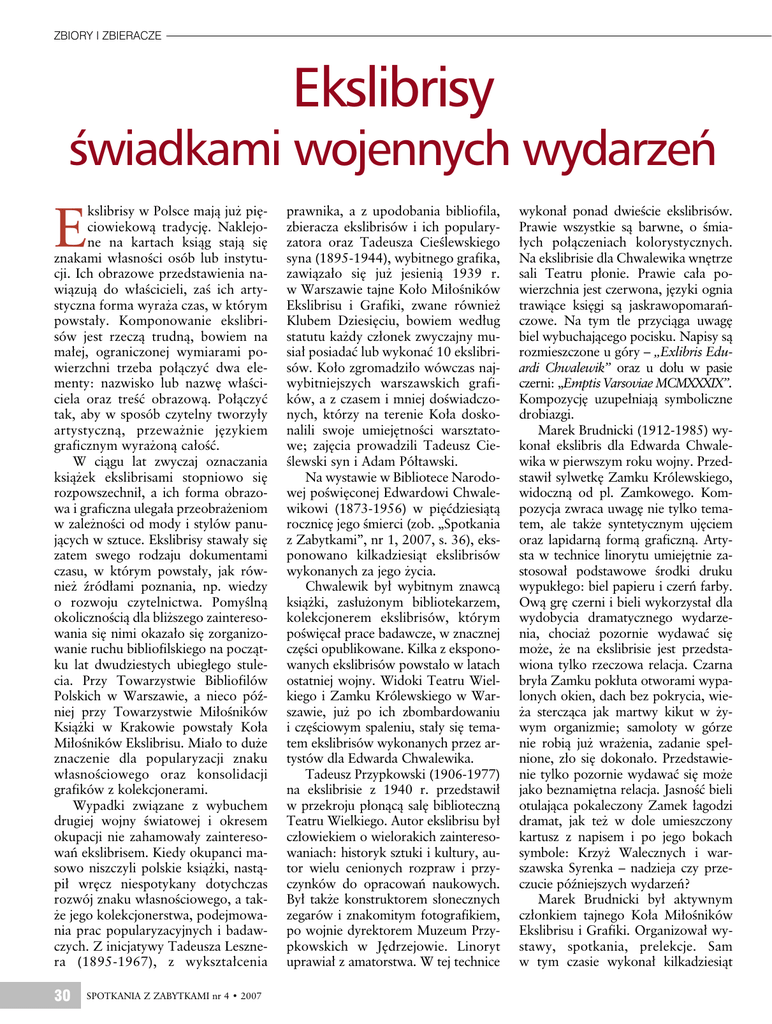 ZBIORY I ZBIERACZE Ekslibrisy świadkami wojennych wydarzeń kslibrisy w Polsce mają już pięciowiekową tradycję. Naklejone na kartach ksiąg stają się znakami własności osób lub instytucji. Ich obrazowe przedstawienia nawiązują do właścicieli, zaś ich artystyczna forma wyraża czas, w którym powstały. Komponowanie ekslibrisów jest rzeczą trudną, bowiem na małej, ograniczonej wymiarami powierzchni trzeba połączyć dwa elementy: nazwisko lub nazwę właściciela oraz treść obrazową. Połączyć tak, aby w sposób czytelny tworzyły artystyczną, przeważnie językiem graficznym wyrażoną całość. W ciągu lat zwyczaj oznaczania książek ekslibrisami stopniowo się rozpowszechnił, a ich forma obrazowa i graficzna ulegała przeobrażeniom w zależności od mody i stylów panujących w sztuce. Ekslibrisy stawały się zatem swego rodzaju dokumentami czasu, w którym powstały, jak również źródłami poznania, np. wiedzy o rozwoju czytelnictwa. Pomyślną okolicznością dla bliższego zainteresowania się nimi okazało się zorganizowanie ruchu bibliofilskiego na początku lat dwudziestych ubiegłego stulecia. Przy Towarzystwie Bibliofilów Polskich w Warszawie, a nieco później przy Towarzystwie Miłośników Książki w Krakowie powstały Koła Miłośników Ekslibrisu. Miało to duże znaczenie dla popularyzacji znaku własnościowego oraz konsolidacji grafików z kolekcjonerami. Wypadki związane z wybuchem drugiej wojny światowej i okresem okupacji nie zahamowały zainteresowań ekslibrisem. Kiedy okupanci masowo niszczyli polskie książki, nastąpił wręcz niespotykany dotychczas rozwój znaku własnościowego, a także jego kolekcjonerstwa, podejmowania prac popularyzacyjnych i badawczych. Z inicjatywy Tadeusza Lesznera (1895-1967), z wykształcenia E 30 SPOTKANIA Z ZABYTKAMI nr 4 • 2007 prawnika, a z upodobania bibliofila, zbieracza ekslibrisów i ich popularyzatora oraz Tadeusza Cieślewskiego syna (1895-1944), wybitnego grafika, zawiązało się już jesienią 1939 r. w Warszawie tajne Koło Miłośników Ekslibrisu i Grafiki, zwane również Klubem Dziesięciu, bowiem według statutu każdy członek zwyczajny musiał posiadać lub wykonać 10 ekslibrisów. Koło zgromadziło wówczas najwybitniejszych warszawskich grafików, a z czasem i mniej doświadczonych, którzy na terenie Koła doskonalili swoje umiejętności warsztatowe; zajęcia prowadzili Tadeusz Cieślewski syn i Adam Półtawski. Na wystawie w Bibliotece Narodowej poświęconej Edwardowi Chwalewikowi (1873-1956) w pięćdziesiątą rocznicę jego śmierci (zob. „Spotkania z Zabytkami”, nr 1, 2007, s. 36), eksponowano kilkadziesiąt ekslibrisów wykonanych za jego życia. Chwalewik był wybitnym znawcą książki, zasłużonym bibliotekarzem, kolekcjonerem ekslibrisów, którym poświęcał prace badawcze, w znacznej części opublikowane. Kilka z eksponowanych ekslibrisów powstało w latach ostatniej wojny. Widoki Teatru Wielkiego i Zamku Królewskiego w Warszawie, już po ich zbombardowaniu i częściowym spaleniu, stały się tematem ekslibrisów wykonanych przez artystów dla Edwarda Chwalewika. Tadeusz Przypkowski (1906-1977) na ekslibrisie z 1940 r. przedstawił w przekroju płonącą salę biblioteczną Teatru Wielkiego. Autor ekslibrisu był człowiekiem o wielorakich zainteresowaniach: historyk sztuki i kultury, autor wielu cenionych rozpraw i przyczynków do opracowań naukowych. Był także konstruktorem słonecznych zegarów i znakomitym fotografikiem, po wojnie dyrektorem Muzeum Przypkowskich w Jędrzejowie. Linoryt uprawiał z amatorstwa. W tej technice wykonał ponad dwieście ekslibrisów. Prawie wszystkie są barwne, o śmiałych połączeniach kolorystycznych. Na ekslibrisie dla Chwalewika wnętrze sali Teatru płonie. Prawie cała powierzchnia jest czerwona, języki ognia trawiące księgi są jaskrawopomarańczowe. Na tym tle przyciąga uwagę biel wybuchającego pocisku. Napisy są rozmieszczone u góry – „Exlibris Eduardi Chwalewik” oraz u dołu w pasie czerni: „Emptis Varsoviae MCMXXXIX”. Kompozycję uzupełniają symboliczne drobiazgi. Marek Brudnicki (1912-1985) wykonał ekslibris dla Edwarda Chwalewika w pierwszym roku wojny. Przedstawił sylwetkę Zamku Królewskiego, widoczną od pl. Zamkowego. Kompozycja zwraca uwagę nie tylko tematem, ale także syntetycznym ujęciem oraz lapidarną formą graficzną. Artysta w technice linorytu umiejętnie zastosował podstawowe środki druku wypukłego: biel papieru i czerń farby. Ową grę czerni i bieli wykorzystał dla wydobycia dramatycznego wydarzenia, chociaż pozornie wydawać się może, że na ekslibrisie jest przedstawiona tylko rzeczowa relacja. Czarna bryła Zamku pokłuta otworami wypalonych okien, dach bez pokrycia, wieża stercząca jak martwy kikut w żywym organizmie; samoloty w górze nie robią już wrażenia, zadanie spełnione, zło się dokonało. Przedstawienie tylko pozornie wydawać się może jako beznamiętna relacja. Jasność bieli otulająca pokaleczony Zamek łagodzi dramat, jak też w dole umieszczony kartusz z napisem i po jego bokach symbole: Krzyż Walecznych i warszawska Syrenka – nadzieja czy przeczucie późniejszych wydarzeń? Marek Brudnicki był aktywnym członkiem tajnego Koła Miłośników Ekslibrisu i Grafiki. Organizował wystawy, spotkania, prelekcje. Sam w tym czasie wykonał kilkadziesiąt 1 3 4 2 1-5. Ekslibrisy wykonane dla Edwarda Chwalewika przez: Tadeusza Przypkowskiego, 1940 r. (1), Marka Brudnickiego, 1940 r. (2), Stefana Mrożewskiego, 1942 r. (3), Edwardę Przeorską, 1942 r. (4) i Adama Jerzego Półtawskiego, 1943 r. (5) (ekslibrisy w zbiorach Biblioteki Narodowej w Warszawie) 5 ekslibrisów cieszących się uznaniem. Linorytami zilustrował pracę Jerzego Krama Dialog o grafice (Warszawa 1942) na prawach rękopisu w 12 egzemplarzach. Warto przypomnieć, że autor Dialogu opracował w tym czasie pierwszy i dotychczas jedyny Almanach Eksli