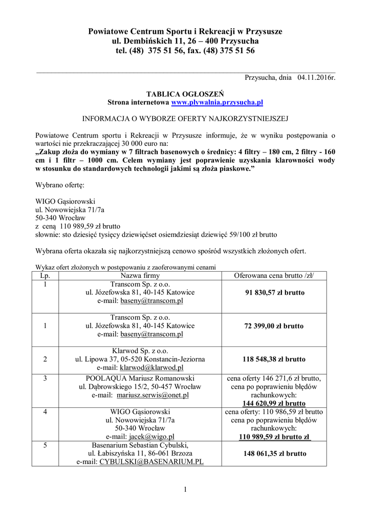 Powiatowe Centrum Sportu i Rekreacji w Przysusze ul. Dembińskich 11, 26 – 400 Przysucha tel. (48) 375 51 56, fax. (48) 375 51 56 ________________________________________________________________________________ Przysucha, dnia 04.11.2016r. TABLICA OGŁOSZEŃ Strona internetowa www.plywalnia.przysucha.pl INFORMACJA O WYBORZE OFERTY NAJKORZYSTNIEJSZEJ Powiatowe Centrum sportu i Rekreacji w Przysusze informuje, że w wyniku postępowania o wartości nie przekraczającej 30 000 euro na: „Zakup złoża do wymiany w 7 filtrach basenowych o średnicy: 4 filtry – 180 cm, 2 filtry - 160 cm i 1 filtr – 1000 cm. Celem wymiany jest poprawienie uzyskania klarowności wody w stosunku do standardowych technologii jakimi są złoża piaskowe.” Wybrano ofertę: WIGO Gąsiorowski ul. Nowowiejska 71/7a 50-340 Wrocław z ceną 110 989,59 zł brutto słownie: sto dziesięć tysięcy dziewięćset osiemdziesiąt dziewięć 59/100 zł brutto Wybrana oferta okazała się najkorzystniejszą cenowo spośród wszystkich złożonych ofert. Wykaz ofert złożonych w postępowaniu z zaoferowanymi cenami Lp. 1 1 2 3 4 5 Nazwa firmy Transcom Sp. z o.o. ul. Józefowska 81, 40-145 Katowice e-mail: [email protected] Transcom Sp. z o.o. ul. Józefowska 81, 40-145 Katowice e-mail: [email protected] Klarwod Sp. z o.o. ul. Lipowa 37, 05-520 Konstancin-Jeziorna e-mail: [email protected] POOLAQUA Mariusz Romanowski ul. Dąbrowskiego 15/2, 50-457 Wrocław e-mail: [email protected] WIGO Gąsiorowski ul. Nowowiejska 71/7a 50-340 Wrocław e-mail: [email protected] Basenarium Sebastian Cybulski, ul. Łabiszyńska 11, 86-061 Brzoza e-mail: [email protected] 1 Oferowana cena brutto /zł/ 91 830,57 zł brutto 72 399,00 zł brutto 118 548,38 zł brutto cena oferty 146 271,6 zł brutto, cena po poprawieniu błędów rachunkowych: 144 620,99 zł brutto cena oferty: 110 986,59 zł brutto cena po poprawieniu błędów rachunkowych: 110 989,59 zł brutto zł 148 061,35 zł brutto Zamawiający informuje, że w dwóch ofertach poprawione zostały błędy rachunkowe w obliczeniu ceny w wyniku czego zmieniły się ostateczne ceny ofert: - w ofercie: POOLAQUA Mariusz Romanowski, ul. Dąbrowskiego 15/2, 50-457 Wrocław cena oferty zmieniła się z 146 271,60 zł brutto na 144 620,99 zł brutto - w ofercie: WIGO Gąsiorowski ul. Nowowiejska 71/7a, 50-340 Wrocław cena oferty zmieniła się z 110 986,59 zł brutto na 110 989,59 zł brutto Jednocześnie informujemy, że Wykonawca Transcom Sp. z o.o. ul. Józefowska 81, 40-145 Katowice złożył w postępowaniu dwie różne oferty co jest sprzeczne z zasadami prowadzonego postępowania oraz narusza zasady uczciwej konkurencji i równego traktowanie wykonawców. Biorąc pod uwagę powyższe obie oferty zostały odrzucone. Dyrektor Powiatowego Centrum Sportu i Rekreacji w Przysusze Elżbieta Żytniak 2
