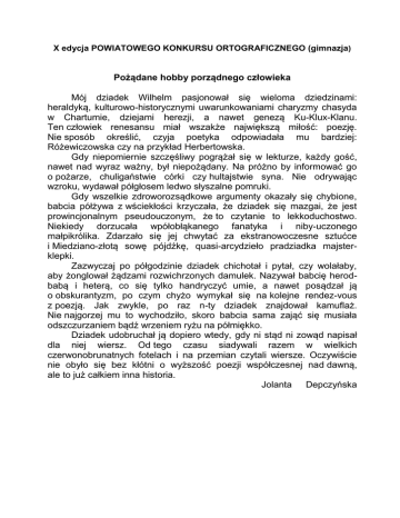 X edycja POWIATOWEGO KONKURSU ORTOGRAFICZNEGO (gimnazja) Pożądane hobby porządnego człowieka Mój dziadek Wilhelm pasjonował się wieloma dziedzinami: heraldyką, kulturowo-historycznymi uwarunkowaniami charyzmy chasyda w Chartumie, dziejami herezji, a nawet genezą Ku-Klux-Klanu. Ten człowiek renesansu miał wszakże największą miłość: poezję. Nie sposób określić, czyja poetyka odpowiadała mu bardziej: Różewiczowska czy na przykład Herbertowska. Gdy niepomiernie szczęśliwy pogrążał się w lekturze, każdy gość, nawet nad wyraz ważny, był niepożądany. Na próżno by informować go o pożarze, chuligaństwie córki czy hultajstwie syna. Nie odrywając wzroku, wydawał półgłosem ledwo słyszalne pomruki. Gdy wszelkie zdroworozsądkowe argumenty okazały się chybione, babcia półżywa z wściekłości krzyczała, że dziadek się mazgai, że jest prowincjonalnym pseudouczonym, że to czytanie to lekkoduchostwo. Niekiedy dorzucała wpółobłąkanego fanatyka i niby-uczonego małpikrólika. Zdarzało się jej chwytać za ekstranowoczesne sztućce i Miedziano-złotą sowę pójdźkę, quasi-arcydzieło pradziadka majsterklepki. Zazwyczaj po półgodzinie dziadek chichotał i pytał, czy wolałaby, aby żonglował żądzami rozwichrzonych damulek. Nazywał babcię herodbabą i heterą, co się tylko handryczyć umie, a nawet posądzał ją o obskurantyzm, po czym chyżo wymykał się na kolejne rendez-vous z poezją. Jak zwykle, po raz n-ty dziadek znajdował kamuflaż. Nie najgorzej mu to wychodziło, skoro babcia sama zająć się musiała odszczurzaniem bądź wrzeniem ryżu na półmiękko. Dziadek udobruchał ją dopiero wtedy, gdy ni stąd ni zowąd napisał dla niej wiersz. Od tego czasu siadywali razem w wielkich czerwonobrunatnych fotelach i na przemian czytali wiersze. Oczywiście nie obyło się bez kłótni o wyższość poezji współczesnej nad dawną, ale to już całkiem inna historia. Jolanta Depczyńska