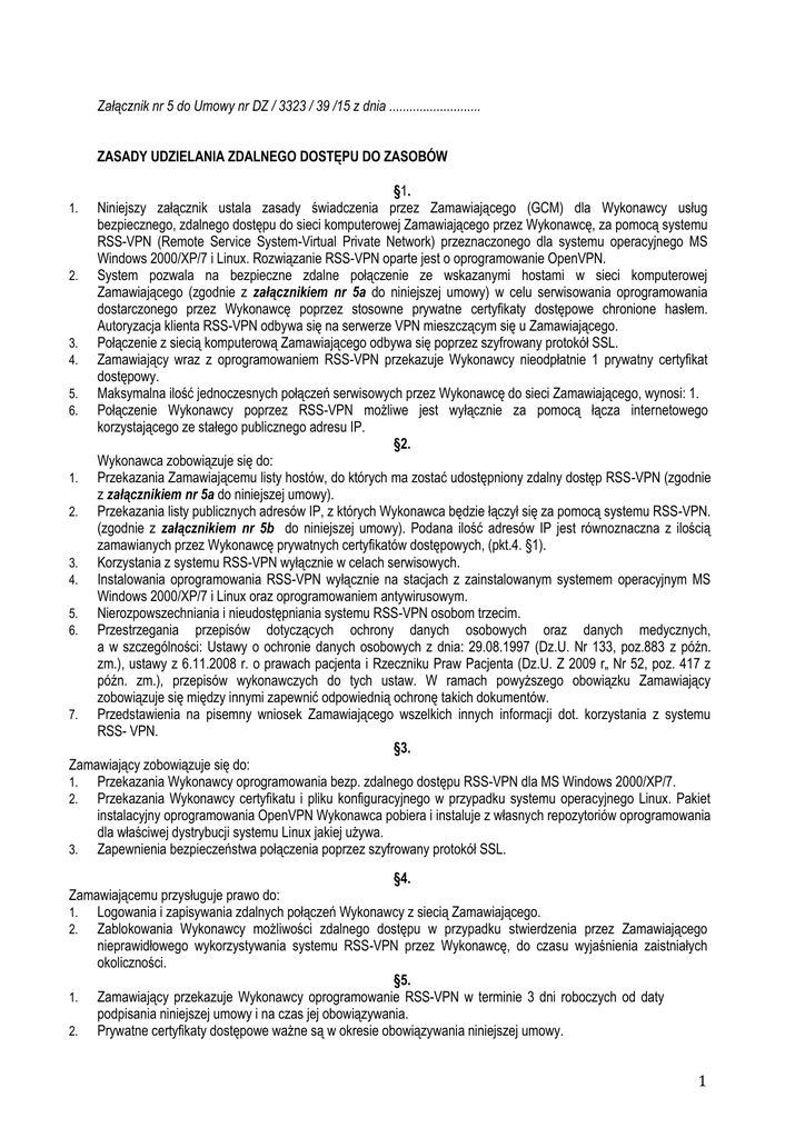 Załącznik nr 5 do Umowy nr DZ / 3323 / 39 /15 z dnia ........................... ZASADY UDZIELANIA ZDALNEGO DOSTĘPU DO ZASOBÓW §1. Niniejszy załącznik ustala zasady świadczenia przez Zamawiającego (GCM) dla Wykonawcy usług bezpiecznego, zdalnego dostępu do sieci komputerowej Zamawiającego przez Wykonawcę, za pomocą systemu RSS-VPN (Remote Service System-Virtual Private Network) przeznaczonego dla systemu operacyjnego MS Windows 2000/XP/7 i Linux. Rozwiązanie RSS-VPN oparte jest o oprogramowanie OpenVPN. 2. System pozwala na bezpieczne zdalne połączenie ze wskazanymi hostami w sieci komputerowej Zamawiającego (zgodnie z załącznikiem nr 5a do niniejszej umowy) w celu serwisowania oprogramowania dostarczonego przez Wykonawcę poprzez stosowne prywatne certyfikaty dostępowe chronione hasłem. Autoryzacja klienta RSS-VPN odbywa się na serwerze VPN mieszczącym się u Zamawiającego. 3. Połączenie z siecią komputerową Zamawiającego odbywa się poprzez szyfrowany protokół SSL. 4. Zamawiający wraz z oprogramowaniem RSS-VPN przekazuje Wykonawcy nieodpłatnie 1 prywatny certyfikat dostępowy. 5. Maksymalna ilość jednoczesnych połączeń serwisowych przez Wykonawcę do sieci Zamawiającego, wynosi: 1. 6. Połączenie Wykonawcy poprzez RSS-VPN możliwe jest wyłącznie za pomocą łącza internetowego korzystającego ze stałego publicznego adresu IP. §2. Wykonawca zobowiązuje się do: 1. Przekazania Zamawiającemu listy hostów, do których ma zostać udostępniony zdalny dostęp RSS-VPN (zgodnie z załącznikiem nr 5a do niniejszej umowy). 2. Przekazania listy publicznych adresów IP, z których Wykonawca będzie łączył się za pomocą systemu RSS-VPN. (zgodnie z załącznikiem nr 5b do niniejszej umowy). Podana ilość adresów IP jest równoznaczna z ilością zamawianych przez Wykonawcę prywatnych certyfikatów dostępowych, (pkt.4. §1). 3. Korzystania z systemu RSS-VPN wyłącznie w celach serwisowych. 4. Instalowania oprogramowania RSS-VPN wyłącznie na stacjach z zainstalowanym systemem operacyjnym MS Windows 2000/XP/7 i Linux oraz oprogramowaniem antywirusowym. 5. Nierozpowszechniania i nieudostępniania systemu RSS-VPN osobom trzecim. 6. Przestrzegania przepisów dotyczących ochrony danych osobowych oraz danych medycznych, a w szczególności: Ustawy o ochronie danych osobowych z dnia: 29.08.1997 (Dz.U. Nr 133, poz.883 z późn. zm.), ustawy z 6.11.2008 r. o prawach pacjenta i Rzeczniku Praw Pacjenta (Dz.U. Z 2009 r„ Nr 52, poz. 417 z późn. zm.), przepisów wykonawczych do tych ustaw. W ramach powyższego obowiązku Zamawiający zobowiązuje się między innymi zapewnić odpowiednią ochronę takich dokumentów. 7. Przedstawienia na pisemny wniosek Zamawiającego wszelkich innych informacji dot. korzystania z systemu RSS- VPN. §3. Zamawiający zobowiązuje się do: 1. Przekazania Wykonawcy oprogramowania bezp. zdalnego dostępu RSS-VPN dla MS Windows 2000/XP/7. 2. Przekazania Wykonawcy certyfikatu i pliku konfiguracyjnego w przypadku systemu operacyjnego Linux. Pakiet instalacyjny oprogramowania OpenVPN Wykonawca pobiera i instaluje z własnych repozytoriów oprogramowania dla właściwej dystrybucji systemu Linux jakiej używa. 3. Zapewnienia bezpieczeństwa połączenia poprzez szyfrowany protokół SSL. 1. §4. Zamawiającemu przysługuje prawo do: 1. Logowania i zapisywania zdalnych połączeń Wykonawcy z siecią Zamawiającego. 2. Zablokowania Wykonawcy możliwości zdalnego dostępu w przypadku stwierdzenia przez Zamawiającego nieprawidłowego wykorzystywania systemu RSS-VPN przez Wykonawcę, do czasu wyjaśnienia zaistniałych okoliczności. §5. 1. Zamawiający przekazuje Wykonawcy oprogramowanie RSS-VPN w terminie 3 dni roboczych od daty podpisania niniejszej umowy i na czas jej obowiązywania. 2. Prywatne certyfikaty dostępowe ważne są w okresie obowiązywania niniejszej umowy. 1