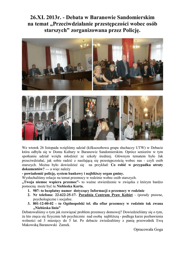 26.XI. 2013r. - Debata w Baranowie Sandomierskim na temat „Przeciwdziałanie przestępczości wobec osób starszych” zorganizowana przez Policję. We wtorek 26 listopada wzięliśmy udział (kilkuosobowa grupa słuchaczy UTW) w Debacie która odbyła się w Domu Kultury w Baranowie Sandomierskim. Oprócz seniorów w tym spotkaniu udział wzięła młodzież ze szkoły średniej. Głównym tematem było Jak przeciwdziałać, jak sobie radzić z nasilającą się przestępczością wobec nas - czyli osób starszych. Można było dowiedzieć się na przykład: Co robić w przypadku utraty dokumentów? --- a więc należy - powiadomić policję, system bankowy i najbliższy organ gminy. Wysłuchaliśmy relacje na temat przemocy w rodzinie wobec osób starszych. „Twoja niemoc wspiera przemoc”- to ważne stwierdzenie w związku z którym bardzo pomocną może być tu Niebieska Karta. 1. 987- to bezpłatny numer dotyczący Informacji o przemocy w rodzinie 2. Nr telefonu: 22-622-25-17- Poradnia Centrum Praw Kobiet - (porady prawne, psychologiczne i socjalne. 3. 801-12-00-02 - to Ogólnopolski tel. dla ofiar przemocy w rodzinie tak zwana „Niebieska linia” Debatowaliśmy o tym jak rozwiązać problem przemocy domowej? Dowiedzieliśmy się o tym, że kto znęca się fizycznie lub psychicznie nad osobą najbliższą - podlega karze pozbawienia wolności od 3 miesięcy do 5 lat. Po debacie zwiedzaliśmy z panią przewodnik Ewą Makowską Baranowski Zamek. Opracowała Goga