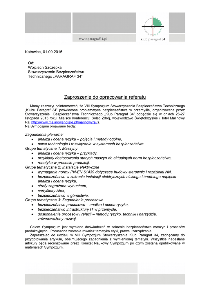 Katowice, 01.09.2015 Od: Wojciech Szczepka Stowarzyszenie Bezpieczeństwa Technicznego „PARAGRAF 34” Zaproszenie do opracowania referatu Mamy zaszczyt poinformować, że VIII Sympozjum Stowarzyszenia Bezpieczeństwa Technicznego „Klubu Paragraf 34” poświęcone problematyce bezpieczeństwa w przemyśle, organizowane przez Stowarzyszenie Bezpieczeństwa Technicznego „Klub Paragraf 34” odbędzie się w dniach 26-27 listopada 2015 roku. Miejsce konferencji: Solec Zdrój, województwo Świętokrzyskie (Hotel Malinowy Raj http://www.malinowehotele.pl/malinowyraj/). Na Sympozjum omawiane będą: Zagadnienia plenarne: analiza i ocena ryzyka – pojęcia i metody ogólne, nowe technologie i rozwiązania w systemach bezpieczeństwa. Grupa tematyczna 1: Maszyny analiza i ocena ryzyka – przykłady, przykłady dostosowania starych maszyn do aktualnych norm bezpieczeństwa, robotyka w procesie produkcji. Grupa tematyczna 2: Instalacje elektryczne wymagania normy PN-EN 61439 dotyczące budowy sterownic i rozdzielni NN, bezpieczeństwo w zakresie instalacji elektrycznych niskiego i średniego napięcia – analiza i ocena ryzyka, strefy zagrożone wybuchem, certyfikaty Atex, bezpieczeństwo w górnictwie. Grupa tematyczna 3: Zagadnienia procesowe bezpieczeństwo procesowe – analiza i ocena ryzyka, bezpieczeństwo infrastruktury IT w przemyśle, doskonalenie procesów i relacji – metody,ryzyko, techniki i narzędzia, zrównoważony rozwój. Celem Sympozjum jest wymiana doświadczeń w zakresie bezpieczeństwa maszyn i procesów produkcyjnych . Poruszona zostanie również tematyka etyki, prawa i zarządzania. Zapraszając do udziału w VIII Sympozjum Stowarzyszenia Klub Paragraf 34, zachęcamy do przygotowania artykułu, obejmującego zagadnienia z wymienionej tematyki. Wszystkie nadesłane artykuły będą recenzowane przez Komitet Naukowy Sympozjum po czym zostaną opublikowane w materiałach Sympozjum. Nad merytoryczną stroną Sympozjum czuwał będzie Komitet Naukowy w składzie: prof. dr inż. Tadeusz Missala - Przewodniczący prof. dr hab. inż. Krzysztof Krauze prof. dr hab. inż. Marek Dźwiarek dr Anna Wronka dr inż. Ireneusz Sosnowski mgr. inż Wojciech Szczepka - Sekretarz Terminy przygotowania i nadesłania materiałów na Sympozjum: • 16.09.2015 - przesłanie streszczenia artykułu (do 1 strony A4), wraz z tytułem w języku polskim i angielskim, • 16.10.2015 - kwalifikacja artykułów na podstawie streszczenia, poinformowanie Autorów o zakwalifikowaniu do druku. • 02.11.2015 - przysłanie pełnej wersji artykułu, • 16.11.2015 - recenzje, kwalifikacja artykułów przez Komitet Naukowy, poinformowanie Autorów o zakwalifikowaniu artykułów do druku. Dla Autorów artykułów przygotowaliśmy formatkę (plik MS Word) ułatwiającą stworzenie artykułu w wersji do druku w materiałach konferencyjnych. Formatka jest dostępna na stronach Stowarzyszenia Klub Paragraf34. Gotowe artykuły prosimy przesyłać drogą elektroniczną na adres: [email protected]. Istnieje również możliwość zamieszczenia w materiałach konferencyjnych komunikatu lub wkładki reklamowej bądź zaprezentowania osiągnięć i propozycji Państwa firmy na stoisku reklamowym, a także wygłoszenia komunikatu reklamowego w czasie sesji plenarnej. Informacji udziela: Wojciech Szczepka Sekretarz Komitetu Naukowego VIII Sympozjum Stowarzyszenia Klubu Paragraf 34 tel. +48 32 208 41 84, tel. kom. 606 801 956 fax. +48 32 208 41 39 e-mail: [email protected] lub Aleksandra Szafraniec [email protected] tel. +48 22 547 08 85 Sekretarz Stowarzyszenia Wojciech Szczepka