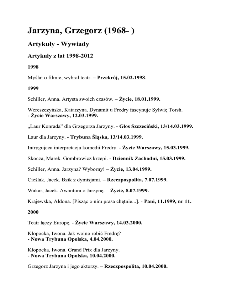 Jarzyna, Grzegorz (1968- ) Artykuły - Wywiady Artykuły z lat 1998-2012 1998 Myślał o filmie, wybrał teatr. – Przekrój, 15.02.1998. 1999 Schiller, Anna. Artysta swoich czasów. – Życie, 18.01.1999. Wereszczyńska, Katarzyna. Dynamit u Fredry fascynuje Sylwię Torsh. - Życie Warszawy, 12.03.1999. „Laur Konrada” dla Grzegorza Jarzyny. - Głos Szczeciński, 13/14.03.1999. Laur dla Jarzyny. - Trybuna Śląska, 13/14.03.1999. Intrygująca interpretacja komedii Fredry. - Życie Warszawy, 15.03.1999. Skocza, Marek. Gombrowicz krzepi. - Dziennik Zachodni, 15.03.1999. Schiller, Anna. Jarzyna? Wyborny! – Życie, 13.04.1999. Cieślak, Jacek. Bzik z dymisjami. – Rzeczpospolita, 7.07.1999. Wakar, Jacek. Awantura o Jarzynę. – Życie, 8.07.1999. Krajewska, Aldona. [Pisząc o nim prasa chętnie...]. - Pani, 11.1999, nr 11. 2000 Teatr łączy Europę. - Życie Warszawy, 14.03.2000. Kłopocka, Iwona. Jak wolno robić Fredrę? - Nowa Trybuna Opolska, 4.04.2000. Kłopocka, Iwona. Grand Prix dla Jarzyny. - Nowa Trybuna Opolska, 10.04.2000. Grzegorz Jarzyna i jego aktorzy. – Rzeczpospolita, 10.04.2000. Kłopocka, Iwona. Od olśnienia do osłupienia. - Nowa Trybuna Opolska, 11.04.2000. Kolejna nagroda dla Jarzyny. - Życie Warszawy, 11.04.2000. Schick, Piotr. Młode lwy Europy. – Trybuna, 9.06.2000. Pawłowski, Roman. Dzika Iwona. - Gazeta Wyborcza, 20.07.2000. Jarzyna mistyczny Marie – Celcie Beranger „La Provence”. - Gazeta Wyborcza, 25.07.2000. Czułem się jak szczęśliwa marionetka. – Teatr, 9.09.2000. Do trzech razy sztuka. – Przekrój, 15.10.2000. 2001 Lupa i Jarzyna. – Rzeczpospolita, 5.01.2001. Sieradzki, Jacek. Bażant na tacy. – Polityka, 23.06.2001. Ważyńska, Dorota. Reżyserzy z ratusza. - Gazeta Wyborcza, 12.07.2001. 2002 Pietkiewicz, Małgorzata. Gołe staruszki i sedes na scenę. - Super Express, 5/6.01.2002. Szczerbowska, Katarzyna. Miałam kiedyś takie piękne ciało. W: Życie. – 17.01.2002. 2003 Pawłowski, Roman. Bzik powszechny. - Gazeta Wyborcza, 12.09.2003. Pawłowski, Roman. Jarzyna nieświeży. - Gazeta Wyborcza, 3.11.2003. Kowalczyk, Janusz R. Rozmaitości centralne. – Rzeczpospolita, 6.11.2003. 2004 Targoń, Joanna. Warszawska szkoła terenowa. - Gazeta Wyborcza, 12.08.2004. Cieślak, Jacek. Muzyczna „Iwona” Gombrowicza. - Rzeczpospolita, 20/21.11.2004. Gruszczyński, Piotr. Paryż wzięty? - Gazeta Wyborcza, 22.11.2004. 2005 Bruzda, Jolanta. Wszyscy gramy w seks. - Gazeta Wyborcza, 8.07.2005. Pawłowski, Roman. Bzik schodzi z afisza. - Gazeta Wyborcza, 21.12.2005. 2006 Pawłowski, Roman. Teraz Polska u Jarzyny. - Gazeta Wyborcza, 31.05.2006. 2007 Cieślak, Jacek. Współczesna „Medea” w Wiedniu to opowieść o poczuciu obcości. – Rzeczpospolita, 30.12.2006/1.01.2007. Cieślak, Jacek. Mocny thriller Jarzyny w Burgtheater. - Rzeczpospolita, 23.11.2007. 2008 Cieślak, Jacek. Nasz „Macbeth” w Nowym Jorku. - Rzeczpospolita, 17.06.2008. Basara, Zbigniew. Makbet Jarzyny w Nowym Jorku. - Gazeta Wyborcza, 18.06.2008. Klich, Aleksandra. Jak Grzegorz Jarzyna nie został górnikiem. - Gazeta Wyborcza, 18.12.2008. 2009 Marczyński, Jacek. Operowy thriller Jarzyny. - Rzeczpospolita, 24/25.01.2009. Kowalczyk, Janusz R. Uwiedzenie i porzuceni. - Rzeczpospolita, 3.02.2009. Derkaczew, Joanna. Jarzyna delikatny i wierny. - Gazeta Wyborcza, 6.02.2009. Drewniak, Łukasz. Pustynia Boga. Grzegorz Jarzyna prowadzi... - Przekrój, 12.02.2009. Weryńska, Joanna. Między Masłowską a Jarzyną dobrze jest. - Gazeta Krakowska, 9.12.2009. Niemczyńska, Małgorzata I. Balkon przez komunistów urwany. - Gazeta Wyborcza, 9.12.2009. Targoń, Joanna. Dwa razy Jarzyna. - Gazeta Wyborcza, 14.12.2009. Weryńska, Joanna. Jarzyna wygrał Boską Komedię. - Gazeta Krakowska, 16.12.2009. 2011 Marczyński, Jacek. Monachijski sukces Grzegorza Jarzyny. - Rzeczpospolita, 2.03.2011. 2012 Malatyńska – Stankiewicz, Agnieszka. Pasja Pendereckiego w kosmicznej kopule. - Dziennik Polski, 1.02.2012. Handzlik, Tomasz. Jarzyna z „Pasją”. - Gazeta Wyborcza, 20.02.2012. Marczyński, Jacek. Młody Polak nie boi się poprawiać Szekspira. - Rzeczpospolita, 19.03.2012. Wolak, Urszula. Penderecki z Jarzyną przygotowują „Pasję...”. - Gazeta Krakowska, 19.03.2012. Dębowska, Anna S. Penderecki, Jarzyna, Pasja. - Gazeta Wyborcza, 19.03.2012. Gazur, Łukasz. Jarzyna zachwyca i dzieli krytyków. - Dziennik Polski, 16.08.2012. Wywiady z lat 1997-2009 1997 Z Witkacym na Nową Gwineę : [rozmawiała: Irena Maślińska]. - Express Wieczorny, 28.02.1997. 1998 Pod swoim nazwiskiem : [rozmawiała: Dorota Wyżyńska]. - Gazeta Wyborcza, 17/18.10.1998. 1999 Teraz będę kobietą : [rozmawiała: Dorota Wyżyńska]. - Gazeta Wyborcza, 16/17.01.1999. Leszczuk przychodzi podglądać. [rozmawiał: Jacek Cieślak]. - Rzeczpospolita, 30/31.01.1999. Fredro jest czaderski : [rozmawiali: Zdzisław Pietrasik, Jacek Sieradzki]. - Polityka, 13.02.1999. Mann w acid clubie : [rozmawiali: Agnieszka Czajkowska, Leszek Pułka]. - Gazeta Wyborcza, 26.05.1999. 2000 Drabinka, komputer i waleriana : [rozmawiała: Dorota Wyżyńska]. - Gazeta Wyborcza. – 13/14.05.2000. Melodramat o wariacie : [rozmawiał: Jacek Cieślak]. - Rzeczpospolita, 23.05.2000. Pragnę stworzyć teatr pokoleniowy – mówi Grzegorz Jarzyna : [rozmawiała: Teresa Węgrzyn]. - Dziennik Polski, 31.07.2000. 2001 Seler dowcipny : [rozmawiała: Dorota Wyżyńska] . - Gazeta Wyborcza, 10.05.2001. 2002 Teatr – laboratorium : [rozmawiała: Dorota Wyżyńska] . - Gazeta Wyborcza, 12/13.01.2002. Teatralny cyrograf : [rozmawiał: Jacek Cieślak]. - Rzeczpospolita. – 3/4.08.2002. 2003 Dotacje zastąpimy pracą : [rozmawiał: Jacek Cieślak]. - Rzeczpospolita, 25.06.2003. 2005 Na szekspirowskiej autostradzie : [rozmawiał: Jacek Cieślak]. - Rzeczpospolita, 14/15.05.2005. 2007 Teatr przeciw rzeczywistości : [rozmawiała: Hanna Dobrzyńska]. .- Dziennik, 29.05.2007. 2009 Świętość i destrukcja : [rozmawiał: Łukasz Drewniak]. - Pr
