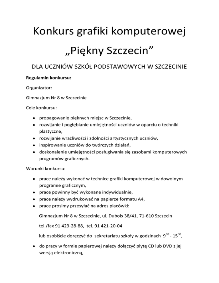 Konkurs grafiki komputerowej „Piękny Szczecin” DLA UCZNIÓW SZKÓŁ PODSTAWOWYCH W SZCZECINIE Regulamin konkursu: Organizator: Gimnazjum Nr 8 w Szczecinie Cele konkursu: propagowanie pięknych miejsc w Szczecinie, rozwijanie i pogłębianie umiejętności uczniów w oparciu o techniki plastyczne, rozwijanie wrażliwości i zdolności artystycznych uczniów, inspirowanie uczniów do twórczych działao, doskonalenie umiejętności posługiwania się zasobami komputerowych programów graficznych. Warunki konkursu: prace należy wykonad w technice grafiki komputerowej w dowolnym programie graficznym, prace powinny byd wykonane indywidualnie, prace należy wydrukowad na papierze formatu A4, prace prosimy przesyład na adres placówki: Gimnazjum Nr 8 w Szczecinie, ul. Dubois 38/41, 71-610 Szczecin tel./fax 91 423-28-88, tel. 91 421-20-04 lub osobiście doręczyd do sekretariatu szkoły w godzinach 900 - 1500, do pracy w formie papierowej należy dołączyd płytę CD lub DVD z jej wersją elektroniczną, termin nadsyłania prac konkursowych upływa 26 marca 2014 r. prace dostarczone po terminie nie będą brane pod uwagę, dodatkowe informacje: e-mail: [email protected] na płycie należy umieścid informacje w formacie PDF: Lp Imię i nazwisko uczestnika konkursu Wiek Klasa Nazwa szkoły, dokładny adres, telefon kontaktowy, e-mail Nazwisko i imię nauczyciela prowadzącego 1. Łączna ilośd prac: ……………………. Podpis nauczyciela zgłaszającego uczniów do udziału w konkursie …………………… nauczyciel informatyki lub opiekun powinien potwierdzid autentycznośd prac na kartce dołączonej do przesyłki, organizatorzy zastrzegają sobie prawo do zatrzymania prac nadesłanych na konkurs bez konieczności ich zwrotu, przewidziane są atrakcyjne nagrody dla laureatów, wyniki konkursu zostaną opublikowane na stronie internetowej szkoły: gimnazjum.szczecin.pl, finał konkursu z udziałem laureatów i rozdanie nagród nastąpi w dniu 31.03.2014 roku podczas Dnia Otwartego Gimnazjum Nr 8 w Szczecinie, laureaci konkursu zostaną powiadomieni drogą e-mailową lub telefonicznie o czasie uroczystego wręczenia nagród i wyróżnieo. Organizator Gimnazjum Nr 8 w Szczecinie