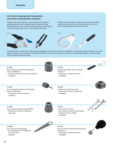 Narzędzia Coś równie ważnego jak komponenty rowerowe: profesjonalne narzędzia. Prawdę mówiąc, rower składa się z wielu elementów. Do osiągnięcia optymalnego poziomu pracy każdego elementu niezbędna jest jego odpowiednia konserwacja. Narzędzia serwisowe Shimano charakteryzują się wysoką precyzją, użytecznością, a także jednolitą konstrukcją. W Shimano robimy wszystko co możliwe, aby stworzyć profesjonalne narzędzia przeznaczone nie tylko dla produktów Shimano, ale po prostu do kompleksowego serwisowania rowerów. TL-CT12 TL-FC36 Narzędzia Shimano są stworzone tak, aby doskonale pasowały do części Shimano. Wypusty na narzędziach są idealnie dopasowane do kształtu części. Nasze najnowsze srebrne i czarne narzędzia (TL-HS33/34/35/37/38/40, TL-FC 36) są wycinane laserem, dzięki czemu są perfekcyjnie gładkie, co z kolei zmniejsza ryzyko uszkodzenia elementów roweru. TL-LR10 TL-FC36 Klucz do demontażu pierścienia blokującego kasetę i CENTERLOCK __Zastosowanie: pierścień do klucza nasadowego Narzędzia do instalacji misek osi suportu Hollowtec II __Zastosowanie: mechanizm korbowy __Y12009220 __Y13098000 TL-LR15 TL-FC33 Klucz do demontażu pierścienia blokującego kasetę i CENTERLOCK __Zastosowanie: do klucza płaskiego Narzędzia do instalacji osi suportu __Zastosowanie: do klucza nasadowego __Y13009230 __Y12009230 TL-LR20 TL-FC31 Klucz do pierścienia blokującego HB-M800 __Zastosowanie: do klucza nasadowego 2 klucze płaskie (TL-FC31) __Do osi suportu Octalink do mechanizmów korbowych, sterów i pedałów __Y25U15000 __Y13098100 32 TL-HG09 TL-FC18 Klucz do pierścienia blokującego __Do mechanizmów XTR FC-M950/952 oraz XT FC-M750 Klucz do montażu śruby kontrującej korby typu Hollowtech II __Zastosowanie: mechanizm korbowy __YIZ702000 __Y13098280 TL-FC16 TL-BB13 Klucz do montażu śruby kontrującej __Do mechanizmów korbowych Hollowtec II Klucz do demontażu misek Press Fit __Zastosowanie: klucz do demontażu wciskanych misek suportu __Y13009220 __Y13098260 TL-FC11 TL-RD11 Ściągacz Mechanizmu Korbowego __Zastosowanie: mechanizm korbowy Klucz do prostowania haka ramy __Y13098270 __Y13098210 TL-FC21 TL-PD63 Klucz do śrub mocujących tarcze mechanizmu korbowego __Zastosowanie: mechanizm korbowy Klucz do regulacji osi pedałów __Zastosowanie: pedał __Y46098630 __Y13009700 TL-FC22 TL-PD33 Klucz do śrub mocujących tarcze mechanizmu korbowego __Zastosowanie: mechanizm korbowy Klucz do regulacji osi pedałów PD-M324 __Zastosowanie: pedał __Y41N98040 __Y13098240 TL-FC23 TL-MH10 Sześciokątny klucz T-30 / w kształcie litery T __Zastosowanie: mechanizm korbowy Klucz nasadowy __do narzędzi, TL-FC33 / LR10 / UN65 / LR20 __Y13098230 __Zastosowanie: korba / CS / pierścień blokujący __Y13098290 TL-BB12 TL-PD40 Klucz do montażu misek Press Fit __Zastosowanie: klucz do instalacji wciskanych misek suportu Klucz do demontażu osi __Zastosowanie: pedał __Y42A09000 __Y13098250 33 Narzędzia TL-UN66 Klucz do demontażu osi suportu __do pakietu suportu __Zastosowanie: oś suportu __Y13009075 TL-SR21 / klucz do demontażu kasety __dla 7/8/9/10 rzędów __Zastosowanie: klucz do demontażu kasety TL-SR22 / klucz do demontażu tylnej koronki __dla łańcucha o szerokości 1/8 cala __Zastosowanie: klucz do demontażu koronek torowych TL-UN74-S TL-8S20 Klucz do demontażu osi suportu __Zastosowanie: oś suportu Klucz do montażu prawego stożka __Zastosowanie: piasta INTER-8 __Y13009073 __Y70800200 TL-8S11 TL-8S30 Klucz do demontażu prawego stożka __Zastosowanie: piasta INTER-8 Klucz do regulacji piasty __Zastosowanie: piasta INTER-8 __Y70800600 __Y70800300 TL-CT12 TL-HA20 Obcinaczki do linek i pancerzy __Y09898010 Klucz do montażu łożysk __do typu SAINT __Y25U14000 TL-FW30 TL-FW40 Klucz do demontażu wolnobiegu __Y12009050 Klucz do montażu łożysk __Zastosowanie: klucz do montażu łożysk do typu SAINT __Y1200904T 34 TL-SR21: Y12189000 TL-SR22: Y12189010 TL-HS33: Y23098000 TL-FW45 TL-HS33 / klucz do piasty (13 mm) Klucz do demontażu wolnobiegu jednorzędowego __Zastosowanie: 4 wypusty do BMX. Klucz do wolnobiegu TL-HS34 / klucz do piasty (14 mm) __Y12009150 TL-HS35 / klucz do piasty (15 mm) TL-HS35: Y23098010 TL-HS36: Y23098020 TL-HS37 / klucz do piasty (17 mm) TL-HS38 / klucz do piasty (18 mm) TL-HS37: Y23098030 TL-HS38: Y23098040 TL-CN27 TL-HS40 Wyciskacz do łańcucha __wersja standardowa Regulacja stożka i klucz do pedału, 20 mm __Zastosowanie: stożek piasty i pedał __Y13098180 __Y13098320 TL-CN33 TL-HS21 / klucz do piasty (15 mm x 23 mm) __do FH-M800 Profesjonalny wyciskacz łańcucha _ Wysokiej jakości narzędzie serwisowe _ Powiększone dźwignie dla większego komfortu i precyzji _ Dwa zapasowe piny, chowane w uchwycie _ Do zastosowania z HG-X, HG, IG i UG (6/7/8/9/10 rzędów) _ Y13098490 TL-HS22 / klucz do piasty (17 mm x 24 mm) __do FH-M800 TL-HS21: Y3C228000 TL-HS22: Y3C227000 TL-HS23: Y20W04000 TL-HS23 / klucz do piasty (18 mm x 28 mm) TL-HB16 TL-BT03 Adapter do centrowania kół z osiami 15 i 20 mm __Y20W98020 Profesjonalny zestaw do odpowietrzania hamulców hydraulicznych _ Odpowiedni do systemów starego i nowego typu _ Zaciski wężyka zabezpieczają go przy zaworze odpowietrzającym _ Zestaw zawiera: strzykawkę, lejek, zacisk, butelkę, 2 zaciski wężyka _ Y8H498040 TL-CN41 TL-BT03-S Sprawdzanie zużycia łańcucha __Zastosowanie: sprawdzanie łańcucha Zestaw do odpowietrzania hamulców hydraulicznych _ Podstawowy zestaw do systemów z lejkiem _ Zacisk zabezpieczający wężyk przy zaworze odpowietrzającym _ Zestaw zawiera: strzykawkę, lejek, zacisk wężyka _ Y8H498050 __Y12152000 35