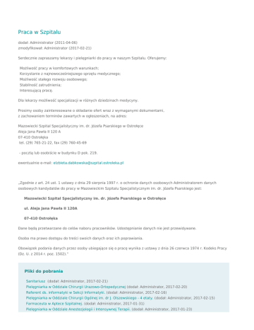 Praca w Szpitalu dodał: Administrator (2011-04-06) zmodyfikował: Administrator (2017-02-21) Serdecznie zapraszamy lekarzy i pielęgniarki do pracy w naszym Szpitalu. Oferujemy: Możliwość pracy w komfortowych warunkach; Korzystanie z najnowocześniejszego sprzętu medycznego; Możliwość stałego rozwoju osobowego; Stabilność zatrudnienia; Interesującą pracę. Dla lekarzy możliwość specjalizacji w różnych dziedzinach medycyny. Prosimy osoby zainteresowane o składanie ofert wraz z wymaganymi dokumentami, z zachowaniem terminów zawartych w ogłoszeniach, na adres: Mazowiecki Szpital Specjalistyczny im. dr. Józefa Psarskiego w Ostrołęce Aleja Jana Pawła II 120 A 07-410 Ostrołęka tel. (29) 765-21-22, fax (29) 760-45-69 - pocztą lub osobiście w budynku D pok. 219. ewentualnie e-mail: [email protected] „Zgodnie z art. 24 ust. 1 ustawy z dnia 29 sierpnia 1997 r. o ochronie danych osobowych Administratorem danych osobowych kandydatów do pracy w Mazowieckim Szpitalu Specjalistycznym im. dr. Józefa Psarskiego jest: Mazowiecki Szpital Specjalistyczny im. dr. Józefa Psarskiego w Ostrołęce ul. Aleja Jana Pawła II 120A 07-410 Ostrołęka Dane będą przetwarzane do celów naboru pracowników. Udostępnianie danych nie jest przewidywane. Osoba ma prawo dostępu do treści swoich danych oraz ich poprawiania. Obowiązek podania danych przez osoby ubiegające się o pracę wynika z ustawy z dnia 26 czerwca 1974 r. Kodeks Pracy (Dz. U. z 2014 r. poz. 1502).” Pliki do pobrania Sanitariusz (dodał: Administrator, 2017-02-21) Pielęgniarka w Oddziale Chirurgii Urazowo-Ortopedycznej (dodał: Administrator, 2017-02-20) Referent ds. informatyki w Sekcji Informatyki. (dodał: Administrator, 2017-02-16) Pielęgniarka w Oddziale Chirurgii Ogólnej im. dr J. Olszewskiego - 4 etaty. (dodał: Administrator, 2017-02-15) Farmaceuta w Aptece Szpitalnej. (dodał: Administrator, 2017-01-31) Pielęgniarka w Oddziale Anestezjologii i Intensywnej Terapii. (dodał: Administrator, 2017-01-23) Inspektor ds. planowania, analiz, kosztów i cen w Samodzielnej Sekcji Ekonomicznej. (dodał: Administrator, 2017-01-11) Główny księgowy. (dodał: Administrator, 2017-01-05) Lekarz (młodszy asystent) w Oddziale Obserwacyjno- Zakaźnym (2 etaty). (dodał: Administrator, 2017-01-05)