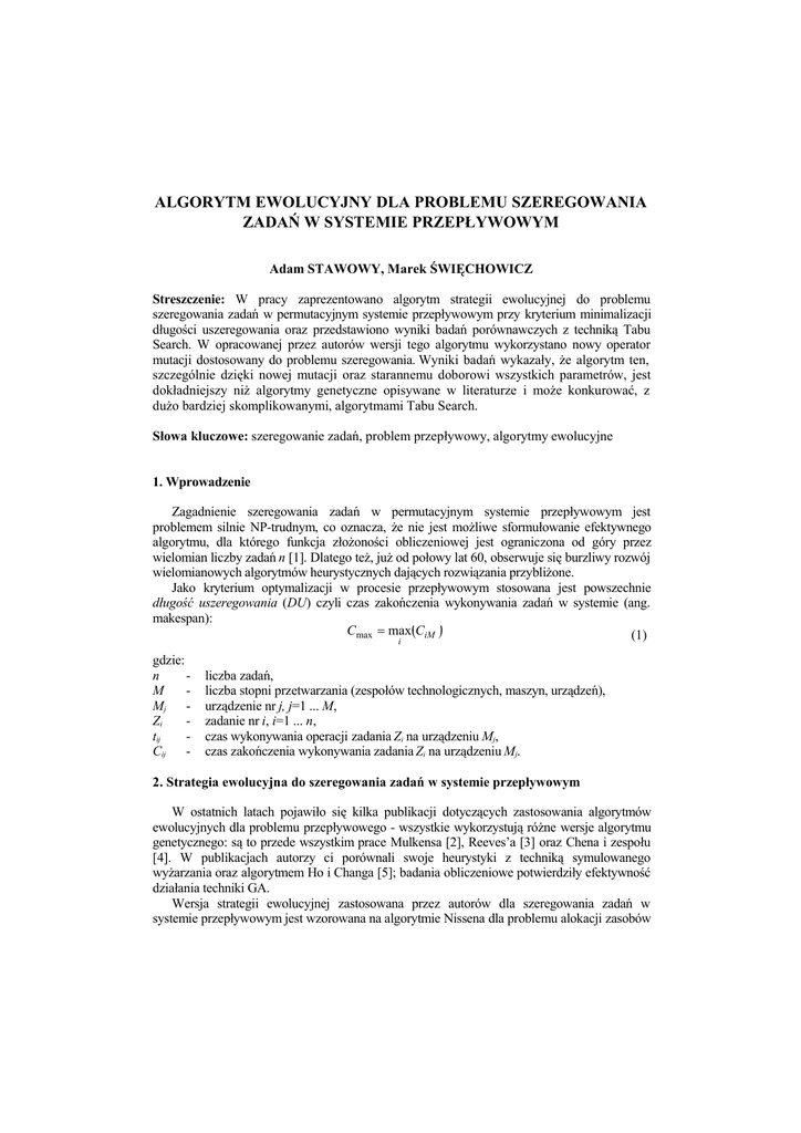 Słowa kluczowe: szeregowanie zadań, problem przepływowy, algorytmy ewolucyjne