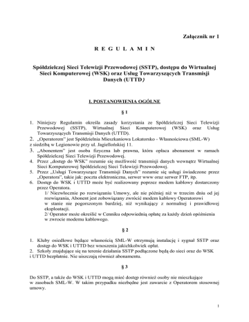 Załącznik nr 1 R E G U L A M I N Spółdzielczej Sieci Telewizji Przewodowej (SSTP), dostępu do Wirtualnej Sieci Komputerowej (WSK) oraz Usług Towarzyszących Transmisji Danych (UTTD) I. POSTANOWIENIA OGÓLNE §1 1. Niniejszy Regulamin określa zasady korzystania ze Spółdzielczej Sieci Telewizji Przewodowej (SSTP), Wirtualnej Sieci Komputerowej (WSK) oraz Usług Towarzyszących Transmisji Danych (UTTD). 2. „Operatorem” jest Spółdzielnia Mieszkaniowa Lokatorsko - Własnościowa (SML-W) z siedzibą w Legionowie przy ul. Jagiellońskiej 11. 3. „Abonentem” jest osoba fizyczna lub prawna, która opłaca abonament w ramach Spółdzielczej Sieci Telewizji Przewodowej. 4. Przez „dostęp do WSK” rozumie się możliwość transmisji danych wewnątrz Wirtualnej Sieci Komputerowej Spółdzielczej Sieci Telewizji Przewodowej. 5. Przez „Usługi Towarzyszące Transmisji Danych” rozumie się usługi świadczone przez „Operatora”, takie jak: poczta elektroniczna, serwer www oraz serwer FTP, itp. 6. Dostęp do WSK i UTTD może być realizowany poprzez modem kablowy dostarczony przez Operatora. 1/ Niezwłocznie po rozwiązaniu Umowy, ale nie później niż w trzecim dniu od jej rozwiązania, Abonent jest zobowiązany zwrócić modem kablowy Operatorowi w stanie nie pogorszonym bardziej, niż wynikający z normalnej i prawidłowej eksploatacji. 2/ Operator może określić w Cenniku odpowiednią opłatę za każdy dzień opóźnienia w zwrocie modemu kablowego. §2 1. Kluby osiedlowe będące własnością SML-W otrzymują instalację i sygnał SSTP oraz dostęp do WSK i UTTD bez wnoszenia jakichkolwiek opłat. 2. Szkoły znajdujące się na terenie działania SSTP podłączone będą do sieci oraz do WSK i UTTD bezpłatnie. Nie uiszczają również abonamentu. §3 Do SSTP, a także do WSK i UTTD mogą mieć dostęp również osoby nie mieszkające w zasobach SML-W. W takim przypadku niezbędne jest zawarcie z Operatorem stosownej umowy. 1 §4 SSTP, WSK i UTTD utrzymywane są wyłącznie z abonamentów. II. ZASADY UŻYTKOWANIA SSTP, WSK i UTTD §5 1. Operator świadczy usługi polegające na dostarczaniu do Abonentów programów radiowych i telewizyjnych oraz dostępu do Internetu za pośrednictwem sieci Operatora. 2. Za korzystanie z SSTP, WSK i UTTD Abonent płaci miesięczny abonament pokrywający ponoszone koszty eksploatacji sieci, w tym m. in. wszelkie opłaty związane z reemitowaniem programów radiowych i telewizyjnych, dostawę łącza Internetowego oraz obsługę serwisową. Ponadto miesięczny abonament za korzystanie z WSK jest zróżnicowany w zależności od rodzaju zawartej umowy ( umowa na czas nieokreślony, umowa na czas określony ) oraz okresu trwania umowy na czas określony. 3. Zakres usług świadczonych przez Operatora zależy od wysokości opłacanego abonamentu. 4. Zmiana wysokości abonamentu może nastąpić za uprzednim powiadomieniem Abonenta, co najmniej 30. dni przed planowanym terminem jej wprowadzenia. 5. Za zwłokę w zapłacie abonamentu naliczane będą odsetki ustawowe. 6. Wniesienie przez Abonenta opłaty abonamentowej za okres dłuższy, niż określony w Umowie, nie zwalnia go od obowiązku dopłaty z tytułu ewentualnego wzrostu opłaty abonamentowej, który nastąpił po jej wniesieniu. 7. W przypadku nie uiszczenia przez Abonenta abonamentu, Operator wzywa Abonenta do zapłaty zaległej opłaty, wyznaczając termin zapłaty. Po bezskutecznym upływie terminu zapłaty, Operator może zablokować dostęp do WSK i UTTD lub/i odłączyć instalację telewizji kablowej. 8. Ponowne uruchomienie SSTP i/lub WSK i/lub UTTD może nastąpić dopiero po uregulowaniu zaległych należności wraz z odsetkami i uiszczeniu opłaty instalacyjnej zgodnie z cennikiem Operatora. 9. Abonent zobowiązany jest do uiszczania abonamentu niezależnie od tego, czy korzysta z usług Operatora, czy też nie. 10. Umowa na korzystanie z WSK zawarta na czas określony po upływie tego okresu ulega przedłużeniu na czas nieokreślony, chyba że jedna ze stron umowy na co najmniej 1 miesiąc przed końcową datą okresu na jaki została zawarta umowa złoży oświadczenia o jej wypowiedzeniu lub nieprzedłużaniu umowy. W razie przedłużenia umowy na korzystanie z WSK na czas nieokreślony należne od Abonenta opłaty będą pobierane w wysokości wynikającej z cennika Operatora dla umów na czas nieokreślony. §6 1. Wszelkie usługi dotyczące podłączenia do SSTP i/lub WSK i/lub UTTD wykonują służby serwisowe Operatora. 2. Serwis Operatora wykonuje obsługę Abonentów, w szczególności w zakresie: 1/ podejmowania działań interwencyjnych i usuwania niesprawności funkcjonowania sieci w razie nieprawidłowego funkcjonowania sieci. 2/ informacji dotyczących usług oraz funkcjonowania sieci. 3/ reklamacji dotyczących niewłaściwego funkcjonowania usług. 2 3. 4. 4/ dokonywania zmian dotyczących usług, Abonentów lub danych o Abonentach. Abonent nie może dokonywać we własnym zakresie jakichkolwiek przeróbek związanych z instalacją SSTP i/lub WSK i/lub UTTD. Abonent nie może udostępniać sygnału osobom trzecim. §7 1. W razie nieprawidłowego funkcjonowania sieci Operator zobowiązany jest podjąć działania interwencyjne i usunąć niesprawności funkcjonowania sieci. 2. Usunięcie usterki w odbiorze SSTP i/lub WSK i/lub UTTD powinno nastąpić nie później niż w ciągu 48 godzin od zgłoszenia usterki, jeżeli dotyczy to jednego budynku. 3. Usterki w odbiorze obejmujące swym zasięgiem więcej niż jeden budynek, będą usuwane najpóźniej w terminie 4 dni od zgłoszenia. 4. W uzasadnionych przypadkach Operator zobowiązany jest do zwrotu Abonentowi części uiszczonej przez niego opłaty abonamentowej, w kwocie odpowiadającej iloczynowi: liczby dni przerwy w świadczeniu usługi i 1/30 uiszczonej przez Abonenta opłaty abonamentowej albo pomniejszenia w tych samych granicach opłaty abonamentowej należnej za następny miesiąc. 5. Użytk