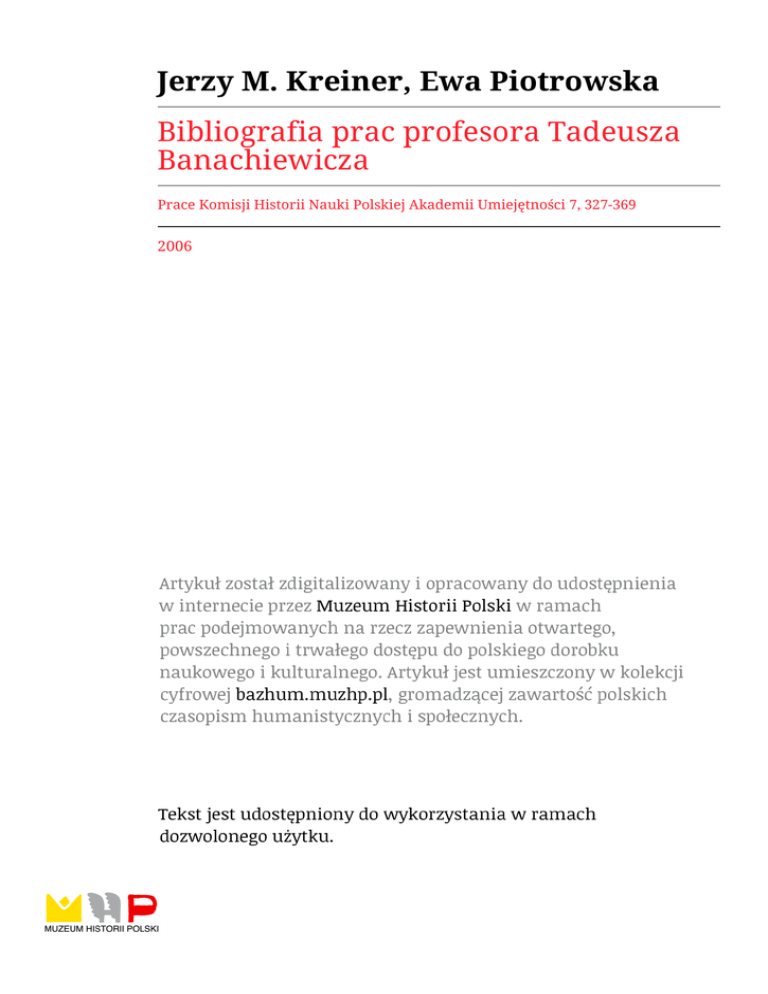 Jerzy M. Kreiner, Ewa Piotrowska Bibliografia prac profesora Tadeusza Banachiewicza Prace Komisji Historii Nauki Polskiej Akademii Umiejętności 7, 327-369 2006 POLSKA AK AD EM IA UMIEfĘTNOŚCI Tom VII P R A C E KOMISJI HISTORII N A U K I 2005 Jerzy M . K R E IN E R E w a P IO T R O W S K A BIBLIOGRAFIA PRAC PROFESORA T A D E U S Z A BA NA CHIEW ICZA P ięćd ziesiątą ro czn icę śm ierci w ielk ieg o polskiego a stro n o m a i m a te m a ty ka Profesora T ad eu sza B anach iew icza Polska A k a d em ia U m iejętności u czci ła z o rg a n iz o w a n ie m w ro k u 2004 pośw ięcon ej M u sesji naukow ej, a M u z e u m U n iw e rsy te tu Jagielloń skieg o - w y sta w y Observo ergo sum, obejm ującej fotografie, d o k u m e n ty i p rz e d m io ty z w ią z a n e z Jego d ziałaln o ścią. M ateriały b io graficzne z ty ch im p re z o p u b lik o w a n e z o s ta n ą p rz e z Polską A k a d em ię U m iejętności w to m ie p o św ięc o n y m P ro feso ro w i w serii w y d a w n ic ze j PAU W służbie nauki, n a to m ia st w a rty k u le ty m p rz e d s ta w ia m y b ibliografię prac Profesora. Z e b ra n o w niej info rm acje o p u b lik acjach T ad eusza B anachiew icza, z a ró w n o o c h a ra k te rz e n a u k o w y m , jak też p o p u la rn o n a u k o w y m . Do bibliografii d o łąc zo no ró w n ie ż p ozycje o c h a ra k te rz e sp ra w o z d a ń , k o m u n ik a tó w o rg a n izacy jn y ch , w ty m a rty k u ły n ie z w ią z a n e ściśle z a stro n o m ią . U zu p e łn ie n ie m p racy jest w y b ó r a rty k u łó w o T ad eu szu B an achiew iczu, o m aw iających p o stać w ielkiego a s tro n o m a o raz jego d o ro b e k n au ko w y. P o d sta w ą b ib lio g rafii była k w e re n d a bib lio teczna, w której d o k o n a n o p rz e g ląd u p o d sta w o w y c h c z a so p ism a stro n o m ic z n y c h , p rz e d e w sz y stk im ro c z n i k ów Jahresbericht (lata 1901-1960), b ęd ący ch głó w n y m źró d łe m b ib liograficznym . S zczeg ó ln ą u w ag ę z w ró c o n o n a ro c z n ik i Astronomische Nachrichten z lat 19001960, g d z ie w latach 1903-1918 u k a z a ła się z n a c z n a część a rty k u łó w i k o m u n i katów n a u k o w y c h pióra T adeu sza B anach iew icza, o ra z czaso p ism o Wszechświat, w k tó ry m w latach 1905-1912 U czony o p u b lik o w ał blisko 130 a rty k u łó w p o p u la rn o n a u k o w y c h . Z n alezio n e o d n o ś n ik i d o prac T. B anachiew icza (o ile to było m ożliw e) w ery fik o w a n o w o ry g in a ln y c h źró d łach . D o d atk o w o w y k a z p u b li kacji T. B an ach iew icza z o sta ł sk o n tro lo w a n y w Bibliografii prac astronomów poi- 328 JERZY M. KREINER, EWA PIOTROW SKA skich za lała 1923-1963, op raco w an ej p rz e z Iw onę K o rzen iew sk ą (w yd. Polskie T o w arzy stw o A stro n o m ic z n e , W arszaw a 1964). Isto tn ą p o m o cą w k o n tro li s p o rząd zo n ej biblio grafii było n ie p u b lik o w a n e z e staw ie n ie w aż n iejszy c h p ra c T adeu sza B an achiew icza, sp o rz ą d z o n e n a p o cz ątk u lat sze śćd z iesią ty ch p rz e z śp. Jad w igę K o rdy lew ską i późn iej częściow o u z u p e łn io n e p rz e z m gr. B artłom ieja Z ak rzew sk ieg o . P ocząw szy od ro k u 1920, z d e c y d o w a n a w iększość prac T. B an ach iew icza u k a z y w a ła się w c z a so p ism a c h p rz e z nieg o założonych i w y d a w a n y c h w K ra k o w ie p rz e z O b se rw a to riu m A stro n o m ic z n e U n iw ersy te tu Jagiellońskiego. W śród tych p e rio d y k ó w były: • Acta Astronomica, c z a so p ism o n a u k o w e o zasięg u o g ó ln o św ia to w y m , z a łożone w ro k u 1925. W latach 1925-39 o ra z 1946-56 u k a z y w a ło się n ie re g u la rn ie w trze c h se ria c h (a, b, c). P o cząw szy o d ro k u 1956 (tom 6), Acta Astronomica stało się k w a rta ln ik ie m n a u k o w y m bez p o d z ia łu n a serie. W 1961 ro k u red a k cję p rz e n iesio n o do W arszaw y ; • Rocznik Astronom iczny Obserwatorium Krakowskiego, k tó reg o u k a z a ło się 5 n u m eró w obejm ujących lata 1922-1925 o ra z rok 1928; • Calendarium Rocznika Astronomicznego Obserwatorium Krakowskiego (za w iera jące p o d sta w o w e tablice astro n o m ic z n e ) n a rok 1926 o ra z 1927; • Rocznik Astronom iczny Obserwatorium Krakowskiego - Dodatek M iędzynarodowy (S u p p lem en to In te rn . D e A n n u a rio C racoviense [SAC]), u k az u jąc y się w latach 1923-2003 (74 tom y) i zaw ierający w sw ej głów nej części tzw . efem erydy, czyli p rz e w id y w a n e m o m e n ty m in im ó w g w ia z d zaćm ieniow ych; • Okólnik Obserwatorium Krakowskiego (C irculaire de l'O b se rv ato ire d e Cracovie), u k a z u ją c y się w latach 1920-1930. Ł ącznie w y d a n o 26 n u m eró w , z a w ie rających g łó w n ie k ró tk ie k o m u n ik a ty i d o n ie sien ia n au k o w e. P ierw szy ch 9 n u m eró w Okólnika u k a z a ło się w b a rd z o m a ły m n a k ła d z ie n a p ra w a c h ręk o p isu ; • M ały Okólnik Obserwatorium Krakowskiego (Petite C irc u la ire d e l'O b se rv a to ire de C racovie) z d n . 26 I I I 1930-24 V 1930 (4 num ery). P ełną listę p u b lik acji T. B anach iew icza z a p re z e n to w a n o c h ro n o lo g icz n ie w e d łu g lat, w k tó ry ch się u k a z y w a ły . W ra m a c h d a n e g o ro k u p u b lik acje p o d z ie lo n o na: • p race n au k o w e; • k o m u n ik a ty , obserw acje, telegram y; • a rty k u ły i k o m u n ik a ty p o p u la rn o n a u k o w e ; • p o lem ik i, recenzje, sp ra w o z d a n ia ; • in fo rm a c je o p ra c a c h w sp ó łp raco w n ik ó w , p rz y c z y m w ra m a c h d a n e g o d z ia łu ty tu ły p ra c u m ie sz c z o n o w p o rz ą d k u a l fa b e ty c z n y m . Jeśli w d a n y m ro k u n ie u k a z a ła się ż a d n a p ra ca z d a n e g o d z ia łu , n a g łó w e k te