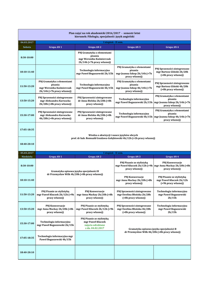 Plan zajęć na rok akademicki 2016/2017 - semestr letni kierunek: Filologia, specjalność: język angielski I stopień - II sem. 04.03.2017 Sobota Grupa AN 1 Grupa AN 2 Grupa AN 3 Grupa AN 4 8:30-10:00 PNJ Gramatyka z elementami pisania mgr Weronika Kaźmierczak 2h/14h (+7h pracy własnej) 10:10-11:40 Technologia informacyjna mgr Paweł Boguszewski 2h/15h PNJ Gramatyka z elementami pisania mgr Joanna Szkop 2h/14h (+7h pracy własnej) PNJ Sprawności zintegrowane mgr Bartosz Gliński 2h/28h (+8h pracy własnej) PNJ Gramatyka z elementami pisania mgr Joanna Szkop 4h/14h (+7h pracy własnej) PNJ Sprawności zintegrowane mgr Bartosz Gliński 4h/28h (+8h pracy własnej) 11:50-13:20 PNJ Gramatyka z elementami pisania mgr Weronika Kaźmierczak 2h/14h (+7h pracy własnej) Technologia informacyjna mgr Paweł Boguszewski 4h/15h 13:50-15:20 PNJ Sprawności zintegrowane mgr Aleksandra Karwacka 2h/28h (+8h pracy własnej) PNJ Sprawności zintegrowane dr Anna Bielska 2h/28h (+8h pracy własnej) PNJ Gramatyka z elementami Technologia informacyjna pisania mgr Paweł Boguszewski 2h/15h mgr Joanna Szkop 2h/14h (+7h pracy własnej) 15:30-17:00 PNJ Sprawności zintegrowane mgr Aleksandra Karwacka 4h/28h (+4h pracy własnej) PNJ Sprawności zintegrowane dr Anna Bielska 4h/28h (+8h pracy własnej) PNJ Gramatyka z elementami Technologia informacyjna pisania mgr Paweł Boguszewski 4h/15h mgr Joanna Szkop 4h/14h (+7h pracy własnej) 17:05-18:35 Wiedza o akwizycji i nauce języków obcych prof. dr hab. Romuald Gozdawa-Gołębiowski 4h/12h (+2h pracy własnej) 18:40-20:10 05.03.2017 Niedziela I stopień - II sem. Grupa AN 1 Grupa AN 2 8:30-10:00 Gramatyka opisowa języka specjalności B dr Przemysław Wilk 4h/20h (+8h pracy własnej) 10:10-11:40 Grupa AN 3 Grupa AN 4 PNJ Pisanie ze stylistyką PNJ Konwersacje mgr Paweł Kluczek 2h/12h (+9h mgr Anna Mackay 2h/20h (+8h pracy własnej) pracy własnej) PNJ Konwersacje mgr Anna Mackay 2h/20h (+8h pracy własnej) PNJ Pisanie ze stylistyką mgr Paweł Kluczek 2h/12h (+9h pracy własnej) 11:50-13:20 PNJ Pisanie ze stylistyką mgr Paweł Kluczek 2h/12h (+9h pracy własnej) PNJ Konwersacje mgr Anna Mackay 2h/20h (+8h pracy własnej) PNJ Sprawności zintegrowane mgr Ewelina Błońska 2h/28h (+8h pracy własnej) Technologia informacyjna mgr Paweł Boguszewski 2h/15h 13:50-15:20 PNJ Konwersacje mgr Anna Mackay 2h/20h (+8h pracy własnej) PNJ Pisanie ze stylistyką mgr Paweł Kluczek 2h/12h (+9h pracy własnej) PNJ Sprawności zintegrowane mgr Ewelina Błońska 4h/28h (+8h pracy własnej) Technologia informacyjna mgr Paweł Boguszewski 2h/15h 15:30-17:00 Technologia informacyjna mgr Paweł Boguszewski 2h/15h PNJ Pisanie ze stylistyką mgr Paweł Kluczek zajęcia odrabiane z dn. 04.02.2017 17:05-18:35 18:40-20:10 Technologia informacyjna mgr Paweł Boguszewski 4h/15h Gramatyka opisowa języka specjalności B dr Przemysław Wilk 4h/20h (+8h pracy własnej) Plan zajęć na rok akademicki 2016/2017 - semestr letni kierunek: Filologia, specjalność: język angielski 18.03.2017 Sobota I stopień - II sem. Grupa AN 1 Grupa AN 2 8:30-10:00 PNJ Sprawności zintegrowane mgr Aleksandra Karwacka 6h/28h (+8h pracy własnej) PNJ Gramatyka z elementami pisania mgr Weronika Kaźmierczak 4h/14h (+7h pracy własnej) Grupa AN 3 Grupa AN 4 10:10-11:40 PNJ Sprawności zintegrowane mgr Aleksandra Karwacka 8h/28h (+4h pracy własnej) Technologia informacyjna mgr Paweł Boguszewski 6h/15h PNJ Gramatyka z elementami pisania mgr Joanna Szkop 6h/14h (+7h pracy własnej) PNJ Sprawności zintegrowane mgr Bartosz Gliński 6h/28h (+8h pracy własnej) 11:50-13:20 PNJ Gramatyka z elementami pisania mgr Weronika Kaźmierczak 4h/14h (+7h pracy własnej) Technologia informacyjna mgr Paweł Boguszewski 8h/15h PNJ Gramatyka z elementami pisania mgr Joanna Szkop 8h/14h (+7h pracy własnej) PNJ Sprawności zintegrowane mgr Bartosz Gliński 8h/28h (+8h pracy własnej) 13:50-15:20 PNJ Pisanie ze stylistyką mgr Paweł Kluczek 4h/12h (+9h pracy własnej) PNJ Sprawności zintegrowane dr Anna Bielska 6h/28h (+8h pracy własnej) PNJ Gramatyka z elementami Technologia informacyjna pisania mgr Paweł Boguszewski 6h/15h mgr Joanna Szkop 6h/14h (+7h pracy własnej) PNJ Sprawności zintegrowane dr Anna Bielska 8h/28h (+8h pracy własnej) PNJ Gramatyka z elementami Technologia informacyjna pisania mgr Paweł Boguszewski 8h/15h mgr Joanna Szkop 8h/14h (+7h pracy własnej) 15:30-17:00 PNJ Pisanie ze stylistyką mgr Paweł Kluczek 4h/12h (+9h pracy własnej) 17:05-18:35 Technologia informacyjna mgr Paweł Boguszewski 8h/15h 18:40-20:10 19.03.2017 Niedziela Technologia informacyjna mgr Paweł Boguszewski 6h/15h I stopień - II sem. Grupa AN 1 Grupa AN 2 Grupa AN 3 Grupa AN 4 8:30-10:00 Fonetyka praktyczna języka specjalności dr Leszek Biedrzycki 2h/10h (+4h pracy własnej) Fonetyka praktyczna języka specjalności mgr Marek Biedrzycki 2h/10h (+4h pracy własnej) PNJ Konwersacje mgr Anna Mackay 4h/20h (+8h pracy własnej) PNJ Pisanie ze stylistyką mgr Paweł Kluczek 4h/12h (+9h pracy własnej) 10:10-11:40 PNJ Konwersacje mgr Anna Mackay 4h/20h (+8h pracy własnej) PNJ Pisanie ze stylistyką mgr Paweł Kluczek 4h/12h (+9h pracy własnej) Fonetyka praktyczna języka specjalności dr Leszek Biedrzycki 2h/10h (+4h pracy własnej) Fonetyka praktyczna języka specjalności mgr Marek Biedrzycki 2h/10h (+4h pracy własnej) 11:50-13:20 Wstęp do literaturoznawstwa dr Tomasz Ososiński 4h/10h (+2h pracy własnej) 13:50-15:20 15:30-17:00 17:05-18:35 18:40-20:10 Gramatyka opisowa języka specjalności B dr Przemysław Wilk 6h/20h (+8h pracy własnej) PNJ Konwersacje mgr Anna Mackay 4h/20h (+8h pracy własnej) PNJ Sprawności zintegrowane mgr Ewelina Błońska 6h/28h (+8h pracy własnej) PNJ Konwersacje mgr Anna Mackay 4h/20h (+8h pracy własnej) Gramatyka opisowa języka specjalności B dr Przemysław Wilk 6h/20h (+8h pracy własnej) Plan zajęć na rok akademicki 2016/2017 - semestr letni kierunek: Filologia, specjalność: język angiels