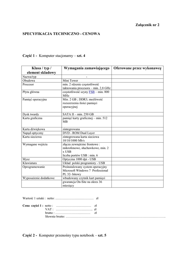 Załącznik nr 2 SPECYFIKACJA TECHNICZNO - CENOWA Część 1 - Komputer stacjonarny – szt. 4 Klasa / typ / element składowy Nazwa/typ Obudowa Procesor Płyta główna Pamięć operacyjna Wymagania zamawiającego Mini Tower min. 2 rdzenie częstotliwość taktowania procesora – min. 2,8 GHz częstotliwość szyny FSB – min. 800 MHz Min. 2 GB ; DDR3; moŜliwość rozszerzenia ilości pamięci operacyjnej Dysk twardy Karta graficzna SATA II – min. 250 GB pamięć karty graficznej – min. 512 MB Karta dźwiękowa Napęd optyczny Karta sieciowa zintegrowana DVD - ROM Dual Layer zintegrowana karta sieciowa 10/10/1000 Mb/s złącza zewnętrzne frontowe : mikrofonowe, słuchawkowe, min. 2 x USB liczba portów USB : min. 6 Optyczna 1000 dpi - USB Układ polski programisty - USB Preinstalowany system operacyjny Microsoft Windows 7 Professional PL 32- bitowy wbudowany czytnik kart pamięci gwarancja On-Site na okres 36 miesięcy Wymagane wejścia Mysz Klawiatura Oprogramowanie WyposaŜenie dodatkowe Oferowane przez wykonawcę Wartość 1 sztuki : netto: ……………………………… zł Cena części 1 : netto : …………………………… zł VAT : …………………………….. zł brutto : …………………………… zł Słownie brutto: …………………………………………………………………………………. Część 2 - Komputer przenośny typu notebook – szt. 5 Klasa / typ / element składowy Wymagania zamawiającego Nazwa/ typ Procesor Pamięć operacyjna Dysk twardy Ekran Karta graficzna Karta dźwiękowa Napęd optyczny Karty sieciowe Wymagane wejścia/wyjścia WyposaŜenie dodatkowe Klawiatura Oprogramowanie Mysz Bateria Oferowane przez wykonawcę min. 2 rdzenie częstotliwość taktowania procesora – min. 2,8 GHz FSB – min 800 MHz Min. 3 GB; DDR3 Min. 250 GB; SATAII ; 7200 rpm Min. 15,6” (TFT ; podświetlanie LED); minimalna rozdzielczość matrycy : 1366x768px zintegrowana Zgodna z HD Audio DVD - ROM Dual Layer 10/100/1000 Mb/s-RJ45; Wireless LAN 802.11 b/g/n D-SUB(wyjście VGA)VGA; min. 3x USB 2.0; HDMI; słuchawki; mikrofon Torba ; zasilacz sieciowy ; wbudowany czytnik kart pamięci wbudowana klawiatura numeryczna, odporna na rozlanie płynu urządzenie wskazujące typu touchpad Preinstalowany system operacyjny Microsoft Windows 7 Profesional PL Optyczna USB z rolką , min. 1000 dpi Litowa, 6 ogniw: czas pracy na baterii min. 2.5 godz gwarancja On-Site na okres 36 miesięcy Wartość 1 sztuki : netto: ……………………………… zł Cena części 2 : netto : …………………………… zł VAT : …………………………….. zł brutto : …………………………… zł Słownie brutto: …………………………………………………………………………………. Część 3 - Monitor komputerowy LCD – szt. 3 Klasa / typ / element składowy Wymagania zamawiającego Nazwa/ typ Przekątna ekranu przekątna ekranu min. 21,5” Rozdzielczość Częstotliwość odchylania pionowego dla najwyŜszej rozdzielczości rozdzielczość min. 1920x1080px odświeŜanie pionowe w najwyŜszej rozdzielczości m.in. 75Hz gwarancja On-Site na okres 36 miesięcy Wartość 1 sztuki : netto: ……………………………… zł Cena części 3 : netto : …………………………… zł Oferowane przez wykonawcę VAT : …………………………….. zł brutto : …………………………… zł Słownie brutto: …………………………………………………………………………………. Część 4 - Monitor komputerowy LCD – szt. 1 Klasa / typ / element składowy Wymagania zamawiającego Nazwa/ typ Przekątna ekranu przekątna ekranu min. 23” Rozdzielczość Częstotliwość odchylania pionowego dla najwyŜszej rozdzielczości rozdzielczość min. 1920x1080px odświeŜanie pionowe w najwyŜszej rozdzielczości m.in. 75Hz Oferowane przez wykonawcę gwarancja On-Site na okres 36 miesięcy Wartość 1 sztuki : netto: ……………………………… zł Cena części 4 : netto : …………………………… zł VAT : …………………………….. zł brutto : …………………………… zł Słownie brutto: …………………………………………………………………………………. Część 5 - Drukarka laserowa monochromatyczna – szt. 3 Klasa / typ / element składowy Nazwa/typ Format wydruku Rozdzielczość Prędkość druku Porty Wymagania zamawiającego Oferowane przez wykonawcę A4 Min. 600 dpi Min. 18 str/min; 1500 str/miesiąc USB 2.0; wbudowany bezprzewodowy serwer wydruku gwarancja On-Site na okres 36 miesięcy Wartość 1 sztuki : netto: ……………………………… zł Cena części 5 : netto : …………………………… zł VAT : …………………………….. zł brutto : …………………………… zł Słownie brutto: …………………………………………………………………………………. Część 6 - Skaner komputerowy – szt. 2 Klasa / typ / element składowy Nazwa/typ Skaner płaski stolikowy Format Rozdzielczość Wymagania zamawiającego A4 • • • Porty Oferowane przez wykonawcę optyczna rozdzielczość skanowania – 1200 dpi głębia koloru 48 bit sprzętowa rozdzielczość skanowania – min. 2400 x 2400 dpi USB 2.0 dołączone oprogramowanie do skanowania OCR sterowniki do systemu operacyjnych z Microsoft Windows XP, Vista , Windows 7 gwarancja On-Site na okres 36 miesięcy Wartość 1 sztuki : netto: ……………………………… zł Cena części 6 : netto : …………………………… zł VAT : …………………………….. zł brutto : …………………………… zł Słownie brutto: …………………………………………………………………………………. Część 7 - Tablet – szt. 15 Klasa / typ / element składowy Wymagania zamawiającego Oferowane przez wykonawcę Nazwa/typ Powierzchnia rob