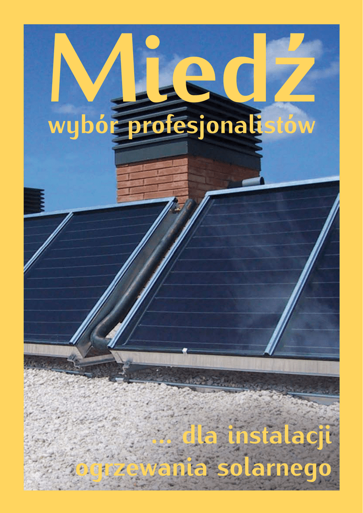 Miedź wybór profesjonalistów ... dla instalacji ogrzewania solarnego Miedź idealny materiał na solarne instalacje cieplne SŁONECZNA ENERGIA CIEPLNA Podstawowe pojęcia w zakresie solarnych instalacji cieplnych Solarna instalacja cieplna składa się z zespołu baterii /kolektorów/, których zadaniem jest pochłanianie promieniowania słonecznego, konwertowanie go w procesie ciągłym na energię cieplną oraz magazynowanie energii cieplnej w efektywny sposób tak, aby później można ją było wykorzystywać w końcowych punktach odbiorczych. Tego rodzaju system dodatkowo uzupełniany jest urządzeniem, które umożliwia wytwarzanie energii cieplnej pomocniczymi konwencjonalnymi metodami (grzałka elektryczna, piec gazowy, itp.) Zastosowania solarnych instalacji cieplnych: • ciepła woda użytkowa do celów sanitarnych (c.w.u.) • ogrzewanie basenów • klimatyzacja, grzejniki, ogrzewanie podłogowe, pompy ciepła (woda-powietrze) i pompy powietrza klimatyzowanego • cele przemysłowe 1.Układ pochłaniania, który konwertuje promieniowanie słoneczne na energię cieplną. 2.Układ wymiany, który przesyła energię cieplną pochłoniętą przez układ kolektorów do ogrzewania wody. kolektory słoneczne 4.Obwód hydrauliczny, służący do przepompowywania ciepłej wody do zbiornika magazynowego. 5.Układ regulacji i sterowania zapewniający właściwe funkcjonowanie urządzenia i zabezpieczający przed przegrzaniem, ryzykiem zamrożenia, itd c.w.u. 6 woda zimna 3.Układ magazynowania składający się z jednego lub kilku zbiorników, gdzie ciepła woda gromadzona jest do czasu określenia jej przeznaczenia. 6.Dodatkowo, układ pomocniczy, celem którego jest uzupełnienie ciepła słonecznego, dający gwarancję dostawy ciepłej wody w przypadku załamań pogody (niewielkie promieniowanie słoneczne) albo, gdy zużycie wody przekroczy zakładane ilości. Dlaczego miedź jest idealnym materiałem do wykonania solarnych instalacji cieplnych? Kompleksowe zastosowanie miedzi w takim systemie gwarantuje oszczędność energii oraz optymalne funkcjonowanie instalacji. Zgodnie z warunkami technicznymi podstawowymi celami, które powinny być osiągnięte przy stosowaniu wszelkich solarnych instalacji cieplnych są: • optymalizacja ogólnej oszczędności energii przy danej instalacji Obwód pierwotny Obwód wtórny • zapewnienie trwałości, jakości i bezpieczeństwa Obwód roboczy Zgodnie z warunkami technicznymi z uwagi na wysokie temp. dochodzące do 180º C, w obwodzie pierwotnym dopuszczalne jest tylko stosowanie rur miedzianych, w których poszczególne odcinki łączone są lutem miękkim lub twardym oraz stali nierdzewnej z połączeniami gwintowanymi, spawanymi lub kołnierzowymi, zabezpieczonymi z wierzchu farbą antykorozyjną. Miedź w obwodzie pierwotnym: •wytrzymuje wysokie temperatury pracy jakie ciecz może osiągać, nawet przy połączeniach lutem miękkim, •zapewnia prosty montaż, gdyż lutowanie nie wymaga szczególnych kwalifikacji, •stanowi uniwersalne rozwiązanie, ponieważ elementy instalacji są ogólnodostępne w sieciach handlowych, •zapewnia lepszą niezawodność, tym samym zmniejsza koszty instalacji, •nie starzeje się na skutek oddziaływania promieniowania słonecznego. Miedź w obwodzie wtórnym: •nie ulega degradacji, •jest odporna zarówno na wstrząs cieplny, jak również na kurczenie się i rozszerzanie przewodów rurowych instalacji, •zapewnia niską wewnętrzną chropowatość ścian przewodów rurowych, co obniża zużycie energii w pompach obiegowych, •jej trwałość użytkowa nie zależy od cykli ciśnienia i temperatury. Straty wynikające z oporów przepływu w obwodzie wtórnym są powodowane w głównej mierze przez tarcie na wewnętrznej powierzchni przewodów rurowych, złączek, zaworów, bądź innych elementów instalacji. MIEDŹ STANOWI KOMBINACJĘ NIEZRÓWNANYCH WŁAŚCIWOŚCI Przewodność cieplna Niezależnie od rodzaju kolektora, ażeby uzyskać maksymalną sprawność, ciepło słoneczne pochłonięte przez panele kolektora powinno być szybko przekazane do cieczy roboczej. Miedź dzięki swojej wysokiej przewodności cieplnej jest materiałem idealnym do tego celu. Cieplne właściwości miedzi sprawiają, iż cieńsze panele miedziane mogą pobierać taką samą ilość ciepła w porównaniu z grubszymi panelami wykonanymi z innych metali, zaś odstępy między miedzianymi przewodami rurowymi kolektora mogą być większe. Tym samym, możliwość stosowania cienkich paneli obniża masę kolektorów instalowanych często na dachach budynków. Przewodność cieplna w W/m-K Rura Rura Rura miedziana aluminiowa stalowa Rura PEX Rura PB Rura PP Odporność na korozję Odporność miedzi na korozję spowodowaną czynnikami atmosferycznymi jest dobrze udowodniona przez jej zastosowanie jako materiału na pokrycia dachowe. Miedź potrafi wytrzymać (nawet przez kilka wieków) negatywny wpływ bardzo zróżnicowanych warunków atmosferycznych. Gdy spełnione są warunki dotyczące jakości wody, wyszczególnione w PN-C-04607, miedź odporna jest również na korozję wywoływaną przez działanie wody. Właściwie zamontowane miedziane przewody rurowe do dystrybucji ciepłej wody odporne są na korozję we wszystkich praktycznych zastosowaniach. Wartości temperatury wewnątrz kolektora mogą wahać się od –15o C w porze nocnej w okresie zimowym, do + 200o C w okresie zastoju (gdy nie ma obiegu cieczy przenoszącej ciepło, a na kolektor padają promienie słoneczne). Ze względu na to, do instalacji tego rodzaju powinny być stosowane wyłącznie materiały takie jak miedź, które wytrzymują szeroki zakres temperatur oraz związane z nim wstrząsy termiczne. Ciśnienie robocze (bary) dla rur miedzianych z twardym lutem (współczynnik bezpieczeństwa 4) Odporność na wysokie ciśnienie i temperaturę Temperatura robocza (o C) Łatwy i szybki montaż Miedź jest materiałem uniwersalnym, nadającym