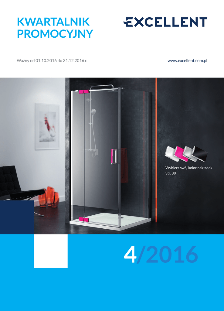 KWARTALNIK PROMOCYJNY Ważny od 01.10.2016 do 31.12.2016 r. www.excellent.com.pl Wybierz swój kolor nakładek Str. 38 4/2016 ZOBACZ KONIECZNIE CHROMOTERAPIA • Chromoterapia 4 i 8 punktowa 4 WANNY • Zagłówki i półka wannowa - NOWOŚĆ 6 • Wanna akrylowa narożna Be Spot – NOWOŚĆ 8 ARMATURA • Zestaw podtynkowy prysznicowy Apomea 11 • Bateria serii Clever - NOWOŚĆ 13 • Zestaw prysznicowo-wannowy Rain Altar White 30 CERAMIKA • Komplet wc Subway 2.0 21 • Umywalki serii Jima i Rima marki Actima - NOWOŚĆ 28 KABINY • Kabiny serii 600 marki Actima 36 • Parawany wannowe 39 UWAGA! Wszystkie ceny są cenami PLN brutto. W przypadku, gdy dany produkt, ze względu np. na wymiar ma kilka wariantów cenowych, cena katalogowa odnosi się do ceny najwyższej. P Chrometarapia P Obudowy do wanien Obudowa do zabudowy wanny wykonana jest z nowoczesnego materiału termoizolacyjnego – polistyrenu ekstrudowanego XPS. Płyta ta zapewnia doskonałą izolację termiczną, ochronę przed wilgocią oraz charakteryzuje się wysoką wytrzymałością. Obudowa posiada obustronną siatkę z tworzywa sztucznego, zatopioną w wysokogatunkowym spoiwie, które stanowi doskonałe podłoże do zabudowy obudowy płytkami. Ponadto dzięki swojej niewielkiej wadze oraz dużej sztywności montaż obudowy jest naprawdę prosty. Obudowa nadaje się do nacięcia pod konkretny wymiar wanny. W zestawie znajdują się odpowiednie akcesoria montażowe umożliwiające połączenie elementów składowych zestawu. CHROMOTERAPIA Podwodne oświetlenie wSuper super cenie! płaski ledy Super płaskie ledy Super płaski sterownik Obudowa FLEX SYSTEM do zabudowy płytkami wanny prostokątnej do wymiarów 1800 × 850 mm Obudowa FLEX SYSTEM do zabudowy płytkami wanny prostokatnej do wymiarów 2000 × 900 mm Obudowa FLEX SYSTEM do zabudowy płytkami wanny narożnnej W skład zestawu wchodzą: bok dłuższy – 1800 × 600 mm bok krótszy – 850 × 600 mm grubość – 30 mm zestaw łączników kod: OBEX.P.18X85WH W skład zestawu wchodzą: bok dłuższy – 2000 × 600 mm bok krótszy – 900 × 600 mm grubość –30 mm zestaw łączników kod: OBEX.P.20X90WH W skład zestawu wchodzą: bok nacinany – 2500 mm × 600 mm grubość – 30 mm kod: OBEX.N.250WH Power led wykorzystane w systemie chromoterapii są całkowicie zintegrowane z powierzchnią wanny. Cena promocyjna brutto Cena promocyjna brutto Cena promocyjna brutto Cena katalogowa Cena katalogowa Cena katalogowa 299,325,- Chromoterapia 4-punktowa Chromoterapia 8-punktowa Cena promocyjna brutto Cena promocyjna brutto Cena katalogowa Cena katalogowa 1 899,2 249,- 2 499,2 999,- Promocja trwa od 01.10.2016 do 31.12.2016 r. lub do wyczerpania zapasów. Informacje szczegółowe oraz promocyjne warunki handlowe u Przedstawicieli Handlowych Excellent S.A. Wszystkie podane ceny, są cenami PLN brutto. 415,- Obudowa FLEX SYSEM do zabudowy płytkami wanny Be Spot Stopka regulowana do obudów FLEX SYSEM kod: OBEX.BSF.16WH kod: OBEX.STO.BL Cena promocyjna brutto Cena promocyjna brutto Cena katalogowa Cena katalogowa 339,420,- 4 329,- 299,350,- 25,30,- Promocja trwa od 01.10.2016 do 31.12.2016 r. lub do wyczerpania zapasów. Informacje szczegółowe oraz promocyjne warunki handlowe u Przedstawicieli Handlowych Excellent S.A. Wszystkie podane ceny, są cenami PLN brutto. 5 P Dodatki wannowe P Wanny Obudowa FLEX SYSTEM do zabudowy płytkami kod: OBEX.P.18X85WH Cena promocyjna brutto 299,- Cena katalogowa 325,- Karo Prim Aquaria kod: WAZA.KARO-SZARY kod: WAZA.PRIM-SZARY 1395 × 700 mm kod: WAEX.AQU14WH 1500 × 700 mm kod: WAEX.AQU15WH 1600 × 705 mm kod: WAEX.AQU16WH 1700 × 750 mm kod: WAEX.AQU17WH Cena promocyjna brutto Cena promocyjna brutto Cena promocyjna brutto Cena promocyjna brutto Cena katalogowa Cena katalogowa Cena katalogowa Cena katalogowa Zagłówek wannowy Zagłówek wannowy Cena promocyjna brutto Cena promocyjna brutto Cena katalogowa Cena katalogowa 59,70,- 79,100,- Wanna akrylowa prostokątna 869,1 086,- 879,1 099,- 889,1 111,- 899,1 124,- Obudowa FLEX SYSTEM do zabudowy płytkami kod: OBEX.N.250WH Powłoka Easy Clean Cena promocyjna brutto Szkło 8 mm Cena katalogowa 299,Long Level Aquaria Comfort kod: WAZA.LONG-SZARY kod: WAPO.LEVEL-SZARY 1500 × 955 mm Lewa, kod: WAEX.AQL15WH Prawa, kod: WAEX.AQP15WH Zagłówek wannowy Cena promocyjna brutto 109,- Cena katalogowa 130,- Półka wannowa Cena promocyjna brutto 359,- Cena katalogowa 450,- Promocja trwa od 01.10.2016 do 31.12.2016 r. lub do wyczerpania zapasów. Informacje szczegółowe oraz promocyjne warunki handlowe u Przedstawicieli Handlowych Excellent S.A. Wszystkie podane ceny, są cenami PLN brutto. 1600 × 1000 mm Lewa, kod: WAEX.AQL16WH Prawa, kod: WAEX.AQP16WH Cena promocyjna brutto Cena promocyjna brutto Cena katalogowa Cena katalogowa 1 186,- 6 Chromowana rączka Wanna akrylowa narożna 949,- 350,- 9791 225,- Promocja trwa od 01.10.2016 do 31.12.2016 r. lub do wyczerpania zapasów. Informacje szczegółowe oraz promocyjne warunki handlowe u Przedstawicieli Handlowych Excellent S.A. Wszystkie podane ceny, są cenami PLN brutto. 7 P Wanny P Wanny Lumina Wanna akrylowa owalna Obudowa FLEX SYSTEM do zabudowy płytkami biała 1900 × 955 mm kod: WAEX.LUM19WH kod: OBEX.P.18X85WH Cena promocyjna brutto 299,- Cena promocyjna brutto 1 999,- Cena katalogowa 325,- Cena katalogowa 2 499,- Sekwana Wanna akrylowa prostokątna 1400 × 700 mm kod: WAEX.SEK14WH 1495 × 710 mm kod: WAEX.SEK15WH 1595 × 705 mm kod: WAEX.SEK16WH 1700 × 755 mm kod: WAEX.SEK17WH Cena promocyjna brutto Cena promocyjna brutto Cena promocyjna brutto Cena promocyjna brutto 639,- Cena katalogowa 799,- 659,- Cena katalogowa 824,- 679,- Cena katalogowa 699,- Cena katalogowa 849,- Obudowa FLEX SYSTEM do zabudowy płytkami kod: OBEX.N.250WH Cena promocyjna brutto 299/1 szt. 2× Cena katalogowa 325,- 874,- * – Mozliwe zabudowanie dwustronne wanny przy użycie dwóch kompletów OBEX.N.250WH Comfort + Obudowa FLEX SYSTEM do zabudowy płytka