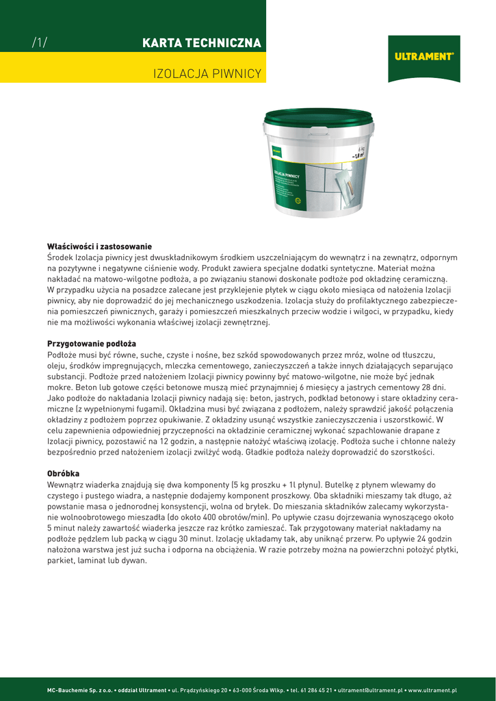 /1/ KARTA TECHNICZNA IZOLACJA PIWNICY Właściwości i zastosowanie Środek Izolacja piwnicy jest dwuskładnikowym środkiem uszczelniającym do wewnątrz i na zewnątrz, odpornym na pozytywne i negatywne ciśnienie wody. Produkt zawiera specjalne dodatki syntetyczne. Materiał można nakładać na matowo-wilgotne podłoża, a po związaniu stanowi doskonałe podłoże pod okładzinę ceramiczną. W przypadku użycia na posadzce zalecane jest przyklejenie płytek w ciągu około miesiąca od nałożenia Izolacji piwnicy, aby nie doprowadzić do jej mechanicznego uszkodzenia. Izolacja służy do profilaktycznego zabezpieczenia pomieszczeń piwnicznych, garaży i pomieszczeń mieszkalnych przeciw wodzie i wilgoci, w przypadku, kiedy nie ma możliwości wykonania właściwej izolacji zewnętrznej. Przygotowanie podłoża Podłoże musi być równe, suche, czyste i nośne, bez szkód spowodowanych przez mróz, wolne od tłuszczu, oleju, środków impregnujących, mleczka cementowego, zanieczyszczeń a także innych działających separująco substancji. Podłoże przed nałożeniem Izolacji piwnicy powinny być matowo-wilgotne, nie może być jednak mokre. Beton lub gotowe części betonowe muszą mieć przynajmniej 6 miesięcy a jastrych cementowy 28 dni. Jako podłoże do nakładania Izolacji piwnicy nadają się: beton, jastrych, podkład betonowy i stare okładziny cera miczne (z wypełnionymi fugami). Okładzina musi być związana z podłożem, należy sprawdzić jakość połączenia okładziny z podłożem poprzez opukiwanie. Z okładziny usunąć wszystkie zanieczyszczenia i uszorstkowić. W celu zapewnienia odpowiedniej przyczepności na okładzinie ceramicznej wykonać szpachlowanie drapane z Izolacji piwnicy, pozostawić na 12 godzin, a następnie nałożyć właściwą izolację. Podłoża suche i chłonne należy bezpośrednio przed nałożeniem izolacji zwilżyć wodą. Gładkie podłoża należy doprowadzić do szorstkości. Obróbka Wewnątrz wiaderka znajdują się dwa komponenty (5 kg proszku + 1l płynu). Butelkę z płynem wlewamy do czystego i pustego wiadra, a następnie dodajemy komponent proszkowy. Oba składniki mieszamy tak długo, aż powstanie masa o jednorodnej konsystencji, wolna od bryłek. Do mieszania składników zalecamy wykorzystanie wolnoobrotowego mieszadła (do około 400 obrotów/min). Po upływie czasu dojrzewania wynoszącego około 5 minut należy zawartość wiaderka jeszcze raz krótko zamieszać. Tak przygotowany materiał nakładamy na podłoże pędzlem lub packą w ciągu 30 minut. Izolację układamy tak, aby uniknąć przerw. Po upływie 24 godzin nałożona warstwa jest już sucha i odporna na obciążenia. W razie potrzeby można na powierzchni położyć płytki, parkiet, laminat lub dywan. MC-Bauchemie Sp. z o.o. • oddział Ultrament • ul. Prądzyńskiego 20 • 63-000 Środa Wlkp. • tel. 61 286 45 21 • [email protected] • www.ultrament.pl /2/ KARTA TECHNICZNA IZOLACJA PIWNICY Wskazówki Izolacji piwnicy nie może być nakładać na podłoże przy temperaturze otoczenia i podłoża niżej niż 5°C. Wszystkie podane parametry odnoszą się do temperatury +23ºC i 50% wilgotności względnej powietrza. Wyższe temperatury i niższa wilgotność przyspieszają, a niższe temperatury i wyższa wilgotność spowalniają przebieg procesu wiązania i wysychania. Prace należy prowadzić zgodnie ze sztuką budowlaną i zachowaniem zasad BHP. Produkt zawiera cement, który u osób wrażliwych może powodować podrażnienie. Po zmieszaniu z wodą ma odczyn zasadowy, chronić oczy i skórę. W czasie przygotowania, nakładania i schnięcia izolacji należy unikać bezpośredniego naświetlania światłem słonecznym oraz wystawiania podłoża na podmuchy wiatru, względnie przeciągi. W takim przypadku należy zastosować środki zaradcze w postaci, np. przykrycia obrabianej powierzchni folią. Tabela przeglądowa produktu Izolacja piwnicy Baza materiałowa Kolor Konsystencja Czas schnięcia Czas dojrzewania Czas obróbki Pełne obciążenie Temperatura obróbki Odporność na temperaturę Zużycie Wytrzymałość na ściskanie Wytrzymałość na zginanie Wytrzymałość na wodę pod ciśnieniem Czyszczenie Utylizacja Przechowywanie Opakowanie Kombinacja cementu z mineralnymi materiałami wypełniającymi, wzbogacona dodatkami sztucznym cementowo-szary po zmieszaniu pasta nadająca się do nakładania pędzlem lub pacą ok. 24 godziny 5 minut ok. 30 minut po 24 godzinach od +5°C do +25°C / powietrza i podłoża od -30°C do +90°C ok. 3,3 kg/m² 2 dni : ok. 20,0 MPa, 7 dni : ok. 25,0 MPa, 28 dni: ok. 30,0 MPa 2 dni : ok. 4,5 MPa, 7 dni : ok. 5,0 MPa, 28 dni: ok. 7,5 MPa Do 0,5 MPa / ciśnienie pozytywne i negatywne/ w świeżym stanie materiału – woda, po związaniu - mechanicznie Puste opakowania można wyrzucać do pojemników na śmieci w oryginalnie zamkniętym opakowaniu, w miejscu suchym i wolnym od mrozu, 36 miesiące od daty produkcji 6,0 kg – wiaderko z tworzywa sztucznego zawierające dwa komponenty (5 kg proszku + 1 l płynu) UWAGA: Zawarte w tej ulotce dane są wynikiem naszego doświadczenia zdobytego w oparciu o jak najbardziej rzetelną wiedzę, nie mniej nie są one wiążące. Dane te powinny zostać określone każdorazowo w oparciu o cechy charakterystyczne danego obiektu budowlanego, zastosowanie i specyficzne lokalne wymagania. Uwzględniając to założenie ponosimy odpowiedzialność za prawidłowość podanych tutaj danych w ramach naszych warunków sprzedaży i dostawy. Zalecenia odbiegające od zaleceń podanych w treści tych ulotek są jedynie wiążące, jeśli zostały podane na piśmie przez naszych pracowników. Wszystkie wskazówki techniczne dotyczące zastosowań odpowiadają aktualnemu stanowi wiedzy. Nr karty technicznej TM 018/09/2011/001 (stan na dzień 27.09.2011). Niniejszy druk został aktualizowany pod względem technicznym. Wraz z opublikowaniem tego wydania karty technicznej wszystkie 