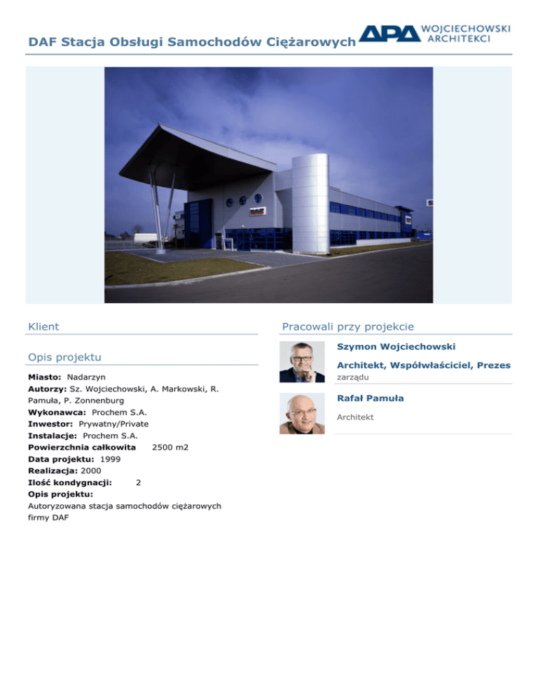 DAF Stacja Obsługi Samochodów Ciężarowych Klient Pracowali przy projekcie Szymon Wojciechowski Opis projektu Architekt, Współwłaściciel, Prezes Miasto: Nadarzyn zarządu Autorzy: Sz. Wojciechowski, A. Markowski, R. Pamuła, P. Zonnenburg Wykonawca: Prochem S.A. Architekt Inwestor: Prywatny/Private Instalacje: Prochem S.A. Powierzchnia całkowita 2500 m2 Data projektu: 1999 Realizacja: 2000 Ilość kondygnacji: 2 Opis projektu: Autoryzowana stacja samochodów ciężarowych firmy DAF Rafał Pamuła