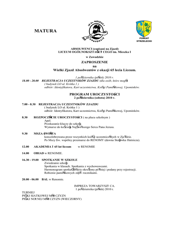 MATURA ABSOLWENCI (zapisani na Zjazd) LICEUM OGÓLNOKSZTAŁCĄCEGO im. Mieszka I w Zawadzkie ZAPROSZENIE na Wielki Zjazd Absolwentów z okazji 65 lecia Liceum. 18.00 - 20.00 1 października (piątek) 2010 r. REJESTRACJA UCZESTNIKÓW ZJAZDU (dla osób, które mogą) ( budynek LO ul. Krótka 1 ) odbiór: Identyfikatora, Kart uczestnictwa, Księgi Pamiątkowej, Upominków. PROGRAM UROCZYSTOŚCI 2 października (sobota) 2010 r. 7.00 - 8.30 REJESTRACJA UCZESTNIKÓW ZJAZDU ( budynek LO ul. Krótka 1 ) odbiór: Identyfikatora, Kart uczestnictwa, Księgi Pamiątkowej, Upominków. 8.30 ROZPOCZĘCIE UROCZYSTOŚCI ( na placu szkolnym ) Apel. Przekazanie kluczy do szkoły. Wymarsz do kościoła Najświętszego Serca Pana Jezusa. 9.30 MSZA ŚWIĘTA koncelebrowana przez wszystkich księży uczestniczących w Zjeździe. Po Mszy Św. wspólny przemarsz do RENOMY (dawna Stołówka Hutnicza). 12.00 AKADEMIA – 65 lat liceum 14.00 OBIAD w RENOMIE. 16.30 - 19.00 w RENOMIE SPOTKANIE W SZKOLE Zwiedzanie szkoły. Spotkania w klasach. Spotkania z wychowawcami. Harmonogram spotkań będzie określony później i podany przy rejestracji. Robienie pamiątkowych zdjęć rocznikami. 20.00 - 06.00 BAL w Renomie. IMPREZA TOWARZYSZĄCA. 1 października (piątek) 2010 r. TURNIEJ PIŁKI SIATKOWEJ MĘŻCZYZN PIŁKI NOŻNEJ MĘŻCZYZN (WIECZORNY)