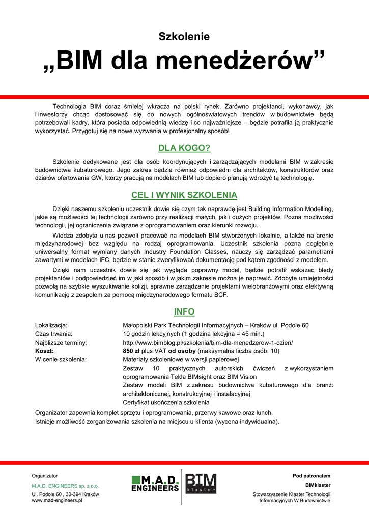 Szkolenie „BIM dla menedżerów” Technologia BIM coraz śmielej wkracza na polski rynek. Zarówno projektanci, wykonawcy, jak i inwestorzy chcąc dostosować się do nowych ogólnoświatowych trendów w budownictwie będą potrzebowali kadry, która posiada odpowiednią wiedzę i co najważniejsze – będzie potrafiła ją praktycznie wykorzystać. Przygotuj się na nowe wyzwania w profesjonalny sposób! DLA KOGO? Szkolenie dedykowane jest dla osób koordynujących i zarządzających modelami BIM w zakresie budownictwa kubaturowego. Jego zakres będzie również odpowiedni dla architektów, konstruktorów oraz działów ofertowania GW, którzy pracują na modelach BIM lub dopiero planują wdrożyć tą technologię. CEL I WYNIK SZKOLENIA Dzięki naszemu szkoleniu uczestnik dowie się czym tak naprawdę jest Building Information Modelling, jakie są możliwości tej technologii zarówno przy realizacji małych, jak i dużych projektów. Pozna możliwości technologii, jej ograniczenia związane z oprogramowaniem oraz kierunki rozwoju. Wiedza zdobyta u nas pozwoli pracować na modelach BIM stworzonych lokalnie, a także na arenie międzynarodowej bez względu na rodzaj oprogramowania. Uczestnik szkolenia pozna dogłębnie uniwersalny format wymiany danych Industry Foundation Classes, nauczy się zarządzać parametrami zawartymi w modelach IFC, będzie w stanie zweryfikować dokumentację pod kątem zgodności z modelem. Dzięki nam uczestnik dowie się jak wygląda poprawny model, będzie potrafił wskazać błędy projektantów i podpowiedzieć im w jaki sposób i w jakim zakresie można je naprawić. Zdobyte umiejętności pozwolą na szybkie wyszukiwanie kolizji, sprawne zarządzanie projektami wielobranżowymi oraz efektywną komunikację z zespołem za pomocą międzynarodowego formatu BCF. INFO Lokalizacja: Czas trwania: Najbliższe terminy: Koszt: W cenie szkolenia: Małopolski Park Technologii Informacyjnych – Kraków ul. Podole 60 10 godzin lekcyjnych (1 godzina lekcyjna = 45 min.) http://www.bimblog.pl/szkolenia/bim-dla-menedzerow-1-dzien/ 850 zł plus VAT od osoby (maksymalna liczba osób: 10) Materiały szkoleniowe w wersji papierowej Zestaw 10 praktycznych autorskich ćwiczeń z wykorzystaniem oprogramowania Tekla BIMsight oraz BIM Vision Zestaw modeli BIM z zakresu budownictwa kubaturowego dla branż: architektonicznej, konstrukcyjnej i instalacyjnej Certyfikat ukończenia szkolenia Organizator zapewnia komplet sprzętu i oprogramowania, przerwy kawowe oraz lunch. Istnieje możliwość zorganizowania szkolenia na miejscu u klienta (wycena indywidualna). Organizator Pod patronatem M.A.D. ENGINEERS sp. z o.o. BIMklaster Ul. Podole 60 , 30-394 Kraków www.mad-engineers.pl Stowarzyszenie Klaster Technologii Informacyjnych W Budownictwie Szkolenie „BIM dla menedżerów” PROGRAM SZKOLENIA Moduł I (3 x 45 min) WPROWADZENIE Podstawowe informacje Wprowadzenie do terminologii związanej z technologią BIM oraz krótka odpowiedź na pytanie: co należy przygotować przed przystąpieniem do modelowania, aby praca w BIM była efektywna a nie przyprawiała o ból głowy? BIM = współpraca – co to oznacza w praktyce? Na czym polega idea BIMu i openBIMu? Wprowadzenie do formatu Industry Foundation Classes. Darmowe oraz płatne komercyjne oprogramowanie do sprawdzania modeli Analiza przeglądarek oraz programów do oceny poprawności modeli IFC. Case study – ćwiczenia praktyczne Wprowadzenie do obsługi oprogramowania Tekla BIMsight. Sprawdzanie kolizji dla wielobranżowego projektu na przykładzie budynku użyteczności publicznej wraz z omówieniem sposobu komunikacji za pomocą formatu BCF. Moduł II (3 x 45 min) IFC JĘZYKIEM BIM Klasyfikacja elementów budowlanych według standardu IFC Omówienie hierarchicznej struktury modelu, sposobów reprezentacji geometrii oraz podstawowych właściwości i parametrów ilościowych dla elementów. Case study – ćwiczenia praktyczne Wprowadzenie do obsługi oprogramowania BIM Vision. Zarządzanie parametrami IFC, weryfikacja ilości materiałów w modelu z fakturą od wykonawcy na przykładzie obiektu użytkowo – mieszkaniowego. Translatory i schematy – jak eksportować i importować modele IFC? Omówienie wymagań stawianych programom „klasy BIM” w zakresie Model View Definition, formułowanie własnych schematów, najważniejsze opcje eksportu modelu do formatu IFC. Jak zadbać o prawa autorskie, bezstratnie wymieniać się modelami. Moduł III (4 x 45 min) PROJEKT BIM Wymogi stawiane modelom i najczęściej popełniane błędy Sformułowanie danych wyjściowych do modelowania, wytycznych dla elementów w zakresie definicji geometrii i zawartości informacji niegeometrycznych (Level of Development) oraz relacji między obiektami modelu. Zestawienie najczęstszych błędów oraz sposoby na ich uniknięcie. Case study – ćwiczenia praktyczne Sprawdzenie zgodności modeli konstrukcji i architektury na przykładzie budynku usługowo – mieszkaniowego. Sprawdzenie modelu z dokumentacją 2D. Dokumentacja 2D a model – razem czy osobno? Omówienie sposobów na uniknięcie odłączenia rysunków od modelu, szczegółowe omówienie praktycznych aspektów Level Of Development, techniczne zalety połączenia modelu z rysunkiem. Organizator Pod patronatem M.A.D. ENGINEERS sp. z o.o. BIMklaster Ul. Podole 60 , 30-394 Kraków www.mad-engineers.pl Stowarzyszenie Klaster Technologii Informacyjnych W Budownictwie Szkolenie „BIM dla menedżerów” HARMONOGRAM Godz. 8 00 15 Rejestracja/powitalna kawa 30 Moduł I: Wprowadzenie, cz. 1 ÷8 15 Godz. 8 ÷ 9 30 45 Godz. 9 ÷ 9 : 45 Przerwa 45 Godz. 9 ÷ 10 45 00 Godz. 10 ÷ 11 : 00 ÷ 12 : 15 ÷ 12 : Godz. 11 Godz. 12 45 45 Przerwa na lunch 45 ÷ 14 : 00 ÷ 15 : 30 45 * Moduł II: IFC językiem BIM, cz. 2 00 Przerwa 30 Moduł III: Projekt BIM, cz. 1 45 Godz. 15 ÷ 15 Godz. 15 Przerwa Moduł II: IFC językiem BIM, cz. 1 45 Godz. 14 Moduł I: Wprowadzenie, cz. 1 15 Godz. 12 ÷ 13 : Godz. 