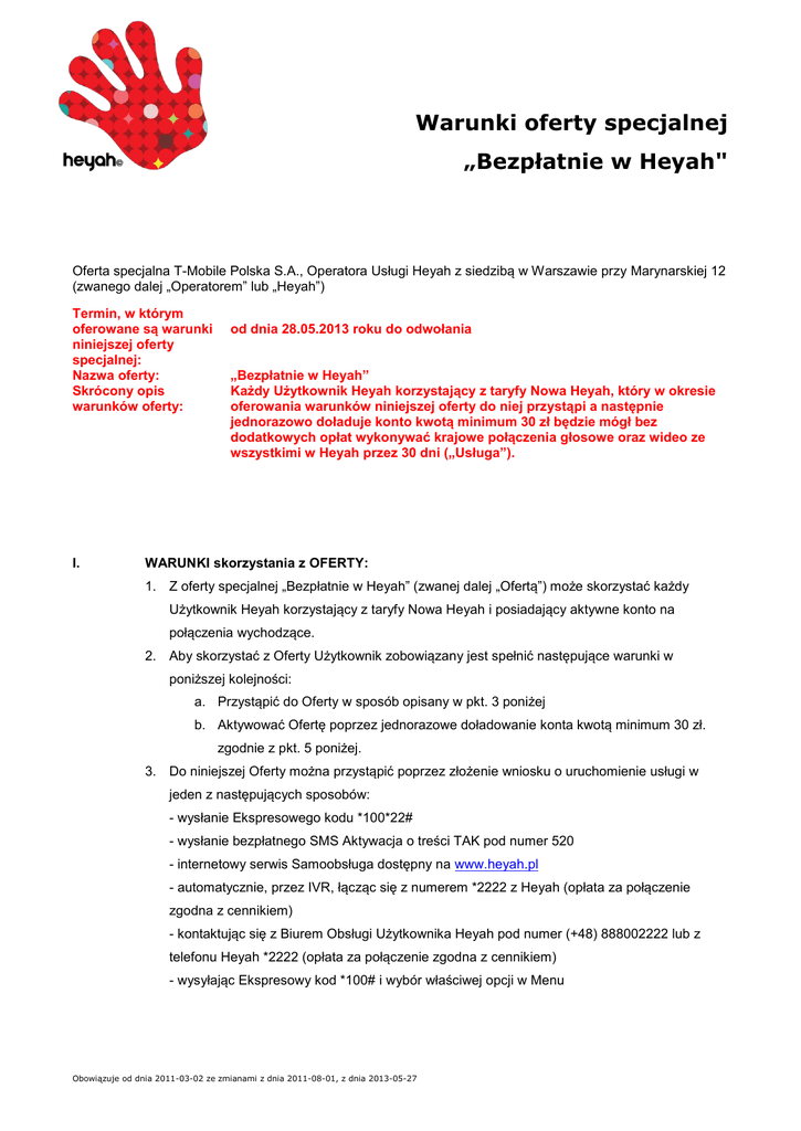 Warunki oferty specjalnej „Bezpłatnie w Heyah" Oferta specjalna T-Mobile Polska S.A., Operatora Usługi Heyah z siedzibą w Warszawie przy Marynarskiej 12 (zwanego dalej „Operatorem” lub „Heyah”) Termin, w którym oferowane są warunki niniejszej oferty specjalnej: Nazwa oferty: Skrócony opis warunków oferty: I. od dnia 28.05.2013 roku do odwołania „Bezpłatnie w Heyah” Każdy Użytkownik Heyah korzystający z taryfy Nowa Heyah, który w okresie oferowania warunków niniejszej oferty do niej przystąpi a następnie jednorazowo doładuje konto kwotą minimum 30 zł będzie mógł bez dodatkowych opłat wykonywać krajowe połączenia głosowe oraz wideo ze wszystkimi w Heyah przez 30 dni („Usługa”). WARUNKI skorzystania z OFERTY: 1. Z oferty specjalnej „Bezpłatnie w Heyah” (zwanej dalej „Ofertą”) może skorzystać każdy Użytkownik Heyah korzystający z taryfy Nowa Heyah i posiadający aktywne konto na połączenia wychodzące. 2. Aby skorzystać z Oferty Użytkownik zobowiązany jest spełnić następujące warunki w poniższej kolejności: a. Przystąpić do Oferty w sposób opisany w pkt. 3 poniżej b. Aktywować Ofertę poprzez jednorazowe doładowanie konta kwotą minimum 30 zł. zgodnie z pkt. 5 poniżej. 3. Do niniejszej Oferty można przystąpić poprzez złożenie wniosku o uruchomienie usługi w jeden z następujących sposobów: - wysłanie Ekspresowego kodu *100*22# - wysłanie bezpłatnego SMS Aktywacja o treści TAK pod numer 520 - internetowy serwis Samoobsługa dostępny na www.heyah.pl - automatycznie, przez IVR, łącząc się z numerem *2222 z Heyah (opłata za połączenie zgodna z cennikiem) - kontaktując się z Biurem Obsługi Użytkownika Heyah pod numer (+48) 888002222 lub z telefonu Heyah *2222 (opłata za połączenie zgodna z cennikiem) - wysyłając Ekspresowy kod *100# i wybór właściwej opcji w Menu Obowiązuje od dnia 2011-03-02 ze zmianami z dnia 2011-08-01, z dnia 2013-05-27 4. Potwierdzenie przystąpienia do Oferty następuje najpóźniej w ciągu 72 godzin po dokonaniu czynności określonych w pkt. 3 poprzez przesłanie przez Operatora do Użytkownika wiadomości SMS. 5. Użytkownik, który otrzymał potwierdzenie przystąpienia do Oferty, o którym mowa w pkt. 4 powyżej a następnie jednorazowo doładował swoje konto kwotą minimum 30 zł może wykonywać bezpłatne krajowe połączenia głosowe lub wideo ze wszystkimi numerami Heyah przez okres 30 dni, licząc od momentu potwierdzenia przez Operatora wiadomością SMS aktywacji Usługi. 6. Przystąpienie do Oferty oraz aktywacja Usługi opisane w pkt. 2-5 muszą być wykonane w tym samym miesiącu kalendarzowym. Oznacza to w szczególności, że jeżeli Użytkownik przystąpił do Oferty i jej nie aktywował w tym samym miesiącu kalendarzowym, musi ponownie spełnić warunki opisane w pkt. 2-5 powyżej. 7. Po upływie 30 dni od otrzymania wiadomości SMS potwierdzającej aktywację Oferty opłaty za połączenia będą naliczane zgodnie z obowiązującym Cennikiem. 8. Jeżeli Użytkownik ma aktywną Usługę i jednorazowo doładuje konto kwotą minimum 30zł, okres wykonywania bezpłatnych krajowych połączeń głosowych lub wideo ze wszystkimi numerami Heyah zostanie automatycznie przedłużony o 30 dni, licząc od momentu potwierdzenia przez Operatora wiadomością SMS przedłużenia okresu świadczenia Usługi. 9. Użytkownik może bezpłatnie sprawdzić status Usługi przez wysłanie Ekspresowego kodu *100*22#. 10. Oferta nie wyklucza się z innymi ofertami specjalnymi dla Użytkowników taryfy Nowa Heyah, co oznacza, że nie powoduje zmniejszenia stanu konta, stanu minut lub innych jednostek promocyjnych przyznanych Użytkownikowi w ramach innych ofert promocyjnych. 11. Oferta nie działa w roamingu oraz nie dotyczy połączeń przekierowanych, połączeń z numerami Premium oraz numerami usługowymi. 12. Użytkownik może zrezygnować z korzystania z Usługi kontaktując się z Biurem Obsługi Użytkownika Heyah pod numer (+48) 888002222 lub z telefonu Heyah *2222 (opłata za połączenie zgodna z cennikiem). 13. Aby ponownie skorzystać z Oferty należy ponownie przystąpić do Oferty i aktywować Usługę w sposób opisany w pkt. 2-5 powyżej. 14. W przypadku zmiany taryfy przez Użytkownika na Taryfę Pakietową następuje automatyczna dezaktywacja Oferty. Użytkownik może ponownie przystąpić do Oferty w sposób opisany w pkt. 2- 5 po zmianie taryfy na Nowa Heyah. 15. Skorzystanie z niniejszej Oferty przez Użytkownika oznacza akceptację niniejszych Warunków oferty specjalnej. 16. Niniejsze Warunki oferty specjalnej dostępne są na stronie internetowej www.heyah.pl. II. REKLAMACJE: 1. Reklamacje dotyczące Oferty „Bezpłatnie w Heyah” należy zgłaszać drogą elektroniczną: [email protected], pisemnie na adres: Reklamacje Heyah, Marynarska 12, 02-674 Warszawa, lub telefonicznie: +48 888002222. 2. Użytkownik, który skorzystał z niniejszej Oferty może zgłosić reklamację w terminie 12 miesięcy od daty zdarzenia będącego przedmiotem reklamacji. Obowiązuje od dnia 2011-03-02 ze zmianami z dnia 2011-08-01, z dnia 2013-05-27 3. Reklamacja winna zawierać imię i nazwisko Użytkownika, numer telefonu oraz kod PUK karty SIM, przedmiot reklamacji, reklamowany okres oraz okoliczności uzasadniające reklamację. 4. Jeśli podane w reklamacji dane lub informacje wymagają uzupełnienia, przed rozpatrzeniem reklamacji, Operator zwraca się do Użytkownika składającego reklamację o jej uzupełnienie. Nieuzupełnienie reklamacji w terminie wskazanym w wezwaniu powoduje pozostawienie reklamacji bez rozpoznania. 5. Operator rozpatruje reklamację w terminie do 1 miesiąca od dnia jej otrzymania od Użytkownika z zastrzeżeniem, że reklamacja jest kompletna i nie jest wymagane jej uzupełnienie. 6. Reklamacje będące następstwem niestosowania się Użytkownika do treści niniejszych Warunków oferty specjalnej nie zostaną rozpatrzone przez 