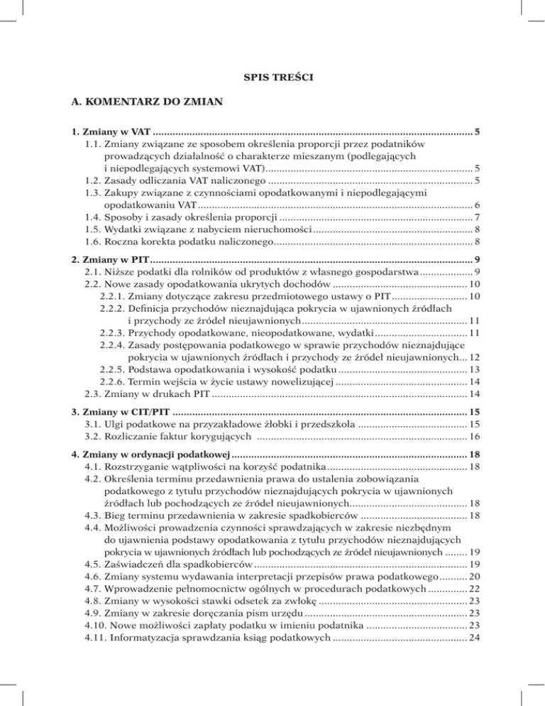 SPIS TREŚCI A. KOMENTARZ DO ZMIAN 1. Zmiany w VAT................................................................................................................... 5 1.1. Zmiany związane ze sposobem określenia proporcji przez podatników prowadzących działalność o charakterze mieszanym (podlegających i niepodlegających systemowi VAT)........................................................................... 5 1.2. Zasady odliczania VAT naliczonego.......................................................................... 5 1.3. Zakupy związane z czynnościami opodatkowanymi i niepodlegającymi opodatkowaniu VAT................................................................................................... 6 1.4. Sposoby i zasady określenia proporcji...................................................................... 7 1.5. Wydatki związane z nabyciem nieruchomości.......................................................... 8 1.6. Roczna korekta podatku naliczonego........................................................................ 8 2. Zmiany w PIT.................................................................................................................... 9 2.1. Niższe podatki dla rolników od produktów z własnego gospodarstwa.................... 9 2.2. Nowe zasady opodatkowania ukrytych dochodów................................................. 10 2.2.1. Zmiany dotyczące zakresu przedmiotowego ustawy o PIT............................ 10 2.2.2. Definicja przychodów nieznajdująca pokrycia w ujawnionych źródłach i przychody ze źródeł nieujawnionych............................................................ 11 2.2.3. Przychody opodatkowane, nieopodatkowane, wydatki.................................. 11 2.2.4. Zasady postępowania podatkowego w sprawie przychodów nieznajdujące pokrycia w ujawnionych źródłach i przychody ze źródeł nieujawnionych.... 12 2.2.5. Podstawa opodatkowania i wysokość podatku............................................... 13 2.2.6. Termin wejścia w życie ustawy nowelizującej................................................ 14 2.3. Zmiany w drukach PIT............................................................................................ 14 3. Zmiany w CIT/PIT.......................................................................................................... 15 3.1. Ulgi podatkowe na przyzakładowe żłobki i przedszkola........................................ 15 3.2. Rozliczanie faktur korygujących ............................................................................ 16 4. Zmiany w ordynacji podatkowej..................................................................................... 18 4.1. Rozstrzyganie wątpliwości na korzyść podatnika................................................... 18 4.2. Określenia terminu przedawnienia prawa do ustalenia zobowiązania podatkowego z tytułu przychodów nieznajdujących pokrycia w ujawnionych źródłach lub pochodzących ze źródeł nieujawnionych........................................... 18 4.3. Bieg terminu przedawnienia w zakresie spadkobierców....................................... 18 4.4. Możliwości prowadzenia czynności sprawdzających w zakresie niezbędnym do ujawnienia podstawy opodatkowania z tytułu przychodów nieznajdujących pokrycia w ujawnionych źródłach lub pochodzących ze źródeł nieujawnionych......... 19 4.5. Zaświadczeń dla spadkobierców............................................................................. 19 4.6. Zmiany systemu wydawania interpretacji przepisów prawa podatkowego........... 20 4.7. Wprowadzenie pełnomocnictw ogólnych w procedurach podatkowych............... 22 4.8. Zmiany w wysokości stawki odsetek za zwłokę...................................................... 23 4.9. Zmiany w zakresie doręczania pism urzędu........................................................... 23 4.10. Nowe możliwości zapłaty podatku w imieniu podatnika..................................... 23 4.11. Informatyzacja sprawdzania ksiąg podatkowych................................................. 24 zą ej eia az 4.12. Powiadamiania o bezskuteczności korekty deklaracji.......................................... 24 4.13. Otwarcie Rejestru Zastawów Skarbowych............................................................ 24 4.14. Ujednolicenie właściwości miejscowej urzędów skarbowych dla firm................ 26 4.15. Umożliwienie opłacania podatków kartą płatniczą.............................................. 26 5. Limity podatkowe w 2016 r. .......................................................................................... 26 5.1. Mały podatnik w 2016 r........................................................................................... 26 5.2. Limity PIT, CIT i VAT............................................................................................... 27 5.3. Ryczałt dla firm........................................................................................................ 28 5.4. Limit prowadzenia ksiąg rachunkowych w 2016 r................................................. 28 6. Wykaz aktów prawnych................................................................................................... 29 B. PRZEPISY PRAWNE ug od1 1) i lica Ustawa z dnia 9 kwietnia 2015 r. o zmianie ustawy o podatku od towarów i usług oraz ustawy - Prawo zamówień publicznych...................................................... 31 ch ch usą one w, ow la pu Ustawa z dnia 10 lipca 2015 r. o zmianie ustawy o podatku dochodowym od osób fizycznych oraz ustawy o podatku dochodowym od osób prawnych............... 58 ąze- e- a, ia nej Ustawa z dnia 16 stycznia 2015 r. o zmianie ustawy o podatku dochodowym od osób fizycznych oraz ustawy - Ordynacja podatkowa............................................... 47 Ustawa z dnia 9 kwietnia 2015 r. o zmianie ustawy o podatku dochodowym od osób fizycznych