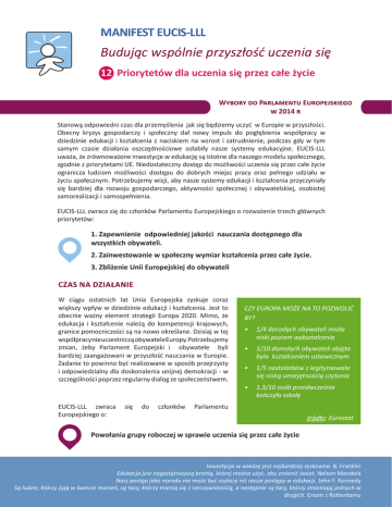 MANIFEST EUCIS-LLL Budując wspólnie przyszłość uczenia się 12 Priorytetów dla uczenia się przez całe życie Wybory do Parlamentu Europejskiego w 2014 r Stanową odpowiedni czas dla przemyślenia jak się będziemy uczyć w Europie w przyszłości. Obecny kryzys gospodarczy i społeczny dał nowy impuls do pogłębienia współpracy w dziedzinie edukacji i kształcenia z naciskiem na wzrost i zatrudnienie, podczas gdy w tym samym czasie działania oszczędnościowe osłabiły nasze systemy edukacyjne. EUCIS-LLL uważa, że zrównoważone inwestycje w edukację są istotne dla naszego modelu społecznego, zgodnie z priorytetami UE. Niedostateczny dostęp do możliwości uczenia się przez całe życie ogranicza ludziom możliwości dostępu do dobrych miejsc pracy oraz pełnego udziału w życiu społecznym. Potrzebujemy wizji, aby nasze systemy edukacji i kształcenia przyczyniały się bardziej dla rozwoju gospodarczego, aktywności społecznej i obywatelskiej, osobistej samorealizacji i samospełnienia. EUCIS-LLL zwraca się do członków Parlamentu Europejskiego o rozważenie trzech głównych priorytetów: 1. Zapewnienie odpowiedniej jakości nauczania dostępnego dla wszystkich obywateli. 2. Zainwestowanie w społeczny wymiar kształcenia przez całe życie. 3. Zbliżenie Unii Europejskiej do obywateli CZAS NA DZIAŁANIE W ciągu ostatnich lat Unia Europejska zyskuje coraz większy wpływ w dziedzinie edukacji i kształcenia. Jest to obecnie ważny element strategii Europa 2020. Mimo, że edukacja i kształcenie należą do kompetencji krajowych, granice pomocniczości są na nowo określane. Dzisiaj w tej współpracy nie uczestniczą obywatele Europy. Potrzebujemy zmian, żeby Parlament Europejski i obywatele byli bardziej zaangażowani w przyszłość nauczania w Europie. Zadanie to powinno być realizowane w sposób przejrzysty i odpowiedzialny dla doskonalenia unijnej demokracji - w szczególności poprzez regularny dialog ze społeczeństwem. EUCIS-LLL zwraca Europejskiego o: się do członków CZY EUROPA MOŻE NA TO POZWOLIĆ BY? • 1/4 dorosłych obywateli miała niski poziom wykształcenia • 1/10 dorosłych obywateli objęta była kształceniem ustawicznym • 1/5 nastolatków z legitymowała się niską umiejętnością czytania • 1,3/10 osób przedwcześnie kończyła szkołę Parlamentu źródło: Eurostat Powołania grupy roboczej w sprawie uczenia się przez całe życie Inwestycja w wiedzę jest najbardziej zyskowna. B. Franklin Edukacja jest najpotężniejszą bronią, której można użyć, aby zmienić świat. Nelson Mandela Nasz postęp jako narodu nie może być szybszy niż nasze postępy w edukacji. John F. Kennedy Są ludzie, którzy żyją w świecie marzeń, są tacy, którzy mierzą się z rzeczywistością, a następnie są tacy, którzy zmieniają jednych w drugich. Erazm z Rotterdamu 1. ZAPEWNIENIE DOBREJ JAKOŚCI NAUCZANIA DOSTĘPNEGO DLA WSZYSTKICH OBYWATELI. 1 4 Zachęcanie do innowacji pedagogicznych poprzez umieszczenie uczącego się w centrum procesu edukacyjnego. Wspieranie rozwoju edukacji i nowych rozwiązań edukacyjnych, takich jak e-learning, nauczanie na odległość i otwarte zasoby edukacyjne. Wspieranie szerszego wykorzystania europejskich narzędzi przejrzystości i utworzenie do 2018 r. krajowych mechanizmów walidacji dla pozaformalnego i nieformalnego kształcenia , do promowania elastycznych ścieżek kształcenia oraz dla ułatwianie dostępu do rynku pracy. 1 INNOWACJE PEDAGOGICZNE 3 2 OCENA JAKOŚCI Zastanowienie się nad jakością nauczania i uczenia się, doskonalenie osiągnięć i ewaluacja mechanizmów oceniania, by lepiej odzwierciedlały kompetencje nabyte w trakcie procesu uczenia się. ELASTYCZNE ŚCIEŻKI WARUNKI PRACY NAUCZYCIELI Działania dla poprawy kształcenia i doskonalenia zawodowego nauczycieli, animatorów i trenerów, jak również ich warunków pracy; starania o lepsze uznanie ich roli społecznej, jak również roli innych członków wspólnoty uczącej się. KIM JESTEŚMY? Europejska Platforma Społeczeństwa Obywatelskiego na rzecz Uczenia się przez Całe Życie - (EUCIS-LLL) jest stowarzyszeniem, który gromadzi 33 europejskie organizacje działające w dziedzinie edukacji i kształcenia, pochodzące ze wszystkich państw członkowskich UE i spoza niej. Obecnie sieci te reprezentują ponad 45 000 placówek oświatowych (szkoły, uczelnie wyższe, i ośrodki młodzieżowe, itp.) lub związków (z udziałem studentów, nauczycieli i trenerów, rodziców, specjalistów ds. rozwoju zasobów ludzkich, itp.), obejmujących wszystkie sektory formalnego, pozaformalnego i nieformalnego uczenia się. Ich członkowie docierają do milionów beneficjentów. Założona w 2005 roku, EUCIS-LLL promuje wizję uczenia się przez całe życie w oparciu o sprawiedliwość, spójność społeczną, aktywną postawę obywatelską i rozwój osobisty. Platforma działa jako przestrzeń wymiany wiedzy między organizacjami członkowskimi i wykorzystuje ich ekspertyzy w dyskusjach i jako wkład w kształtowaniu polityki UE, zapewniając, że głos obywateli Europy jest słyszany. W tym sensie EUCIS-LLL przyczynia się do lepszego zrozumienia i dialogu między społeczeństwem i instytucjami europejskimi. 2. ZAINWESTOWANIE W SPOŁECZNY WYMIAR EDUKACJI I KSZTAŁCENIA. 8 Rozpoznanie roli, jaką odgrywa pozaformalne i nieformalne kształcenie dla aktywnej integracji i spójności społecznej. Zwalczanie marginalizacji grup wrażliwych oraz promowanie międzykulturowego dialogu i tolerancji. • Renforcer et coordonner les services d’orientation dès le plus jeune âge, et en faire la boussole de l’apprenant, pour lui permettre d’accéder aux meilleures opportunités d’apprentissage personnalisées, à tous les niveaux (national, régional, européen). 1 PRZECIW SEGREGACJI 5 7 6 MOBILNOŚĆ EDUKACYJNA Obrona idei, że mobilność edukacyjna powinna być zasadą, a nie wyjątkiem i zapewnienie, każdemu dostępu