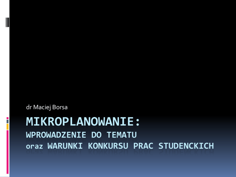dr Maciej Borsa MIKROPLANOWANIE: WPROWADZENIE DO TEMATU oraz WARUNKI KONKURSU PRAC STUDENCKICH Mikroplanowanie Mikroplanowanie to kompleksowa metoda planowania przekształceń przestrzennych, włączająca lokalną społeczność w proces decydowania i współudziału w przemianach ściśle wyznaczonych, niewielkich obszarów. Mikroplanowanie reprezentuje podejście oddolne do procesu planowania („bottom-up”). Mikroplanowanie W teorii ekonomii pojęcie mikroplanowania wprowadził m.in. Jan Tinbergen, holenderski ekonomista specjalizujący się w badaniach krajów rozwijających się, pierwszy laureat Nagrody Nobla z dziedziny ekonomii (1969). W jego ujęciu był to model planowania społecznogospodarczego, w którym plan w skali makro stanowił syntezę mikroplanów. Był więc to system planowania oddolnego, silnie wspierający międzynarodową konkurencyjność kraju. Mikroplanowanie Mikroplanowanie, jako metoda poprawy stanu przestrzeni i dostępu mieszkańców do usług, stosowane było pierwotnie w tzw. „Krajach Trzeciego Świata”, głównie w społecznościach wiejskich i zmarginalizowanych dzielnicach miast. Celem było włączenie lokalnych społeczności w główny nurt programowania i działań władz wyższego szczebla, m.in. w celu uzyskania dostępu do źródeł finansowania. Metoda uświadamia bowiem mieszkańcom skalę wydatków i konieczność właściwego zaplanowania (koordynacji) niezbędnych inwestycji, wzmacniając odpowiedzialność za własne otoczenie. Mikroplanowanie W latach 1980-tych rozwinięto w krajach anglosaskich metodę sporządzania „Planów społeczności lokalnych” (Community planning), obejmującą bardziej kompleksowy sposób podejścia do programowania i planowania rozwoju na szczeblu lokalnym. Mikroplanowanie można uznać, za część tej metody. W latach 1990-tych metoda mikroplanowania, po doświadczeniach w krajach rozwijających się została adaptowana do stosowania także w krajach rozwiniętych. W pierwszej dekadzie XXI wieku była stosowana z powodzeniem w wielu krajach, w tym szczególnie w Indiach i Brazylii. Podejmowane były też próby jej wdrożenia w Polsce. Główne cechy współczesnego mikroplanowania to: przywiązywanie szczególnej uwagi do rozpoznania i zaspokojenia potrzeb grup docelowych – mieszkańców, właścicieli, inwestorów, gości/klientów; ukierunkowanie na szczegółowe rozpoznanie i uwzględnienie w proponowanych rozwiązaniach specyfiki przekształcanego obszaru; ograniczone ramy przestrzenno-czasowe proponowanych rozwiązań, co predestynuje je do bezpośredniego finansowania w systemie projektowym oraz stosowania partnerstwa publiczno-prywatnego; zdecentralizowane podejście do procesu planistycznego – plany niższego szczebla mają sugerować rozwiązania planom i działaniom wyższych szczebli; oparcie procesu projektowego na partnerstwie profesjonalnych planistów z lokalną społecznością; sam proces planowania jest tak samo ważny jak jego produkt; w urbanistyce jest to narzędzie wspomagające tradycyjne metody planowania przestrzennego, zwłaszcza na obszarach centrów miast lub strefach koncentracji negatywnych zjawisk przestrzennych i społecznych. Zalety mikroplanowania to przede wszystkim: lepsze wykorzystanie zasobów; efektywniejszy rozwój; zwiększanie zaangażowania i odpowiedzialności mieszkańców; usprawnianie organizacji i poprawa koordynacji działań administracji publicznej, szczególnie na najniższych szczeblach; bardziej unikalne (specyficzne) efekty działań projektowych, prowadzące do bardziej zindywidualizowanych i konkurencyjnych rozwiązań. KONCEPCJE STYMULUJĄCE ROZWÓJ FUNKCJI CENTROTWÓRCZYCH RYBNIKA W REJONIE ULIC SOBIESKIEGO-POWSTAŃCÓW Konkurs prac studenckich Konkurs prac studenckich Warunki zgoda na wykorzystanie wyników prac w publikacjach i syntezach nagrody pieniężne: 1 główna 2 wyróżnienia (razem 1200 zł brutto) Konkurs prac studenckich Zadania profilowanie (analiza: jaki jest zadany obszar oraz jakie pełni i jakie może pełnić funkcje?) mapowanie idea projektowa koncepcja wdrażania prezentacja, rozmowa z mieszkańcami Profilowanie Delimitacja (określenie granic mikroobszaru) Analiza głównych problemów mikroobszaru: lista problemów (wariant 1) drzewo zależności (wariant 2) należy uwzględnić: stan funkcjonalny – wewnętrzny (jakie są jego strefy, pełniące różne funkcje) oraz powiązania zewnętrzne (jaką funkcję pełni obszar w tej części miasta) stan techniczny stan własności (prywatne vs. publiczne) stan społeczny status ekonomiczny Określenie możliwości i kierunków przekształceń Profilowanie drzewo zależności: korona - skutki pień - problemy korzenie - przyczyny Drzewo zależności nie definiuje samych problemów, traktując je jako splot różnych zależności. Jego analiza skupia się na oddzieleniu przyczyn negatywnych zjawisk występujących na mikroobszarze od ich skutków. Tylko przyczyny wymagają bowiem interwencji. Problem widziany więc powinien być przez pryzmat przyczyn. Mapowanie - format sporządzenie mapy w skali 1:200, pokazującej główne problemy i zasadnicze idee przekształceń obszaru rysunek odręczny na podkładzie powiększonej mapy (5-cio krotnie) opisy pismem technicznym lub wklejane z wydruku komputerowego (czcionka min. 12 punktów) Mapowanie - zagadnienia Stan funkcjonalny – wewnętrzny oraz kierunki powiązań zewnętrznych (wejścia itp. ale też kolizje funkcjonalne) Stan techniczny Stan własności Stan społeczny Status ekonomiczny Poszczególne projektowane elementy koncepcji zagospodarowania (rozmieszczenie, podmiot realizujący – właściciel / gmina) Strefy działań: (1) miasto, (2) inwestorzy prywatni Opis idei projektowej Skrót analizy funkcjonalnej (wewnętrzne i zewnętrzne, konflikty, kolizje), technicznej, własnościowej, społecznej i ekonomicznej Opis pomysłu na nowe funkcje i rolę w mieście Opis koncepcji (idei) zagospodarowania z podziałem