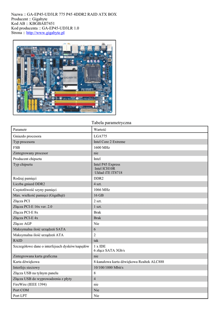 Nazwa :: GA-EP45-UD3LR 775 P45 4DDR2 RAID ATX BOX Producent :: Gigabyte Kod AB :: KBGBAII7451 Kod producenta :: GA-EP45-UD3LR 1.0 Strona :: http://www.gigabyte.pl Tabela parametryczna Parametr Wartość Gniazdo procesora LGA775 Typ procesora Intel Core 2 Extreme FSB 1600 MHz Zintegrowany procesor nie Producent chipsetu Intel Typ chipsetu Intel P45 Express Intel ICH10R Układ iTE IT8718 Rodzaj pamięci DDR2 Liczba gniazd DDR2 4 szt. Częstotliwość szyny pamięci 1066 MHz Max. wielkość pamięci (GigaBajt) 16 GB Złącza PCI 2 szt. Złącza PCI-E 16x ver. 2.0 1 szt. Złącza PCI-E 8x Brak Złącza PCI-E 4x Brak Złącze AGP Nie Maksymalna ilość urządzeń SATA 6 Maksymalna ilość urządzeń ATA 2 RAID tak Szczegółowe dane o interfejsach dysków/napędów 1 x IDE 6 złącz SATA 3Gb/s Zintegrowana karta graficzna nie Karta dźwiękowa 8-kanałowa karta dźwiękowa Realtek ALC888 Interfejs sieciowy 10/100/1000 Mbit/s Złącza USB na tylnym panelu 8 Złącza USB do wyprowadzenia z płyty 4 FireWire (IEEE 1394) nie Port COM Nie Port LPT Nie Parametr Wartość Interfejsy na tylnym panelu 1 port myszy PS/2 1 x RJ45 LAN 1 x wyjście cinch SPDIF 1 x optyczne wyjście SPDIF 6 x złącze audio (Line In / Line Out / MIC In / Surround Speaker Out(Rear Speaker Out) / Center/Subwoofer Speaker Out / Side Speaker Out) 8 x USB 2.0/1.1 2 x PS/2 (klawiatura/mysz) Złącza dostępne na płycie 1 złącze zasilania 24-pin ATX 1 złącze zasilania 4-pin ATX 12V 1 x CD in 1 x złącze dla czujnika otwarcia obudowy 1 x COM 1 złącze wentylatora procesora 1 x FDD 1 złącze front panel audio 1 złącze front panel 1 x IDE 1 Złącze pinowe LPT 1 złącze wentylatora zasilacza 1 złącze power LED 1 x SPDIF in 1 x SPDIF out 2 złącza wentylatora procesora 2 x USB 2.0/1.1 6 złącz SATA 3Gb/s Funkcje specjalne BIOS Centrum pobierania DualBIOS Q-Flash Wsparcie dla EasyTune 6 Wspiera technologie Q-Share Wspiera technologie Time Repair Xpress Install Xpress Recovery 2 Bios 2 x 8 Mbit flash ROM Award BIOS PnP 1.0a, DMI 2.0, SM BIOS 2.4, ACPI 1.0b Obsługa technologii DualBIOS Format płyty ATX Wymiary 305mm x 210mm