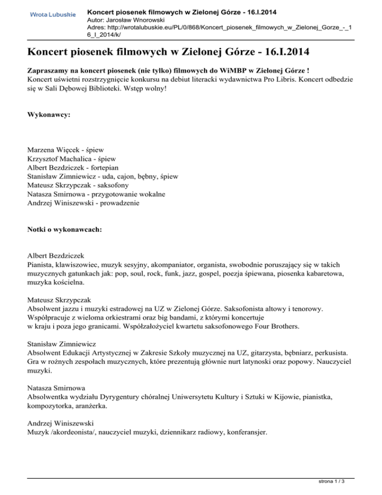Koncert piosenek filmowych w Zielonej Górze - 16.I.2014 Autor: Jarosław Wnorowski Adres: http://wrotalubuskie.eu/PL/0/868/Koncert_piosenek_filmowych_w_Zielonej_Gorze_-_1 6_I_2014/k/ Koncert piosenek filmowych w Zielonej Górze - 16.I.2014 Zapraszamy na koncert piosenek (nie tylko) filmowych do WiMBP w Zielonej Górze ! Koncert uświetni rozstrzygnięcie konkursu na debiut literacki wydawnictwa Pro Libris. Koncert odbedzie się w Sali Dębowej Biblioteki. Wstęp wolny! Wykonawcy: Marzena Więcek - śpiew Krzysztof Machalica - śpiew Albert Bezdziczek - fortepian Stanisław Zimniewicz - uda, cajon, bębny, śpiew Mateusz Skrzypczak - saksofony Natasza Smirnowa - przygotowanie wokalne Andrzej Winiszewski - prowadzenie Notki o wykonawcach: Albert Bezdziczek Pianista, klawiszowiec, muzyk sesyjny, akompaniator, organista, swobodnie poruszający się w takich muzycznych gatunkach jak: pop, soul, rock, funk, jazz, gospel, poezja śpiewana, piosenka kabaretowa, muzyka kościelna. Mateusz Skrzypczak Absolwent jazzu i muzyki estradowej na UZ w Zielonej Górze. Saksofonista altowy i tenorowy. Współpracuje z wieloma orkiestrami oraz big bandami, z którymi koncertuje w kraju i poza jego granicami. Współzałożyciel kwartetu saksofonowego Four Brothers. Stanisław Zimniewicz Absolwent Edukacji Artystycznej w Zakresie Szkoły muzycznej na UZ, gitarzysta, bębniarz, perkusista. Gra w rożnych zespołach muzycznych, które prezentują głównie nurt latynoski oraz popowy. Nauczyciel muzyki. Natasza Smirnowa Absolwentka wydziału Dyrygentury chóralnej Uniwersytetu Kultury i Sztuki w Kijowie, pianistka, kompozytorka, aranżerka. Andrzej Winiszewski Muzyk /akordeonista/, nauczyciel muzyki, dziennikarz radiowy, konferansjer. strona 1 / 3 Koncert piosenek filmowych w Zielonej Górze - 16.I.2014 Autor: Jarosław Wnorowski Adres: http://wrotalubuskie.eu/PL/0/868/Koncert_piosenek_filmowych_w_Zielonej_Gorze_-_1 6_I_2014/k/ Krzysztof Machalica Radny Miasta Zielona Góra, brat aktorów Piotra i Aleksandra Machaliców, syn Henryka Machalicy. Wraz z bratem piotrem zagrał w polsko-brytyjskiej fabule pt. ”Great Brytania” w reż. Charlesa Duka, gdzie wcielił się w postać bezdomnego. Marzena Więcek Aktorka, reżyserka, lektorka, poetka, montażystka. Laureatka ponad 100 nagród na festiwalach filmowych, literackich i teatralnych. Dyrektor Akademii Twórczych Poszukiwań, w ramach której działają Lubuska Szkoła Telewizji i Filmu oraz Lubuska Szkoła Fotografii. W REPERTUARZE: 1. Na zakręcie muzyka: Przemysław Gintrowski słowa: Agnieszak osiecka 2. Uciekaj moje serce muzyka: Seweryn Krajewski Słowa: Agnieszka Osiecka 3. W ciemności do siebie idziemy muzyka: Przemysław Gintrowski słowa: Ernest Bryll 4. Wyrzeźbiłem Twoją twarz w powietrzu muzyka: Jerzy Matuszkiewicz słowa: Agnieszka Osiecka 5. Widzisz mała muzyka: Jarosław Abramow słowa: Agieszka Osiecka 6. Tylko wróć muzyka: Jerzy Duduś Matuszkiewicz słowa: Wojciech Młynarski 7. A my nie chcemy uciekać stąd muzyka: Przemysław Gintrowski słowa: Jacek Kaczmarski 8. Trochę miejsca słowa: Wojciech Młynarski 9. Weselne dzieci muzyka: Katarzyna Gaertner słowa: Agnieszka Osiecka strona 2 / 3 Koncert piosenek filmowych w Zielonej Górze - 16.I.2014 Autor: Jarosław Wnorowski Adres: http://wrotalubuskie.eu/PL/0/868/Koncert_piosenek_filmowych_w_Zielonej_Gorze_-_1 6_I_2014/k/ 10. Przekleństwo Milhaven muzyka, słowa: Nick Cave tłumaczenie: Leszek Kołakowski 11. Ludzkie gadanie słowa: Agnieszka Osiecka muzyka: Seweryn Krajewski Czas trwania: ok. 1 godz. 35 minut Linki do wybranych wykonań z próby generalnej: http://www.youtube.com/watch?v=bXxx6Y0hDNM http://www.youtube.com/watch?v=-fjGA-Fl2-Q http://www.youtube.com/watch?v=17uFGhM-Nfw http://www.youtube.com/watch?v=qKRpk9CMDWs strona 3 / 3 Powered by TCPDF (www.tcpdf.org)