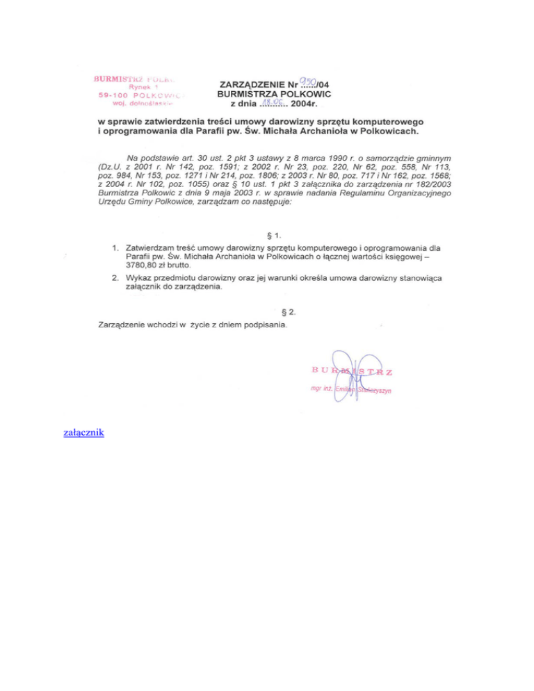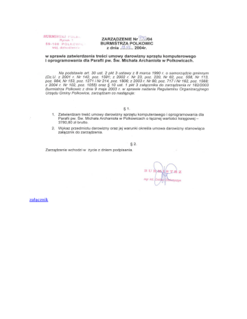 załącznik załącznik do Zarządzenia nr 950/04 Burmistrza Polkowic z dnia 18.06.2004 r. UMOWA DAROWIZNY zawarta w dniu .................... w Polkowicach pomiędzy Gminą Polkowice z siedzibą w Polkowicach, ul. Rynek 1, reprezentowaną przez Burmistrza Polkowic, w imieniu którego działają: mgr inż. Wiesław Wabik – Z-ca Burmistrza przy kontrasygnacie Skarbnika Gminy - Krystyny Kozłowskiej , zwaną w treści umowy „Darczyńcą”, a Parafią pw. Św.Michała Archanioła w Polkowicach, pl. Kościelny 1, w imieniu której działa: Proboszcz parafii Ksiądz Prałat dr Ludwik Kośmidek zwanym w treści umowy „ Obdarowanym”, o następującej treści: § 1. Przedmiotem umowy jest: Oprogramowanie MS Windows XP Professional o wartości księgowej 657,18 zł brutto, MS Office 2003 Standard o wartości księgowej 1167,96 zł brutto, zestaw komputerowy (AMD Athlon 2000+ Thorton, płyta gł. ECS KM400-M2, 256 MB RAM, HD Seagate 40 GB, napęd combo DVD/CD-RW, FDD, klawiatura, mysz, monitor Hyundai Q770+ oprogramowanie Nero, + kable zasilające) o numerze inwentarzowym ..................................... i wartości księgowej 1955,66 zł. brutto. § 2. 1. Darczyńca przekazuje Obdarowanemu na własność bezpłatnie przedmiot darowizny opisany w § 1 i oświadcza, że jest on wolny od obciążeń i praw osób trzecich. 2. Obdarowany oświadcza, że darowiznę określoną w § 1 niniejszej umowy przyjmuje i nie wnosi uwag do stanu technicznego przekazywanego sprzętu komputerowego i oprogramowania. 3. Wydanie przedmiotu darowizny nastąpi w dniu podpisania umowy na podstawie protokołu zdawczo – odbiorczego stanowiącego załącznik do umowy. § 3. Wszelkie koszty i opłaty związane z zawarciem umowy ponosi Obdarowany. § 4. W sprawach dotyczących przedmiotu niniejszej umowy, a nieuregulowanych jej postanowieniami, maja zastosowanie przepisy kodeksu cywilnego. § 5. Ewentualne mogące wynikać na tle stosowania umowy spory strony poddają pod rozstrzygnięcie sądu powszechnego właściwego ze względu na siedzibę Darczyńcy. § 6. Umowę sporządzono w 4 jednobrzmiących egzemplarzach, 3 egz. dla Darczyńcy i 1 egz. dla Obdarowanego. DARCZYŃCA OBDAROWANY