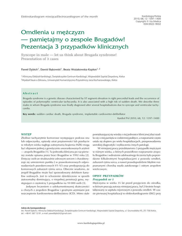Kardiologia Polska 2010; 68, 12: 1397–1400 Copyright © Via Medica ISSN 0022–9032 Elektrokardiogram miesiąca/Electrocardiogram of the month Omdlenia u mężczyzn — pamiętajmy o zespole Brugadów! Prezentacja 3 przypadków klinicznych Syncope in male — let us think about Brugada syndrome! Presentation of 3 cases Paweł Dybich1, Dawid Bąkowski1, Beata Wożakowska−Kapłon1, 2 1I Kliniczny Oddział Kardiologii, Świętokrzyskie Centrum Kardiologii, Wojewódzki Szpital Zespolony, Kielce 2Wydział Nauk o Zdrowiu, Uniwersytet Humanistyczno-Przyrodniczy Jana Kochanowskiego, Kielce Abstract Brugada syndrome is a genetic disease characterised by ST segment elevation in right precordial leads and the occurrence of episodes of polymorphic ventricular tachycardia. It is also associated with a high risk of sudden death. We describe three males in whom Brugada syndrome was finally diagnosed after several hospitalisations due to syncope and ventricular tachycardia. Key words: sudden cardiac death, Brugada syndrome, implantable cardioverter-defibrillator Kardiol Pol 2010; 68, 12: 1397–1400 WSTĘP Złośliwe tachyarytmie komorowe występujące podczas snu lub odpoczynku, epizody utrat przytomności lub przebycie w młodym wieku nagłego zatrzymania krążenia (NZK) mogą być objawem jednej z genetycznie uwarunkowanych arytmii — zespołu Brugadów [1]. Ta jednostka kliniczna po raz pierwszy została opisana przez braci Brugadów w 1992 roku [2]. Dotyczy osób ze strukturalnie zdrowym sercem i charakteryzuje się uniesieniem punktu J w prawokomorowych odprowadzeniach przedsercowych V1–V3 oraz predyspozycją do komorowych zaburzeń rytmu serca. Obecnie wiadomo, że zespół Brugadów może być spowodowany defektem kanałów sodowych. Jest to schorzenie dziedziczone w sposób autosomalny dominujący, o niepełnej penetracji genu, występujące z częstością 5 przypadków na 10 000 osób [3]. Jedynym leczeniem o udokumentowanej skuteczności u chorych z zespołem Brugadów i groźnymi arytmiami jest wszczepienie kardiowertera-defibrylatora (ICD). Mimo stale powiększającej się wiedzy o tej jednostce klinicznej zbyt rzadko się o niej pamięta w codziennej praktyce, a rozpoznanie często ustala się dopiero po wielu hospitalizacjach, przeprowadzeniu szerokiej diagnostyki i wykluczeniu innych patologii. W niniejszej pracy przedstawiono 3 przypadki mężczyzn w różnym wieku, u których prawidłowe rozpoznanie zespołu Brugadów i wdrożenie adekwatnego leczenia było poprzedzone kilkukrotnymi hospitalizacjami z powodu omdleń, zaburzeń rytmu serca, a nawet prawdopodobnie błędnie rozpoznanymi chorobą węzła zatokowego i ostrym zespołem wieńcowym. OPISY PRZYPADKÓW Przypadek nr 1 Mężczyzna w wieku 35 lat przed przyjęciem do ośrodka, w którym pracują autorzy niniejszej pracy, był 2-krotnie hospitalizowany w szpitalu rejonowym z powodu omdleń. W czasie pierwszej hospitalizacji w elektrokardiogramie (EKG) przy Adres do korespondencji: lek. Paweł Dybich, I Kliniczny Oddział Kardiologii, Świętokrzyskie Centrum Kardiologii, Wojewódzki Szpital Zespolony, ul. Grunwaldzka 45, 25–736 Kielce, tel: +48 41 367 13 91, e-mail: [email protected] www.kardiologiapolska.pl 1398 Paweł Dybich et al. Rycina 1. Obraz EKG u 35-letniego mężczyzny z pierwszej hospitalizacji: nienapadowy częstoskurcz z łącza o częstotliwości 100/min z poszerzeniem zespołów QRS do 130 ms i uniesieniem odcinka ST w V1–V2 o 2 mm (różnicowano z zespołem preekscytacji) przyjęciu stwierdzono nienapadowy częstoskurcz z łącza z poszerzeniem zespołów QRS do 130 ms, uniesieniem punktu J > 2 mm i wypukłym uniesieniem odcinka ST o 2 mm w odprowadzeniach V1–V2 (obraz różnicowano z zespołem preekscytacji) (ryc. 1). Po ustąpieniu arytmii w EKG stwierdzono blok przedsionkowo-komorowy I stopnia (odstęp PQ = 250 ms). W EKG metodą Holtera stwierdzono liczne pobudzenia przedwczesne, prawdopodobnie z łącza, oraz krótkie okresy migotania przedsionków i czynnego rytmu z łącza o częstotliwości 95/min. W badaniu echokardiograficznym nie zarejestrowano istotnej patologii, czynność skurczowa lewej komory pozostawała prawidłowa. W badaniu neurologicznym nie stwierdzono nieprawidłowości. Chorego wypisano do domu z zaleceniem przyjmowania metoprololu 50 mg/d. i kontrolnego monitorowania EKG metodą Holtera za 4 tygodnie. Pacjent został przyjęty do ośrodka, w którym pracują autorzy niniejszej pracy, po kolejnym epizodzie omdlenia z obrazem częstoskurczu z szerokimi zespołami QRS. Powrót rytmu zatokowego uzyskano po kardiowersji elektrycznej. W koronarografii nie stwierdzono zmian w tętnicach wieńcowych. U chorego wykonano próbę z propafenonem, a na- stępnie badanie elektrofizjologiczne, w czasie którego nie ujawniono dodatkowej drogi przewodzenia, podłoża arytmii komorowej i nadkomorowej poddającej się ablacji. W standardowym EKG zarejestrowano obraz odpowiadający typowi 3 zmian zespołu Brugadów, co w połączeniu z wywiadem nagłych zgonów w rodzinie zadecydowało o rozpoznaniu. Ze względu na nawracające omdlenia w przebiegu arytmii, zagrożenie nagłym zgonem sercowym u pacjenta implantowano ICD. W 8-miesięcznej obserwacji nie odnotowano interwencji ICD. Przypadek nr 2 Mężczyzna w wieku 52 lat z omdleniami w wywiadzie, z podejrzeniem choroby węzła zatokowego, został przyjęty na oddział kardiologii po utracie przytomności. W EKG przy przyjęciu stwierdzono rytm zatokowy o częstotliwości 80/min, lewogram i blok prawej odnogi pęczka Hisa. W badaniu echokardiograficznym zaobserwowano hipokinezę segmentów przegrodowych mięśnia lewej komory i frakcję wyrzutową wynoszącą ok. 50%. W 1. dobie pobytu na oddziale u chorego wystąpiło migotanie komór z NZK. W wyniku defibrylacji przywrócono rytm zatokowy i czynność hemodynamiczną www.kardiologiapolska.pl 1399 Omdlenia u mężczyzn — pamiętajmy o zespole Brugadów! Rycina 2. Obraz EKG u 52-letniego pacjent