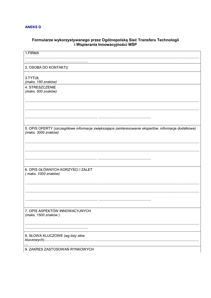 ANEKS D Formularze wykorzystywanego przez Ogólnopolską Sieć Transferu Technologii i Wspierania Innowacyjności MŚP 1.FIRMA ................................................................................................................................................................................. ................................................................ 2. OSOBA DO KONTAKTU 3.TYTUŁ (maks. 150 znaków) 4. STRESZCZENIE (maks. 500 znaków) ................................................................................................................................................................................. ................................................................................................................................................................................. .......................................................................... ..................................................... 5. OPIS OFERTY (szczegółowe informacje zwiększające zainteresowanie ekspertów, informacje dodatkowe) (maks. 3000 znaków) ................................................................................................................................................................................. ................................................................................................................................................................................. ......................................................................... ...................................................... 6. OPIS GŁÓWNYCH KORZYŚCI I ZALET ( maks. 1000 znaków) ................................................................................................................................................................................. ................................................................................................................................................................................. .......................................................................... ..................................................... 7. OPIS ASPEKTÓW INNOWACYJNYCH (maks. 1500 znaków ) ................................................................................................................................................................................. ................................................................ 8. SŁOWA KLUCZOWE (wg listy słów kluczowych)............................................................................................................................................................. ... 9. ZAKRES ZASTOSOWAŃ RYNKOWYCH Rolnictwo, zasoby morza i produkty rolnictwo – leśnictwo przetwarzanie informacji, systemy Ŝywność - przemysł Przemysł informatyczne rolno-spoŜywczy produkcja przemysłowa telekomunikacja Rybołówstwo, zasoby transport Energia morza technologie lotnicze Nauki biologiczne Pomiary i technologie budowlane standaryzacja medycyna, zdrowe technologie materiałowe biotechnologia narzędzia pomiarowe technologie chemiczne weterynaria wzorce, substancje automatyka / robotyka farmaceutyka / kosmetyka wzorcowe przemysł metali cięŜkich Środowisko standardy, Jakość wytapianie INNE ochrona środowiska Technologia Informatyczna zarządzanie odpadami ............................................ elektronika, bezpieczeństwo nuklearne – ochrona przed ....................... mikroelektronika promieniowaniem radioaktywnym ............................................ ....................... ............................................ ....................... 10. POTENCJALNI PARTNERZY (BRANśE, PODMIOTY, SEKTORY, ITD.): 11. STOPIEŃ ZAAWANSOWANIA w fazie rozwoju demonstracji 12. PRAWA WŁASNOŚCI INTELEKTUALNEJ ZłoŜone wnioski patentowe Wzór uŜytkowy ZastrzeŜone prawa autorskie know-how 13. OFERTA WYKORZYSTUJE WYNIKI BADAŃ nie wykorzystuje projektów z Programów Ramowych projektów finansowanych przez KBN EUREKA własnych / prywatnych Inne.................................................... 14. TYP WSPÓŁPRACY Umowa licencyjna wsparciem technicznym Współpraca techniczna Inne …………….............…… dostępny na rynku dostępny do Prawa wyłączności Poufne / tajne Opatentowa ne na terenie: Polski Świata Podzlecenie Umowa handlowa ze Umowa produkcyjna Umowa Joint Venture WSKAZÓWKI DO FORMULARZA OFERTY TECHNOLOGICZNEJ 1. 2. 3. 4. • • • • 5. • • 6. 7. 8. 9. 10. Nazwa Firmy Osoba do kontaktu Tytuł - powinien być jasny i klarowny dla osoby, która nie jest ekspertem w danej dziedzinie. Streszczenie - powinno zawierać odpowiedzi na następujące pytania Skąd geograficznie pochodzi firma oferująca technologię? Jaki jest profil działalności instytucji oferującej technologię / produkt / usług? Do czego technologia moŜe być zastosowana? Na jakim etapie rozwoju znajduje się oferowana technologia (etap laboratoryjny, opracowywana, juŜ dostępna itp.)? Opis oferty Szczegółowy opis oferowanej technologii, dane techniczne, parametry. Inne informacje pozwalające potencjalnemu partnerowi na zorientowanie się co do moŜliwości zastosowań Opis głównych korzyści i zalet – proszę wymienić w punktach korzyści ze stosowania oferty i najwaŜniejsze zalety technologii/produktu/usługi. Opis aspektów innowacyjnych – proszę wymienić takie cechy produktu, które sprawiają, Ŝe oferta jest innowacyjna. Słowa Kluczowe Zakres zastosowań rynkowych Potencjalni partnerzy – w przypadku, gdy firma oferująca technologię chce z nią dotrzeć do konkretnych adresatów, proszę o ich wymienienie 1. FIRMA ................................................................................................................................................................................. ..................................... 2. OSOBA DO KONTAKTU 3. TYTUŁ ZAPYTANIA (maks. 150 znaków) .................................................................................................