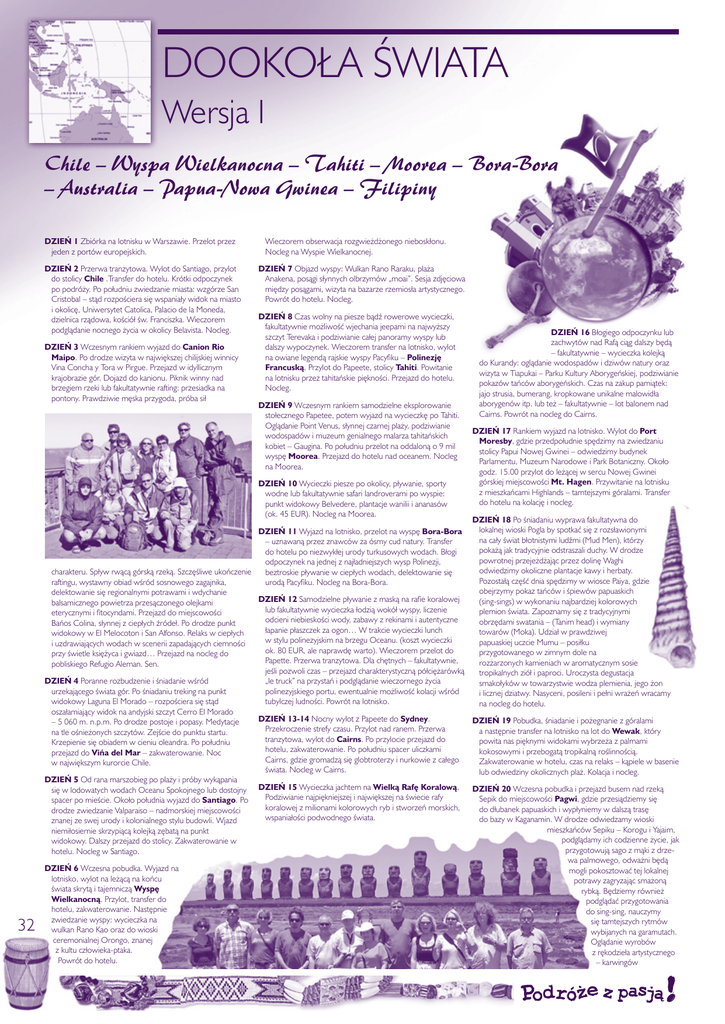 DOOKOŁA ÂWIATA Wersja I Chile – Wyspa Wielkanocna – Tahiti – Moorea – Bora-Bora – Australia – Papua-Nowa Gwinea – Filipiny DZIE¡ 1 Zbiórka na lotnisku w Warszawie. Przelot przez jeden z portów europejskich. DZIE¡ 2 Przerwa tranzytowa. Wylot do Santiago, przylot do stolicy Chile .Transfer do hotelu. Krótki odpoczynek po podró˝y. Po południu zwiedzanie miasta: wzgórze San Cristobal – stàd rozpoÊciera si´ wspaniały widok na miasto i okolic´, Uniwersytet Catolica, Palacio de la Moneda, dzielnica rzàdowa, koÊciół Êw. Franciszka. Wieczorem podglàdanie nocnego ˝ycia w okolicy Belavista. Nocleg. DZIE¡ 3 Wczesnym rankiem wyjazd do Canion Rio Maipo. Po drodze wizyta w najwi´kszej chilijskiej winnicy Vina Concha y Tora w Pirgue. Przejazd w idyllicznym krajobrazie gór. Dojazd do kanionu. Piknik winny nad brzegiem rzeki lub fakultatywnie rafting: przesiadka na pontony. Prawdziwie m´ska przygoda, próba sił i Wieczorem obserwacja rozgwie˝d˝onego nieboskłonu. Nocleg na Wyspie Wielkanocnej. DZIE¡ 7 Objazd wyspy: Wulkan Rano Raraku, pla˝a Anakena, posàgi słynnych olbrzymów „moai”. Sesja zdj´ciowa mi´dzy posàgami, wizyta na bazarze rzemiosła artystycznego. Powrót do hotelu. Nocleg. DZIE¡ 8 Czas wolny na piesze bàdê rowerowe wycieczki, fakultatywnie mo˝liwoÊç wjechania jeepami na najwy˝szy szczyt Terevaka i podziwianie całej panoramy wyspy lub dalszy wypoczynek. Wieczorem transfer na lotnisko, wylot na owiane legendà rajskie wyspy Pacyfiku – Polinezj´ Francuskà. Przylot do Papeete, stolicy Tahiti. Powitanie na lotnisku przez tahitaƒskie pi´knoÊci. Przejazd do hotelu. Nocleg. DZIE¡ 9 Wczesnym rankiem samodzielne eksplorowanie stołecznego Papetee, potem wyjazd na wycieczk´ po Tahiti. Oglàdanie Point Venus, słynnej czarnej pla˝y, podziwianie wodospadów i muzeum genialnego malarza tahitaƒskich kobiet – Gaugina. Po południu przelot na oddalonà o 9 mil wysp´ Moorea. Przejazd do hotelu nad oceanem. Nocleg na Moorea. DZIE¡ 10 Wycieczki piesze po okolicy, pływanie, sporty wodne lub fakultatywnie safari landroverami po wyspie: punkt widokowy Belvedere, plantacje wanilii i ananasów (ok. 45 EUR). Nocleg na Moorea. 32 DZIE¡ 16 Błogiego odpoczynku lub zachwytów nad Rafà ciàg dalszy b´dà – fakultatywnie – wycieczka kolejkà do Kurandy: oglàdanie wodospadów i dziwów natury oraz wizyta w Tiapukai – Parku Kultury Aborygeƒskiej, podziwianie pokazów taƒców aborygeƒskich. Czas na zakup pamiàtek: jajo strusia, bumerang, kropkowane unikalne malowidła aborygenów itp. lub te˝ – fakultatywnie – lot balonem nad Cairns. Powrót na nocleg do Cairns. DZIE¡ 17 Rankiem wyjazd na lotnisko. Wylot do Port Moresby, gdzie przedpołudnie sp´dzimy na zwiedzaniu stolicy Papui Nowej Gwinei – odwiedzimy budynek Parlamentu, Muzeum Narodowe i Park Botaniczny. Około godz. 15.00 przylot do le˝àcej w sercu Nowej Gwinei górskiej miejscowoÊci Mt. Hagen. Przywitanie na lotnisku z mieszkaƒcami Highlands – tamtejszymi góralami. Transfer do hotelu na kolacj´ i nocleg. DZIE¡ 18 Po Êniadaniu wyprawa fakultatywna do lokalnej wioski Pogla by spotkaç si´ z rozsławionymi DZIE¡ 11 Wyjazd na lotnisko, przelot na wysp´ Bora-Bora na cały Êwiat błotnistymi ludêmi (Mud Men), którzy – uznawanà przez znawców za ósmy cud natury. Transfer poka˝à jak tradycyjnie odstraszali duchy. W drodze do hotelu po niezwykłej urody turkusowych wodach. Błogi powrotnej przeje˝d˝ajàc przez dolin´ Waghi odpoczynek na jednej z najładniejszych wysp Polinezji, odwiedzimy okoliczne plantacje kawy i herbaty. charakteru. Spływ rwàcà górskà rzekà. Szcz´Êliwe ukoƒczenie beztroskie pływanie w ciepłych wodach, delektowanie si´ Pozostałà cz´Êç dnia sp´dzimy w wiosce Paiya, gdzie raftingu, wystawny obiad wÊród sosnowego zagajnika, urodà Pacyfiku. Nocleg na Bora-Bora. obejrzymy pokaz taƒców i Êpiewów papuaskich delektowanie si´ regionalnymi potrawami i wdychanie DZIE¡ 12 Samodzielne pływanie z maskà na rafie koralowej (sing-sings) w wykonaniu najbardziej kolorowych balsamicznego powietrza przesàczonego olejkami lub fakultatywnie wycieczka łodzià wokół wyspy, liczenie plemion Êwiata. Zapoznamy si´ z tradycyjnymi eterycznymi i fitocyndami. Przejazd do miejscowoÊci odcieni niebieskoÊci wody, zabawy z rekinami i autentyczne obrz´dami swatania – (Tanim head) i wymiany Baƒos Colina, słynnej z ciepłych êródeł. Po drodze punkt łapanie płaszczek za ogon… W trakcie wycieczki lunch towarów (Moka). Udział w prawdziwej widokowy w El Melocoton i San Alfonso. Relaks w ciepłych w stylu polinezyjskim na brzegu Oceanu. (koszt wycieczki papuaskiej uczcie Mumu – posiłku i uzdrawiajàcych wodach w scenerii zapadajàcych ciemnoÊci ok. 80 EUR, ale naprawd´ warto). Wieczorem przelot do przygotowanego w zimnym dole na przy Êwietle ksi´˝yca i gwiazd… Przejazd na nocleg do Papette. Przerwa tranzytowa. Dla ch´tnych – fakultatywnie, roz˝arzonych kamieniach w aromatycznym sosie pobliskiego Refugio Aleman. Sen. jeÊli pozwoli czas – przejazd charakterystycznà półci´˝arówkà tropikalnych ziół i paproci. Uroczysta degustacja DZIE¡ 4 Poranne rozbudzenie i Êniadanie wÊród „le truck” na przystaƒ i podglàdanie wieczornego ˝ycia smakołyków w towarzystwie wodza plemienia, jego ˝on urzekajàcego Êwiata gór. Po Êniadaniu treking na punkt polinezyjskiego portu, ewentualnie mo˝liwoÊç kolacji wÊród i licznej dziatwy. Nasyceni, posileni i pełni wra˝eƒ wracamy widokowy Laguna El Morado – rozpoÊciera si´ stàd tubylczej ludnoÊci. Powrót na lotnisko. na nocleg do hotelu. oszałamiajàcy widok na andyjski szczyt Cerro El Morado DZIE¡ 13-14 Nocny wylot z Papeete do Sydney. DZIE¡ 19 Pobudka, Êniadanie i po˝egnanie z góralami – 5 060 m. n.p.m. Po drodze postoje i popasy. Medytacje Przekroczenie strefy czasu. Przylot nad ranem. Przerwa a nast´pnie transfer na lotnisko na lot do Wewa