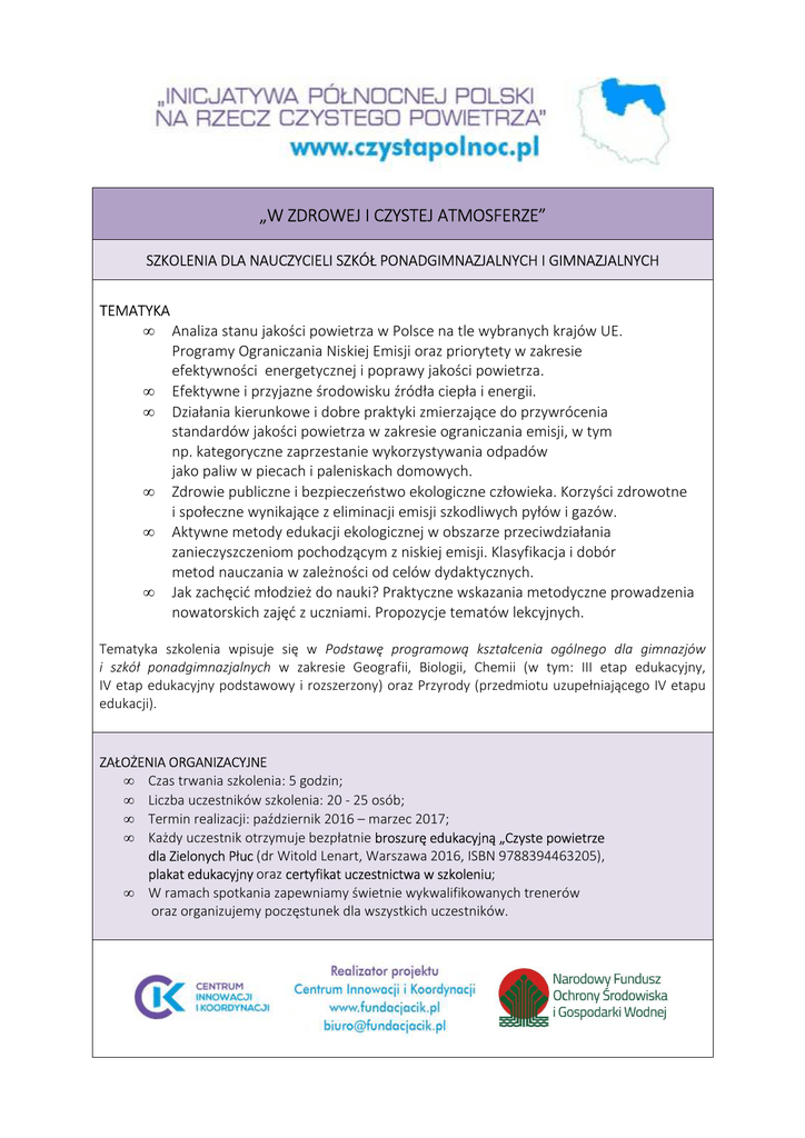 „W ZDROWEJ I CZYSTEJ ATMOSFERZE” SZKOLENIA DLA NAUCZYCIELI SZKÓŁ PONADGIMNAZJALNYCH I GIMNAZJALNYCH TEMATYKA • Analiza stanu jakości powietrza w Polsce na tle wybranych krajów UE. Programy Ograniczania Niskiej Emisji oraz priorytety w zakresie efektywności energetycznej i poprawy jakości powietrza. • Efektywne i przyjazne środowisku źródła ciepła i energii. • Działania kierunkowe i dobre praktyki zmierzające do przywrócenia standardów jakości powietrza w zakresie ograniczania emisji, w tym np. kategoryczne zaprzestanie wykorzystywania odpadów jako paliw w piecach i paleniskach domowych. • Zdrowie publiczne i bezpieczeństwo ekologiczne człowieka. Korzyści zdrowotne i społeczne wynikające z eliminacji emisji szkodliwych pyłów i gazów. • Aktywne metody edukacji ekologicznej w obszarze przeciwdziałania zanieczyszczeniom pochodzącym z niskiej emisji. Klasyfikacja i dobór metod nauczania w zależności od celów dydaktycznych. • Jak zachęcić młodzież do nauki? Praktyczne wskazania metodyczne prowadzenia nowatorskich zajęć z uczniami. Propozycje tematów lekcyjnych. Tematyka szkolenia wpisuje się w Podstawę programową kształcenia ogólnego dla gimnazjów i szkół ponadgimnazjalnych w zakresie Geografii, Biologii, Chemii (w tym: III etap edukacyjny, IV etap edukacyjny podstawowy i rozszerzony) oraz Przyrody (przedmiotu uzupełniającego IV etapu edukacji). ZAŁOŻENIA ORGANIZACYJNE • Czas trwania szkolenia: 5 godzin; • Liczba uczestników szkolenia: 20 - 25 osób; • Termin realizacji: październik 2016 – marzec 2017; • Każdy uczestnik otrzymuje bezpłatnie broszurę edukacyjną „Czyste powietrze dla Zielonych Płuc (dr Witold Lenart, Warszawa 2016, ISBN 9788394463205), plakat edukacyjny oraz certyfikat uczestnictwa w szkoleniu; • W ramach spotkania zapewniamy świetnie wykwalifikowanych trenerów oraz organizujemy poczęstunek dla wszystkich uczestników.