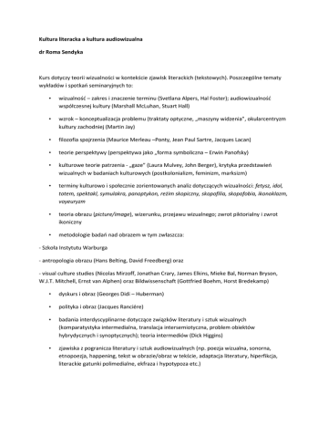 Kultura literacka a kultura audiowizualna dr Roma Sendyka Kurs dotyczy teorii wizualności w kontekście zjawisk literackich (tekstowych). Poszczególne tematy wykładów i spotkań seminaryjnych to: • wizualność – zakres i znaczenie terminu (Svetlana Alpers, Hal Foster); audiowizualność współczesnej kultury (Marshall McLuhan, Stuart Hall) • wzrok – konceptualizacja problemu (traktaty optyczne, „maszyny widzenia”, okularcentryzm kultury zachodniej (Martin Jay) • filozofia spojrzenia (Maurice Merleau –Ponty, Jean Paul Sartre, Jacques Lacan) • teorie perspektywy (perspektywa jako „forma symboliczna – Erwin Panofsky) • kulturowe teorie patrzenia - „gaze” (Laura Mulvey, John Berger), krytyka przedstawień wizualnych w badaniach kulturowych (postkolonializm, feminizm, marksizm) • terminy kulturowo i społecznie zorientowanych analiz dotyczących wizualności: fetysz, idol, totem, spektakl, symulakra, panoptykon, reżim skopiczny, skopofilia, skopofobia, ikonoklazm, voyeuryzm • teoria obrazu (picture/image), wizerunku, przejawu wizualnego; zwrot piktorialny i zwrot ikoniczny • metodologie badań nad obrazem w tym zwłaszcza: - Szkoła Instytutu Warburga - antropologia obrazu (Hans Belting, David Freedberg) oraz - visual culture studies (Nicolas Mirzoff, Jonathan Crary, James Elkins, Mieke Bal, Norman Bryson, W.J.T. Mitchell, Ernst van Alphen) oraz Bildwissenschaft (Gottfried Boehm, Horst Bredekamp) • dyskurs i obraz (Georges Didi – Huberman) • polityka i obraz (Jacques Ranciére) • badania interdyscyplinarne dotyczące związków literatury i sztuk wizualnych (komparatystyka intermedialna, translacja intersemiotyczna, problem obiektów hybrydycznych i synoptycznych); teoria intermediów (Dick Higgins) • zjawiska z pogranicza literatury i sztuk audiowizualnych (np. poezja wizualna, sonorna, etnopoezja, happening, tekst w obrazie/obraz w tekście, adaptacja literatury, hiperfikcja, literackie gatunki polimedialne, ekfraza i hypotypoza etc.)
