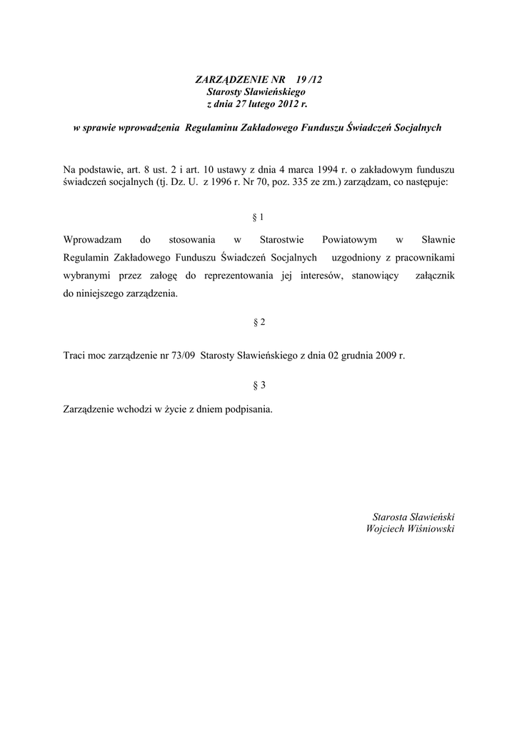 Zarządzenie Nr 19 /12 Starosty Sławieńskiego z dnia 27 lutego