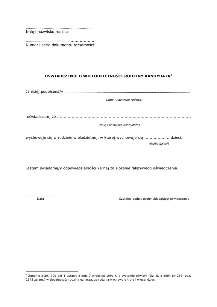 ............................................................... Imię i nazwisko rodzica ……………………………………….................. Numer i seria dokumentu tożsamości OŚWIADCZENIE O WIELODZIETNOŚCI RODZINY KANDYDATA 1 Ja niżej podpisana/y ……………………………………………………………………………………………………………… (imię i nazwisko rodzica) oświadczam, że ...................................................................................................., (imię i nazwisko kandydata) wychowuje się w rodzinie wielodzietnej, w której wychowuje się ................... dzieci. (liczba dzieci) Jestem świadoma/y odpowiedzialności karnej za złożenie fałszywego oświadczenia. ................................ Data .................................................................... Czytelny podpis osoby składającej oświadczenie Zgodnie z art. 20b pkt 1 ustawy z dnia 7 września 1991 r. o systemie oświaty (Dz. U. z 2004 Nr 256, poz. 2572 ze zm.) wielodzietność rodziny oznacza, że rodzina wychowuje troje i więcej dzieci. 1