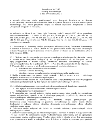 Zarządzenie Nr 53/12 Starosty Sławieńskiego z dnia 25 września 2012 r. w sprawie dzierżawy miejsc parkingowych przy Starostwie Powiatowym w Sławnie w celu sprzedaży kwiatów i zniczy w okresie świat Wszystkich Świętych, ustalenia stawki czynszu dzierżawnego oraz zasad przydziału miejsc na handel artykułami związanymi z dniem „Wszystkich Świętych” w roku 2012. Na podstawie art. 11 ust. 1, art. 23 ust. 1 pkt 7a ustawy z dnia 21 sierpnia 1997 roku o gospodarce nieruchomościami (Dz. U. z 2010 r. Nr 102, poz. 651, Nr 106, poz. 675, Nr 143, poz. 963, Nr 155, poz. 1043, Nr 194, poz. 1307, Nr 200, poz. 1323: Dz. U. z 2011 r. Nr 64, poz. 341, Nr 106, poz. 622, Nr 115, poz. 673, Nr 129, poz. 732, Nr 130, poz. 762, Nr 135, poz. 789, Nr 187, poz. 1110) zarządzam, co następuje: § 1. Przeznaczyć do dzierżawy miejsca parkingowe od bramy głównej Cmentarza Komunalnego w Sławnie w kierunku ul. Pułku Ułanów w celu prowadzenia handlu artykułami związanymi z dniem Wszystkich Świętych (sprzedaż kwiatów, zniczy) w okresie od 29 października 2012 r. do 02 listopada 2012 r. § 2. 1. Wnioski na dzierżawę miejsc parkingowych w celu prowadzenia sprzedaży kwiatów i zniczy w okresie świąt Wszystkich Świętych tj. od 29 października do 02 listopada 2012 r. będą przyjmowane w Biurze Obsługi Interesanta Starostwa Powiatowego w Sławnie przy ul. Sempołowskiej 2a, w godzinach od 7³º – 15³º do dnia 15 października 2012 r. włącznie. 2. Wniosek o którym mowa w ust. 1 niniejszego paragrafu powinien obejmować: – imię i nazwisko wnioskodawcy/nazwę firmy, – określenie terminu dzierżawy, – określenie numeru porządkowego i powierzchni stanowiska handlowego. 3. Każdy wnioskodawca ma prawo złożyć wniosek, o którym mowa w ust. 1 niniejszego paragrafu, na nie więcej niż 3 stanowiska parkingowe. 4. Wszystkie wnioski złożone po 15 października 2012 r. będą rozpatrywane tylko w przypadku wolnych miejsc handlowych wg daty wpływu do Starostwa Powiatowego w Sławnie. § 3. 1. O kolejności przyznania poszczególnych miejsc parkingowych do dzierżawy decyduje: – data wpływu wniosku do Starostwa Powiatowego w Sławnie, – ilość proponowanych dni dzierżawy 2. W przypadku gdy wniosek dotyczy miejsca parkingowego, które zostało już przydzielone innemu wnioskodawcy zgodnie z ust. 1 niniejszego paragrafu, przydziela się pierwsze wolne miejsce parkingowe wskazane przez wnioskodawcę. 3. Warunkiem podpisania umowy o dzierżawę miejsc parkingowych jest dostarczenie przez wnioskodawcę od podmiotu prowadzonego na terenie miasta Sławno działalności w zakresie odbioru odpadów, dokumentu potwierdzającego odbiór odpadów z dzierżawionego terenu. 4. Dzierżawa miejsc odbywać się będzie na zasadzie dzierżawy poszczególnych miejsc parkingowych w całości. 5. Dzierżawca zobowiązany jest do utrzymania porządku i czystości w obrębie swojego stanowiska i w jego okolicy. Po zakończeniu handlu wydzierżawiający zobowiązany jest do uprzątnięcia zajmowanego miejsca parkingowego. Wszelkie nieczystości i odpady winny być zgromadzone przez prowadzących handel w zakupione worki i złożone w miejsce wyznaczone przez podmiot prowadzący na terenie miasta Sławno działalności w zakresie odbioru odpadów. W przypadku pozostawienia śmieci przez wydzierżawiających na dzierżawionych stanowiskach parkingowych oraz w okolicach Starostwa Powiatowego w Sławnie wszystkim dzierżawcom zostanie naliczona opłata za wywóz nieczystości z dzierżawionego terenu. 6. Wydzierżawiający nie odpowiada za zajęcie miejsca parkingowego przez osoby nie posiadające stosownych dokumentów uprawniających do sprzedaży kwiatów i zniczy w okresie świąt Wszystkich Świętych. O powyższym fakcie należy zawiadomić właściwe organy ścigania działające na terenie miasta Sławno. § 4. 1. Ustala się stawkę czynszu dzierżawnego netto za 1 m² powierzchni miejsca parkingowego w kwocie 3,00 zł/dobę. 2. Do stawki czynszu doliczony zostanie podatek VAT według zasad obowiązujących w dniu zawarcia umowy dzierżawy. 3. Niezależnie od płatności czynszu dzierżawnego przedstawiciel Gminy Miasto Sławno ma prawo pobierać pobierać opłatę targową. 4. Rejestr przydziału miejsc parkingowych przeznaczonych do dzierżawy prowadzi Referat Gospodarki Nieruchomościami Starostwa Powiatowego w Sławnie. §2. Wykonanie zarządzenia powierza się Wydziałowi Geodezji, Kartografii, Katastru i Gospodarki Nieruchomościami Starostwa Powiatowego w Sławnie. § 3. Zarządzenie wchodzi w życie z dniem podpisania.